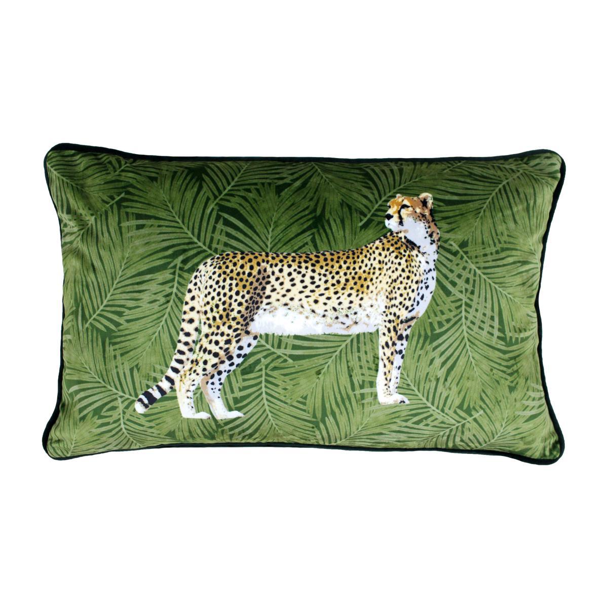 Ideal for adding a modern edge to your décor, this stylish cushion features a cheetah print on a flourishing green botanical background. The plump polyester filling provides added fulness and lasting comfort while relaxing in your home. Crafted from durable heavyweight polyester, the removable cover is machine washable and doesn’t stain easily, making this cushion ideal for homes with young children and pets.