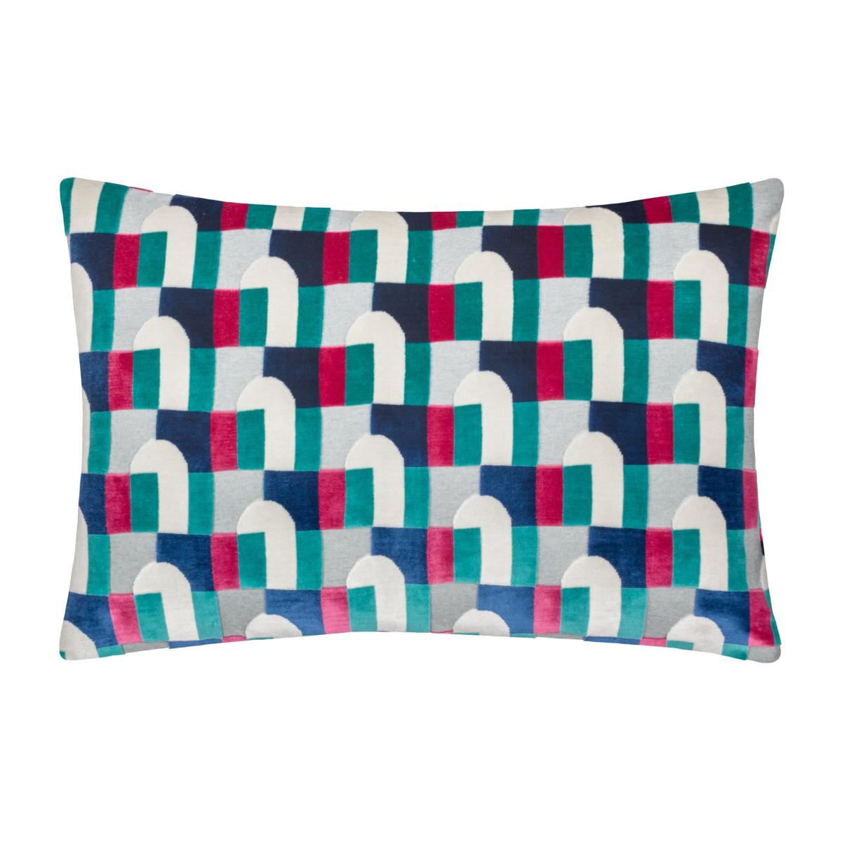 * Geometric cut-velvet design in jewel tones. * Velvet reverse, hidden zip. * 100% polyester fabric. * Zip Fastening* Polyester fibre filling This Paoletti Keela Rectangle Cushion showcases a plush, geometric cut-velvet design in vivid jewel tones. With a soft velvet reverse and standard knife edging, the cushion is made from durable and super soft 100% polyester fabric.