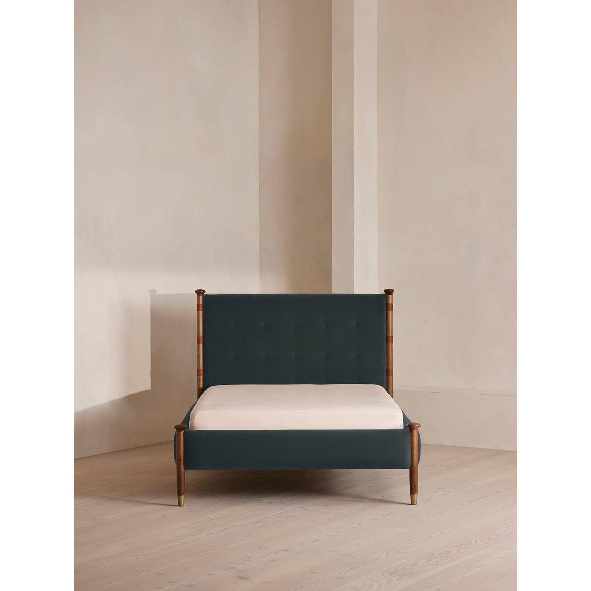 Taking cues from the bedrooms at Soho House Rome, our Paolo bed displays clean lines, accented with upholstered velvet panels to the headboard and sides for rich pops of colour. Solid walnut uprights with brass cap detail add a vintage-inspired touch. Pair with warm tones and soft textiles to make this piece the focal point of your bedroom. Available in a range of sizes Velvet upholstery Leather hide is a natural material and will therefore vary in appearance Solid walnut uprights Stitched panelling with leather straps Antique brass foot caps Pair with our Hypnos Woolsleeper Pillow Top Mattress Inspired by Soho House Rome Please note: leather is a natural material, so expect to see wrinkles, veining, colour and grain variation, all of which contribute to the beauty of the hide.