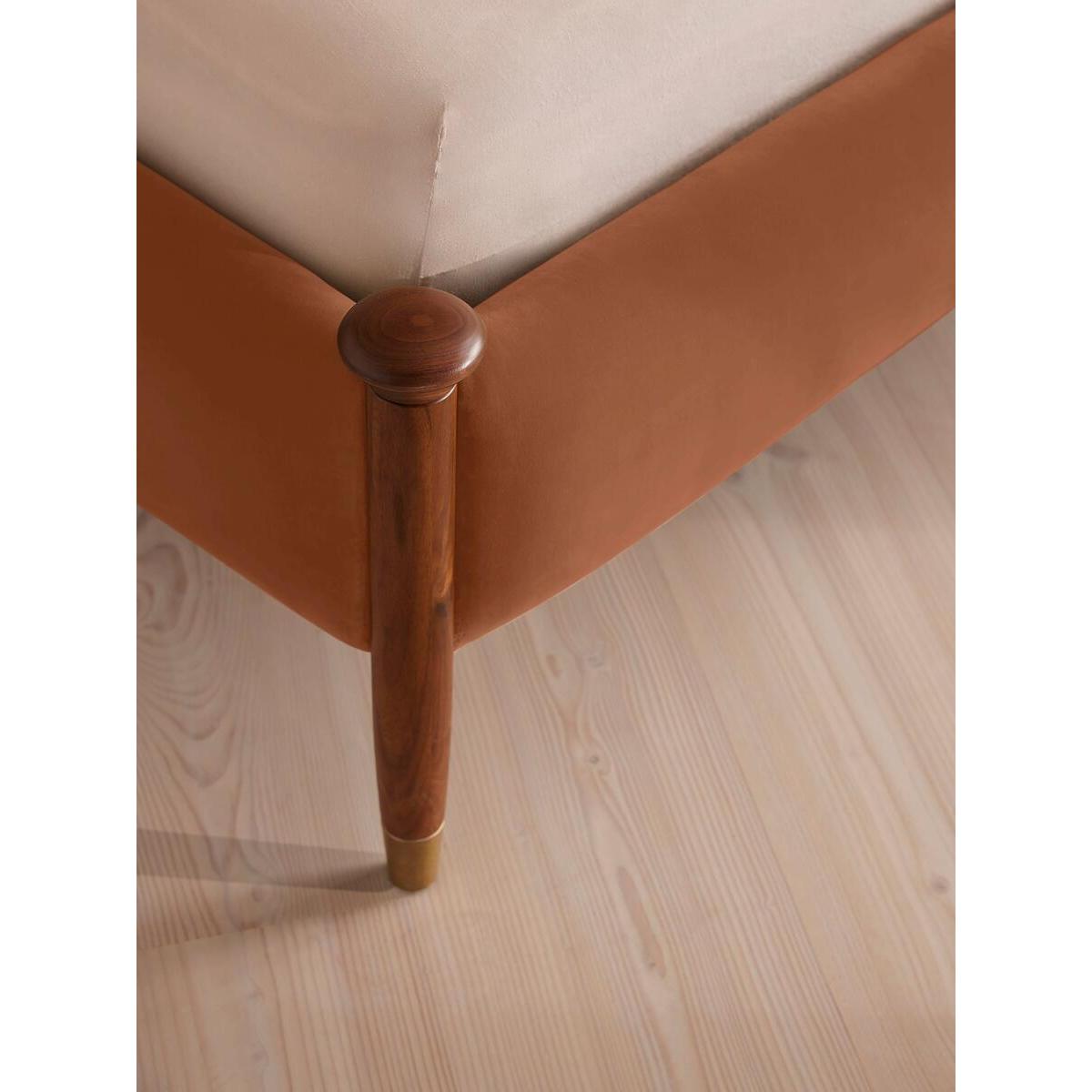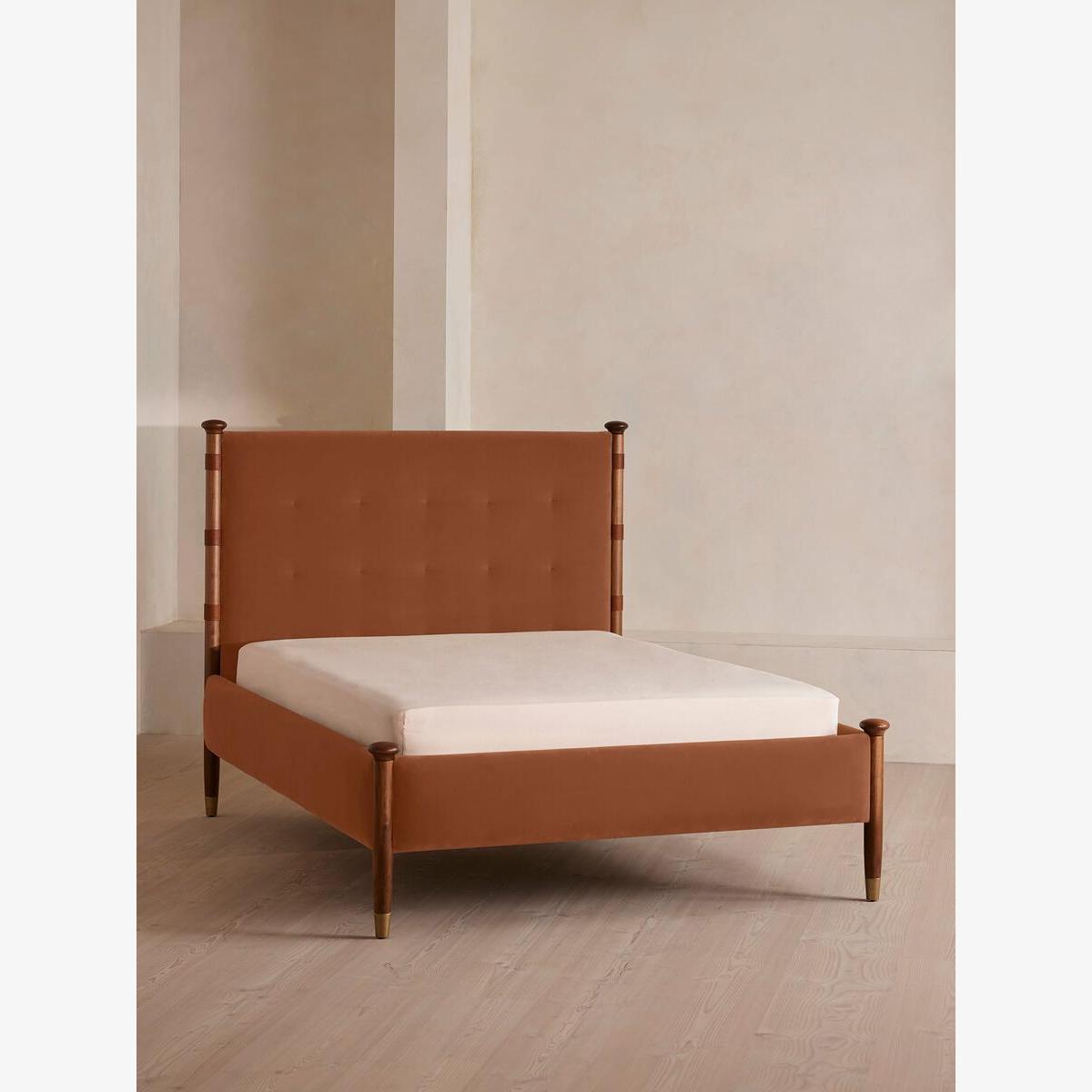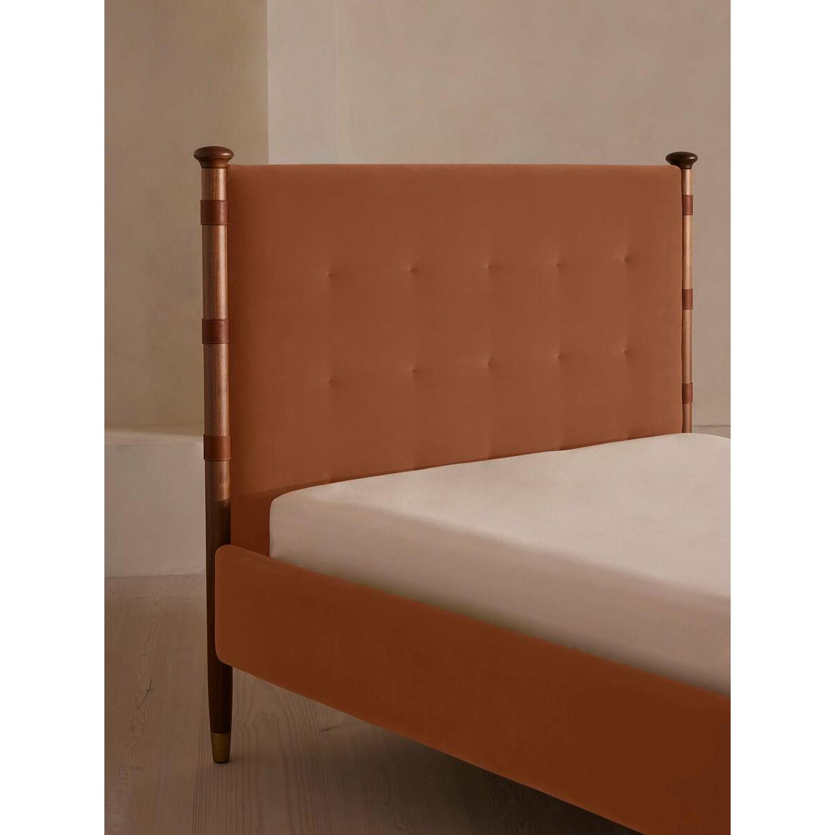 Taking cues from the bedrooms at Soho House Rome, our Paolo bed displays clean lines, accented with upholstered velvet panels to the headboard and sides for rich pops of colour. Solid walnut uprights with brass cap detail add a vintage-inspired touch. Pair with warm tones and soft textiles to make this piece the focal point of your bedroom. Available in a range of sizes Velvet upholstery Leather hide is a natural material and will therefore vary in appearance Solid walnut uprights Stitched panelling with leather straps Antique brass foot caps Pair with our Hypnos Woolsleeper Pillow Top Mattress Inspired by Soho House Rome Please note: leather is a natural material, so expect to see wrinkles, veining, colour and grain variation, all of which contribute to the beauty of the hide.