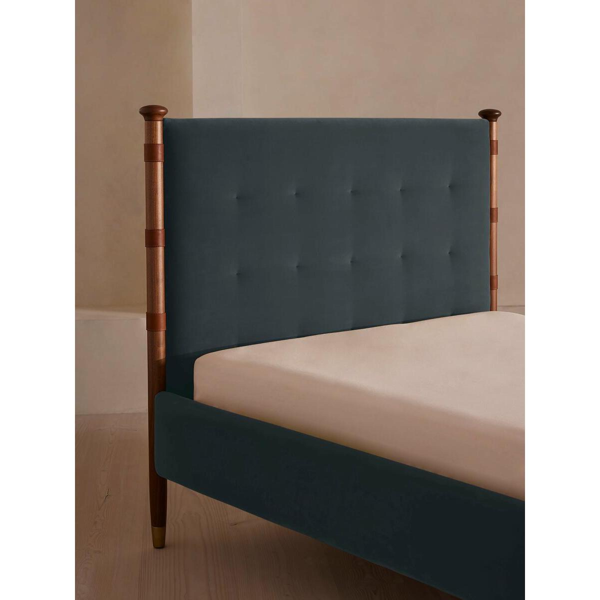 Taking cues from the bedrooms at Soho House Rome, our Paolo bed displays clean lines, accented with upholstered velvet panels to the headboard and sides for rich pops of colour. Solid walnut uprights with brass cap detail add a vintage-inspired touch. Pair with warm tones and soft textiles to make this piece the focal point of your bedroom. Available in a range of sizes Velvet upholstery Leather hide is a natural material and will therefore vary in appearance Solid walnut uprights Stitched panelling with leather straps Antique brass foot caps Pair with our Hypnos Woolsleeper Pillow Top Mattress Inspired by Soho House Rome Please note: leather is a natural material, so expect to see wrinkles, veining, colour and grain variation, all of which contribute to the beauty of the hide.