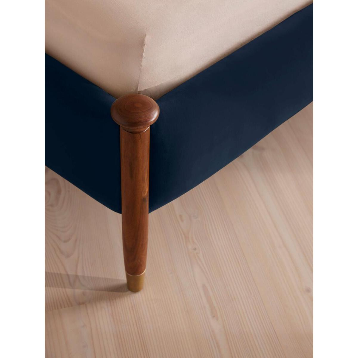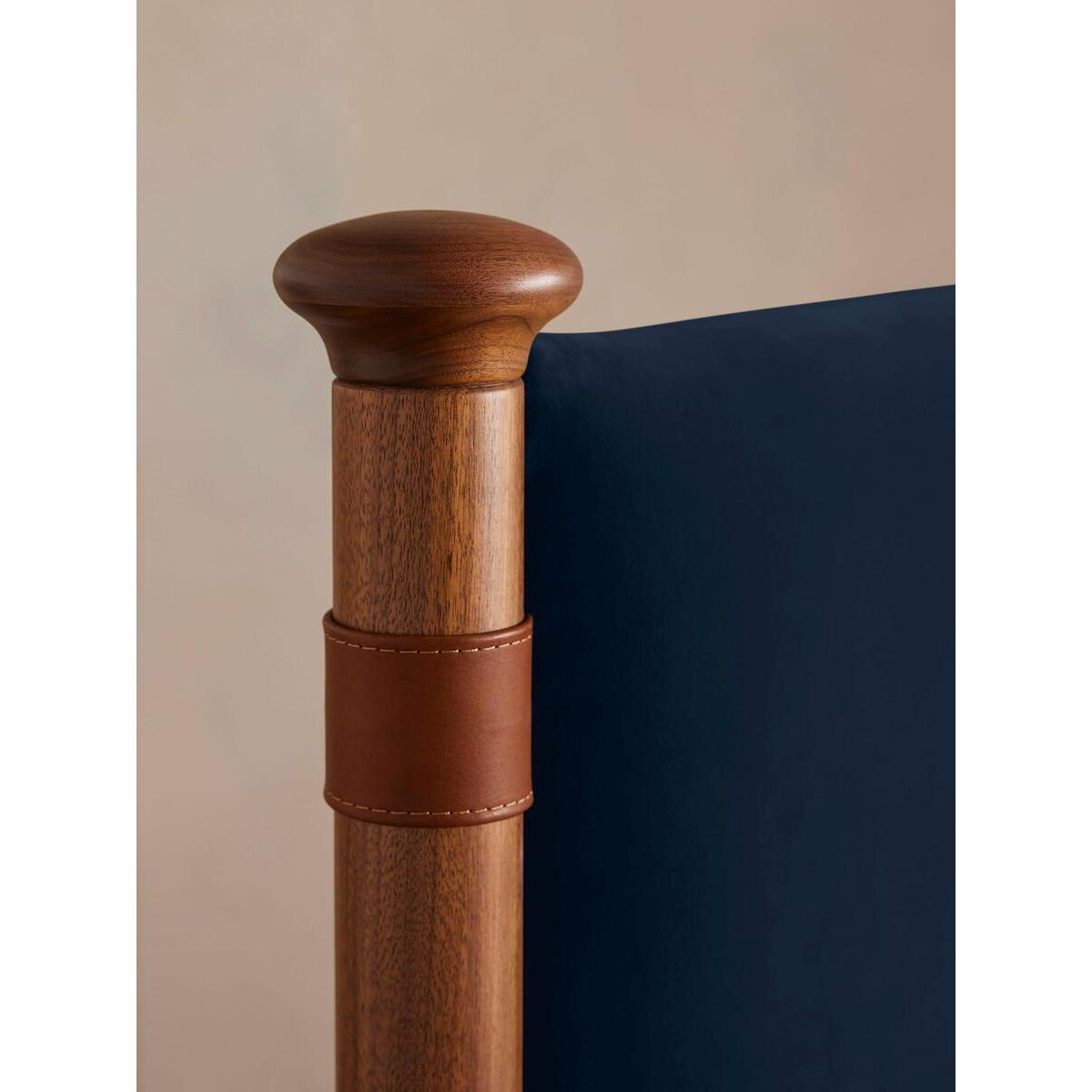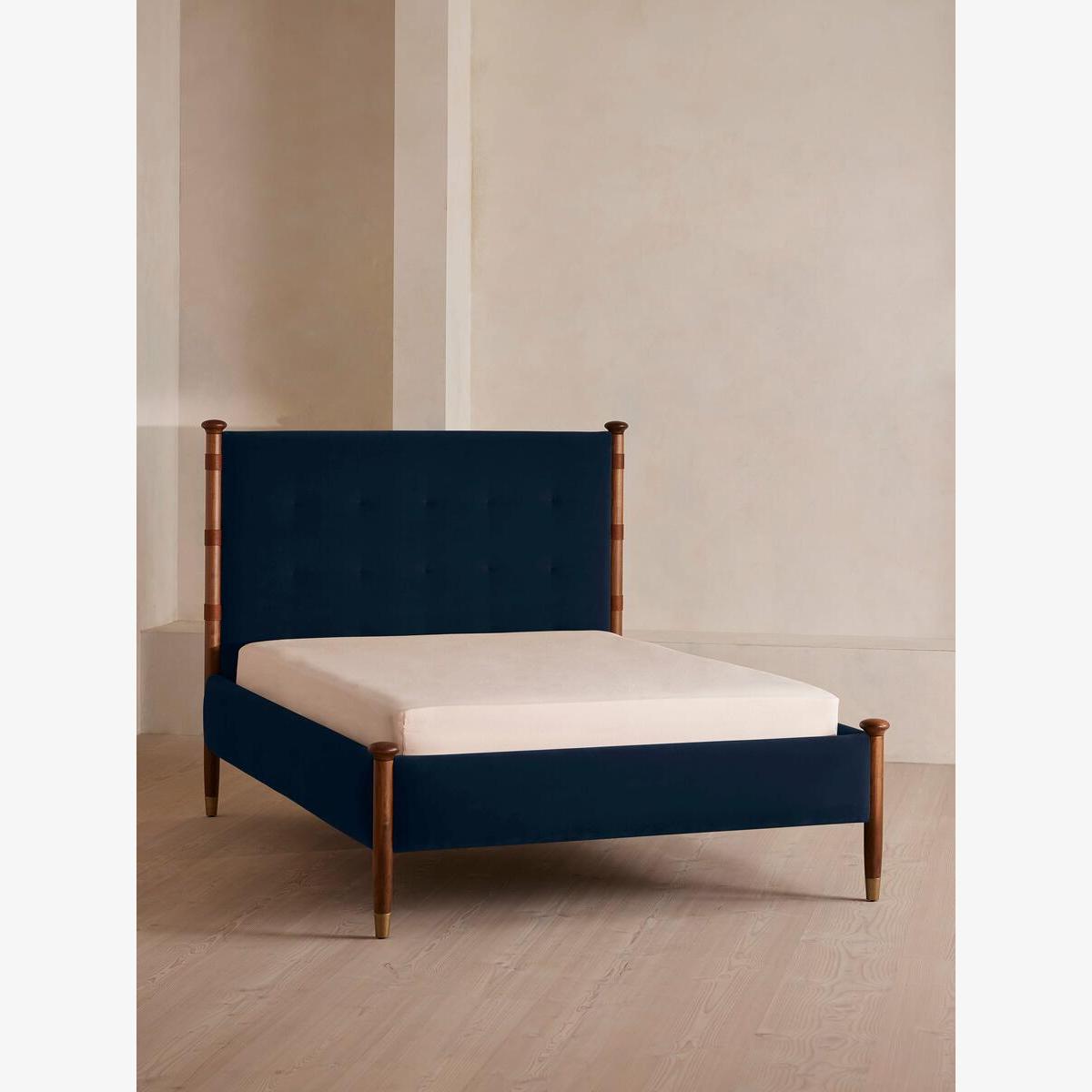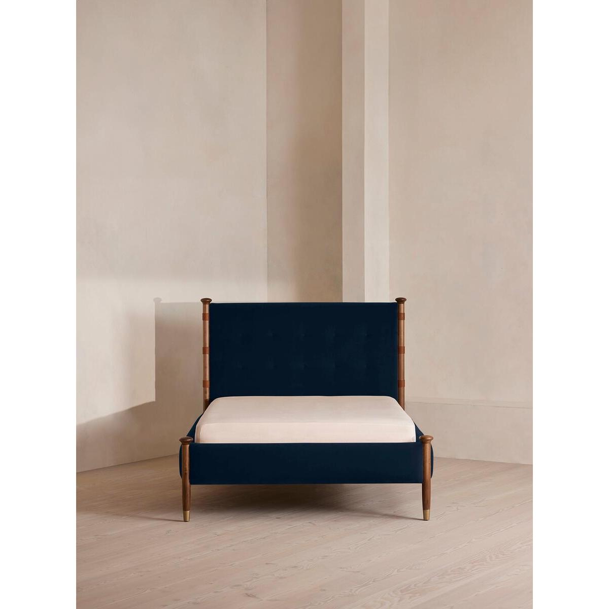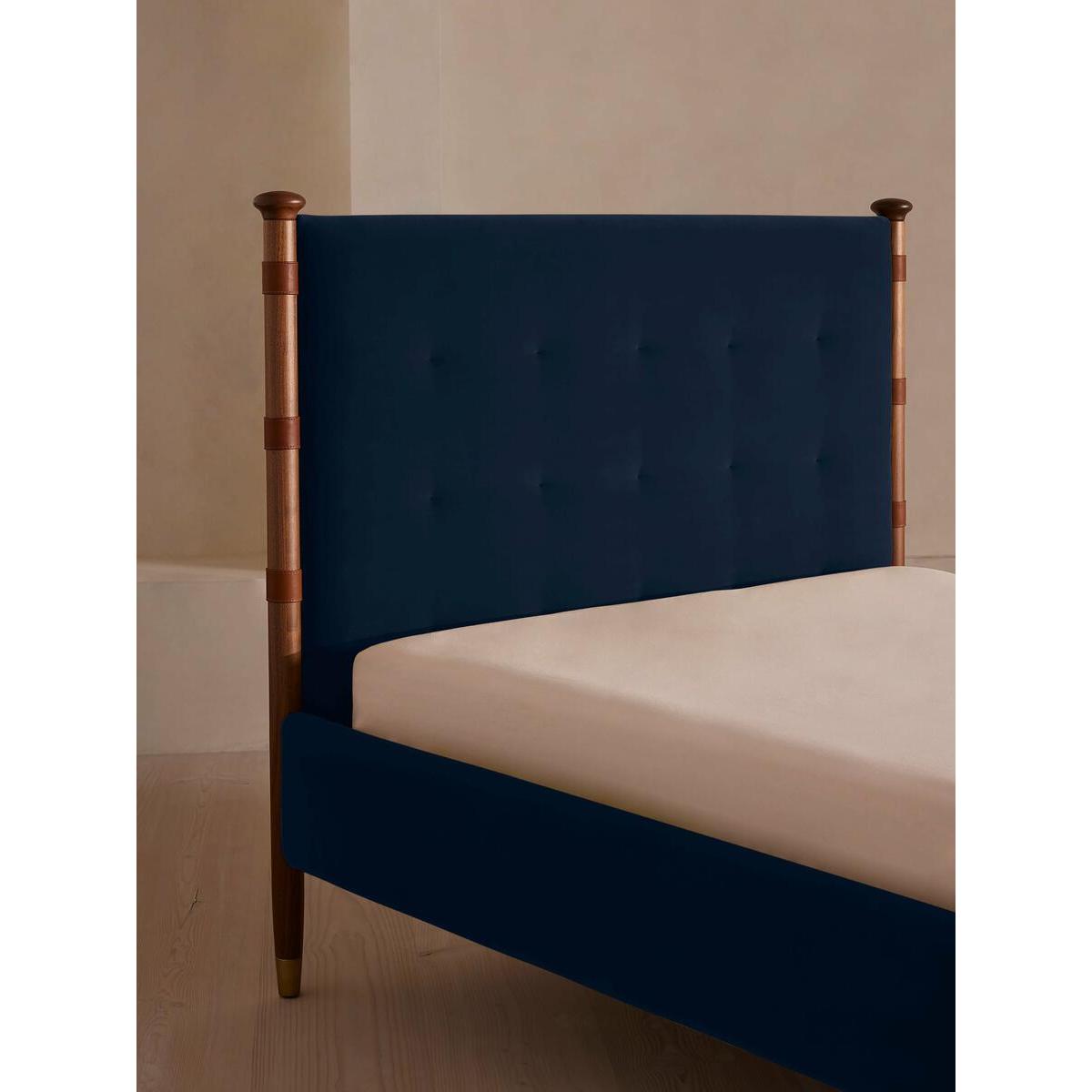 Taking cues from the bedrooms at Soho House Rome, our Paolo bed displays clean lines, accented with upholstered velvet panels to the headboard and sides for rich pops of colour. Solid walnut uprights with brass cap detail add a vintage-inspired touch. Pair with warm tones and soft textiles to make this piece the focal point of your bedroom. Available in a range of sizes Velvet upholstery Leather hide is a natural material and will therefore vary in appearance Solid walnut uprights Stitched panelling with leather straps Antique brass foot caps Pair with our Hypnos Woolsleeper Pillow Top Mattress Inspired by Soho House Rome Please note: leather is a natural material, so expect to see wrinkles, veining, colour and grain variation, all of which contribute to the beauty of the hide.
