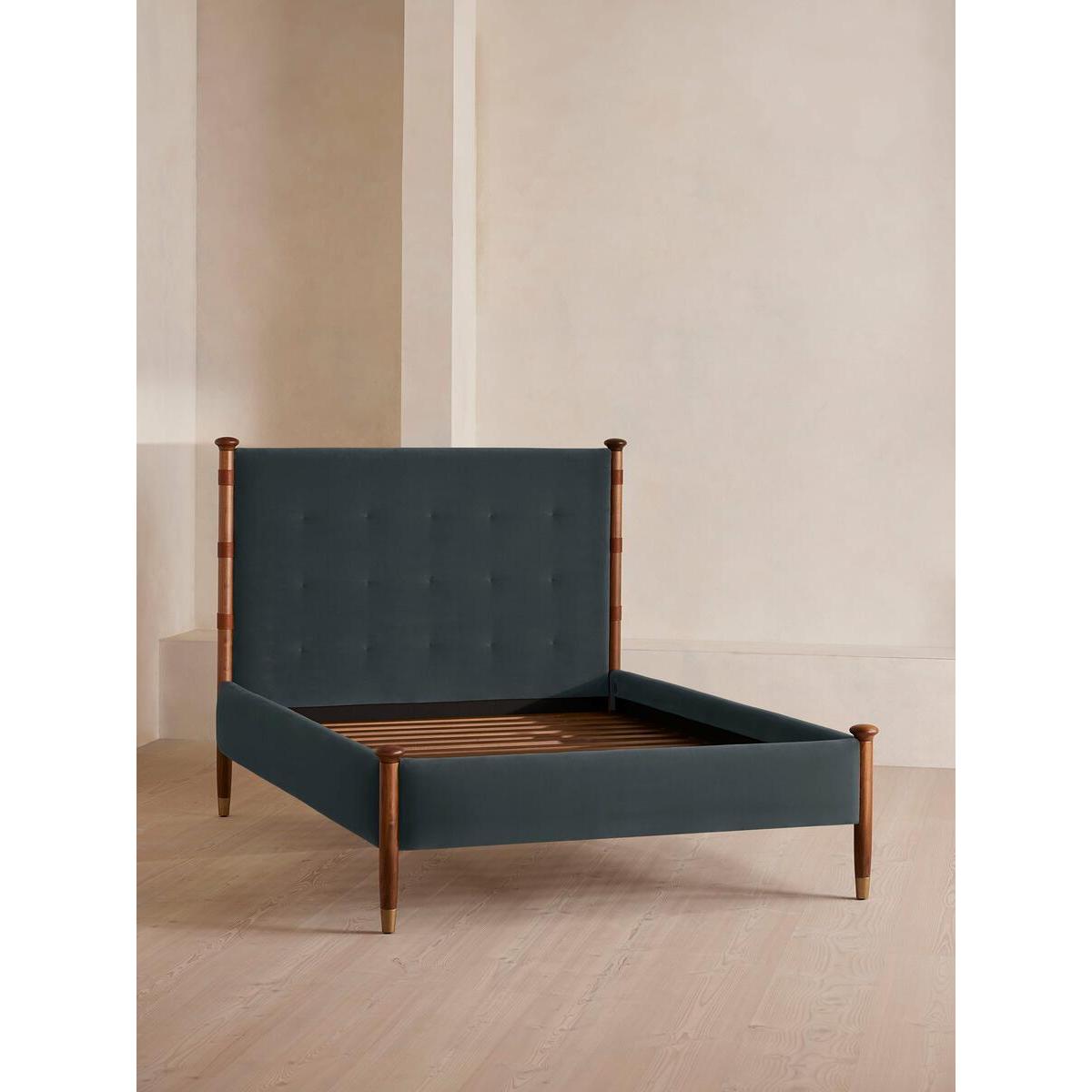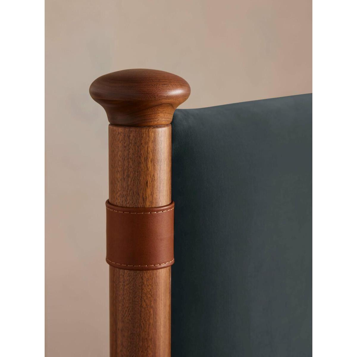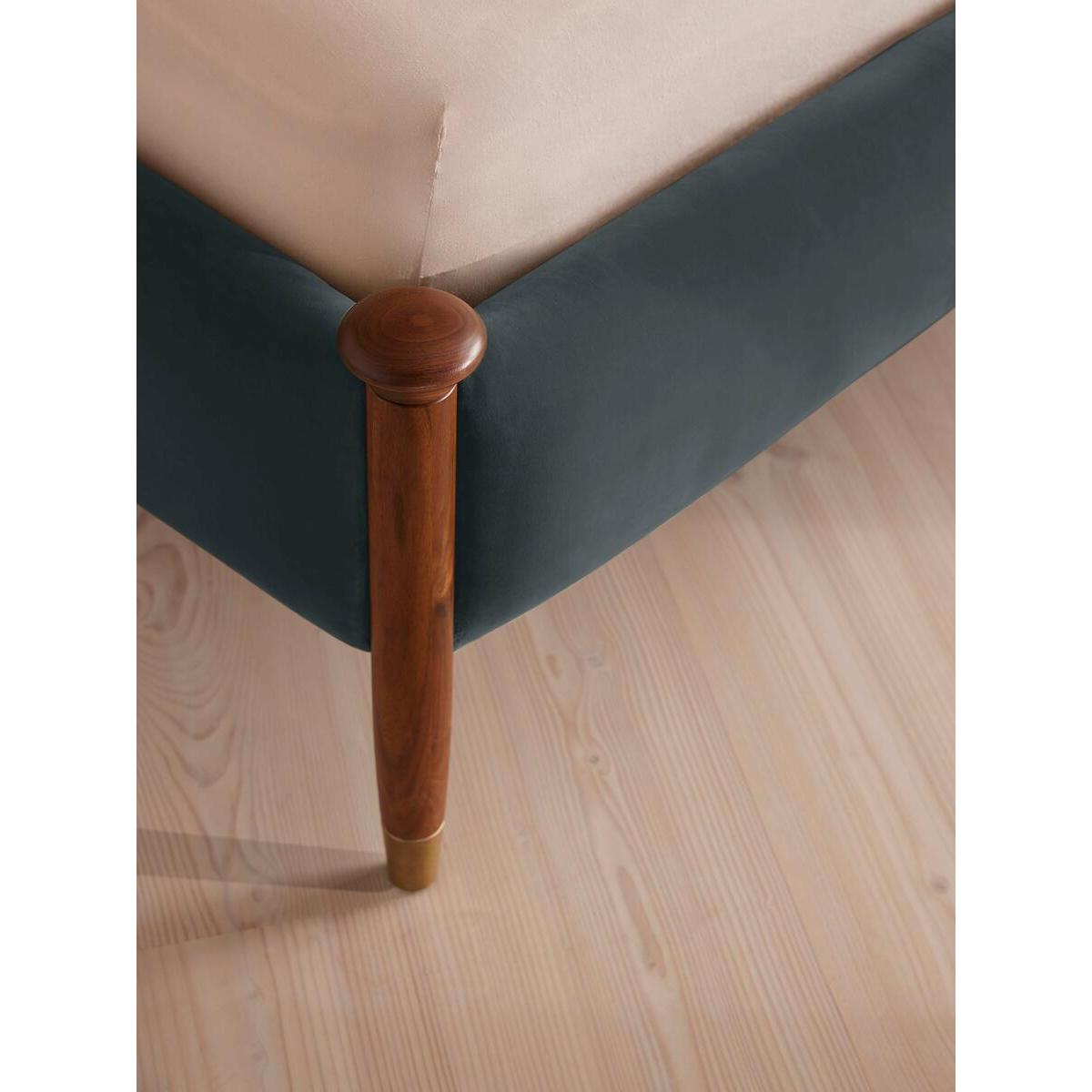 Taking cues from the bedrooms at Soho House Rome, our Paolo bed displays clean lines, accented with upholstered velvet panels to the headboard and sides for rich pops of colour. Solid walnut uprights with brass cap detail add a vintage-inspired touch. Pair with warm tones and soft textiles to make this piece the focal point of your bedroom. Available in a range of sizes Velvet upholstery Leather hide is a natural material and will therefore vary in appearance Solid walnut uprights Stitched panelling with leather straps Antique brass foot caps Pair with our Hypnos Woolsleeper Pillow Top Mattress Inspired by Soho House Rome Please note: leather is a natural material, so expect to see wrinkles, veining, colour and grain variation, all of which contribute to the beauty of the hide.