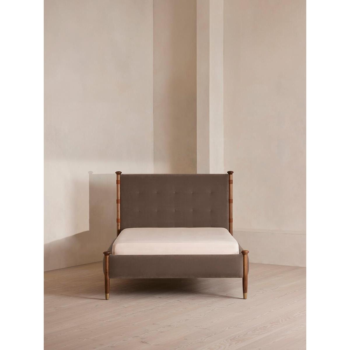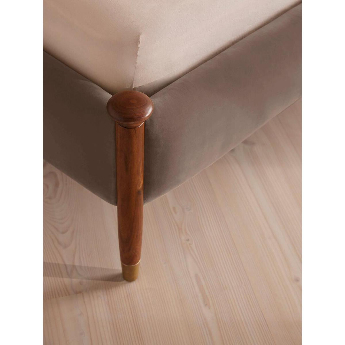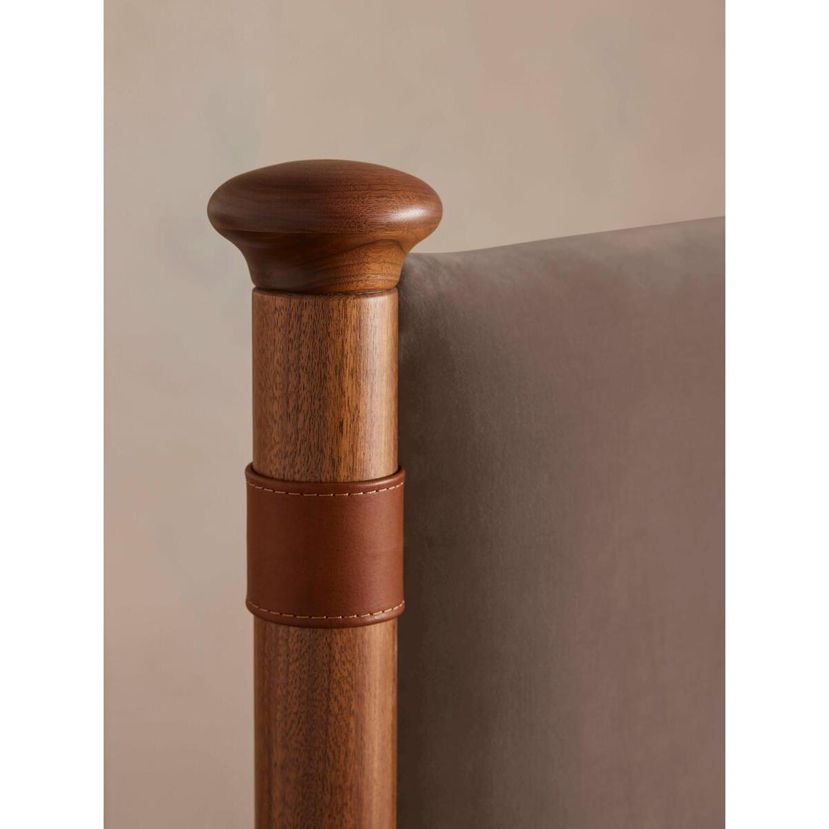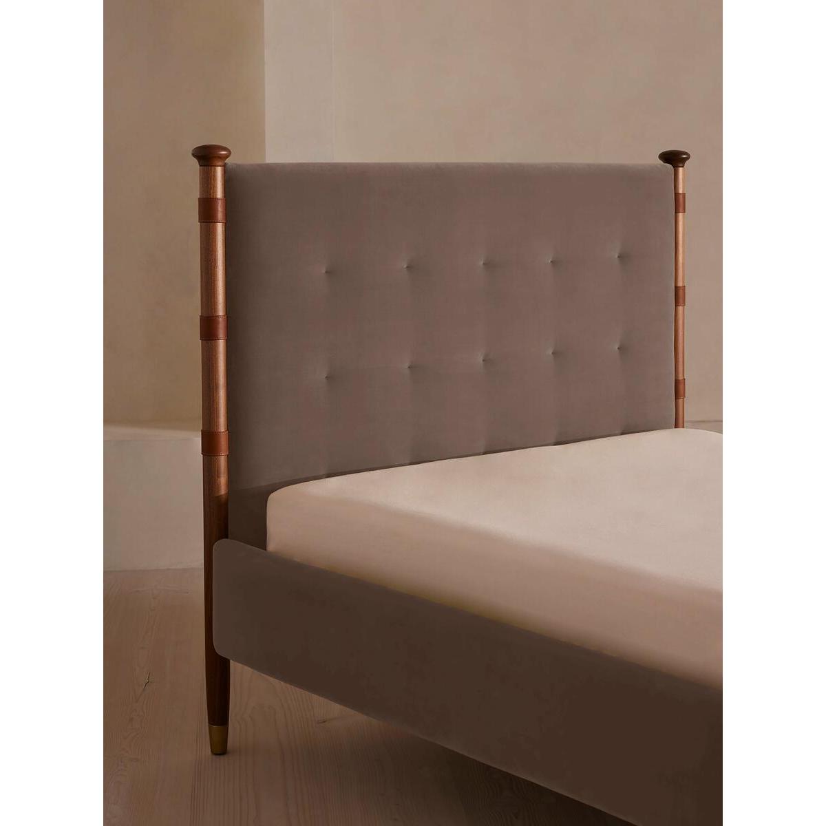 Taking cues from the bedrooms at Soho House Rome, our Paolo bed displays clean lines, accented with upholstered velvet panels to the headboard and sides for rich pops of colour. Solid walnut uprights with brass cap detail add a vintage-inspired touch. Pair with warm tones and soft textiles to make this piece the focal point of your bedroom. Available in a range of sizes Velvet upholstery Leather hide is a natural material and will therefore vary in appearance Solid walnut uprights Stitched panelling with leather straps Antique brass foot caps Pair with our Hypnos Woolsleeper Pillow Top Mattress Inspired by Soho House Rome Please note: leather is a natural material, so expect to see wrinkles, veining, colour and grain variation, all of which contribute to the beauty of the hide.