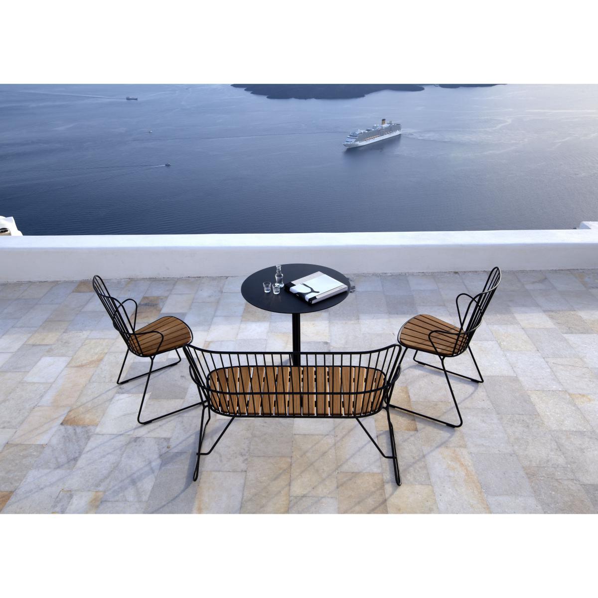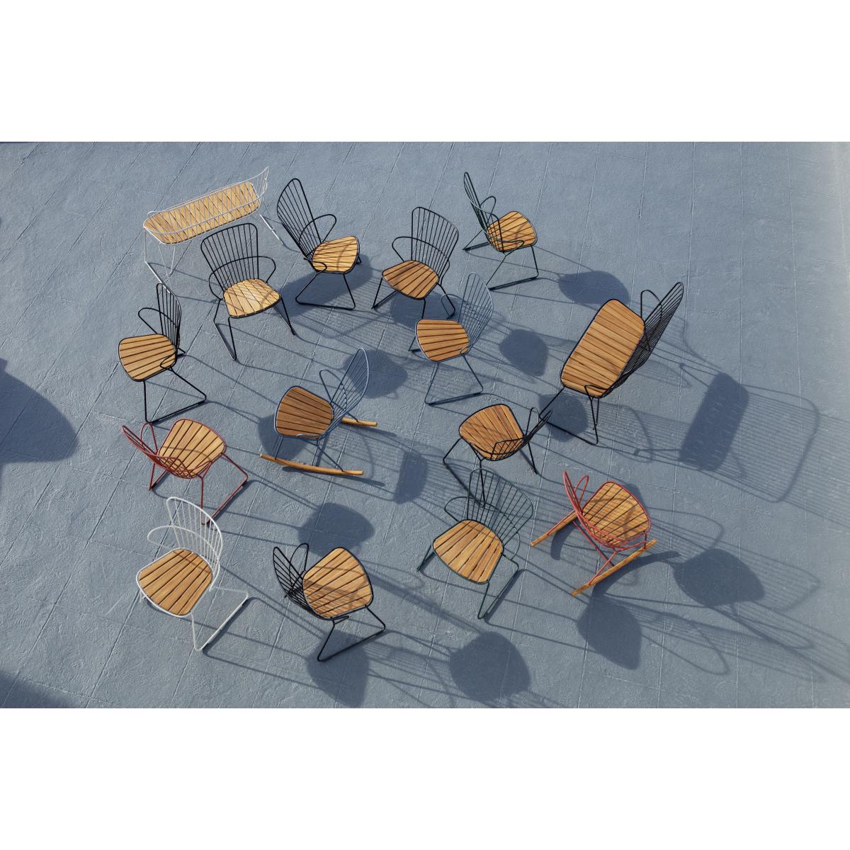 Created by Danish designer Henrik Pedersen, the Paon collection stands out for its graphic design and incredible visual lightness. Very durable, Paon seats can be used indoors or out. They stand out for their high backrests, which are both enveloping and comfortable. This high backrest made of vertical spindles is a modern evocation of the traditional Windsor armchair. The vertical spindles are crossed by the horizontal line of the armrests: this graphic sign confirms the identity of the collection. Paon uses a beautiful combination of materials: a very fine metal structure associated with a seat made of natural bamboo slats, a robust and warm material. The Paon collection is perfect for creating a modern outdoor lounge with Scandinavian accents, or a nice dining area, on a terrace or in a kitchen.