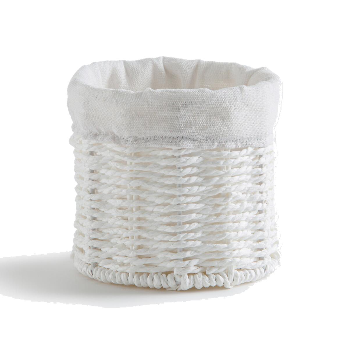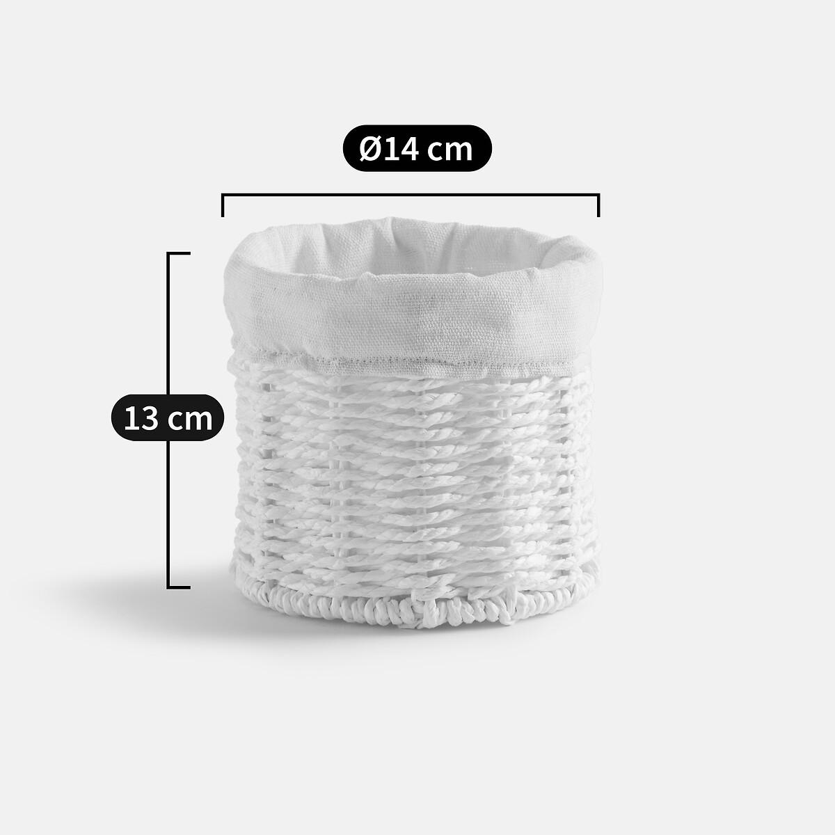 Keep all your belongings within easy reach with the Papeli round basket in woven paper rope and fabric. Beautiful and practical, it can be used to store make-up products, chargers or small office supplies. Product Details • In woven paper • Interior in 100% polycotton fabric • Round shape. Dimensions • Diameter: 14cm • Height: 13cm