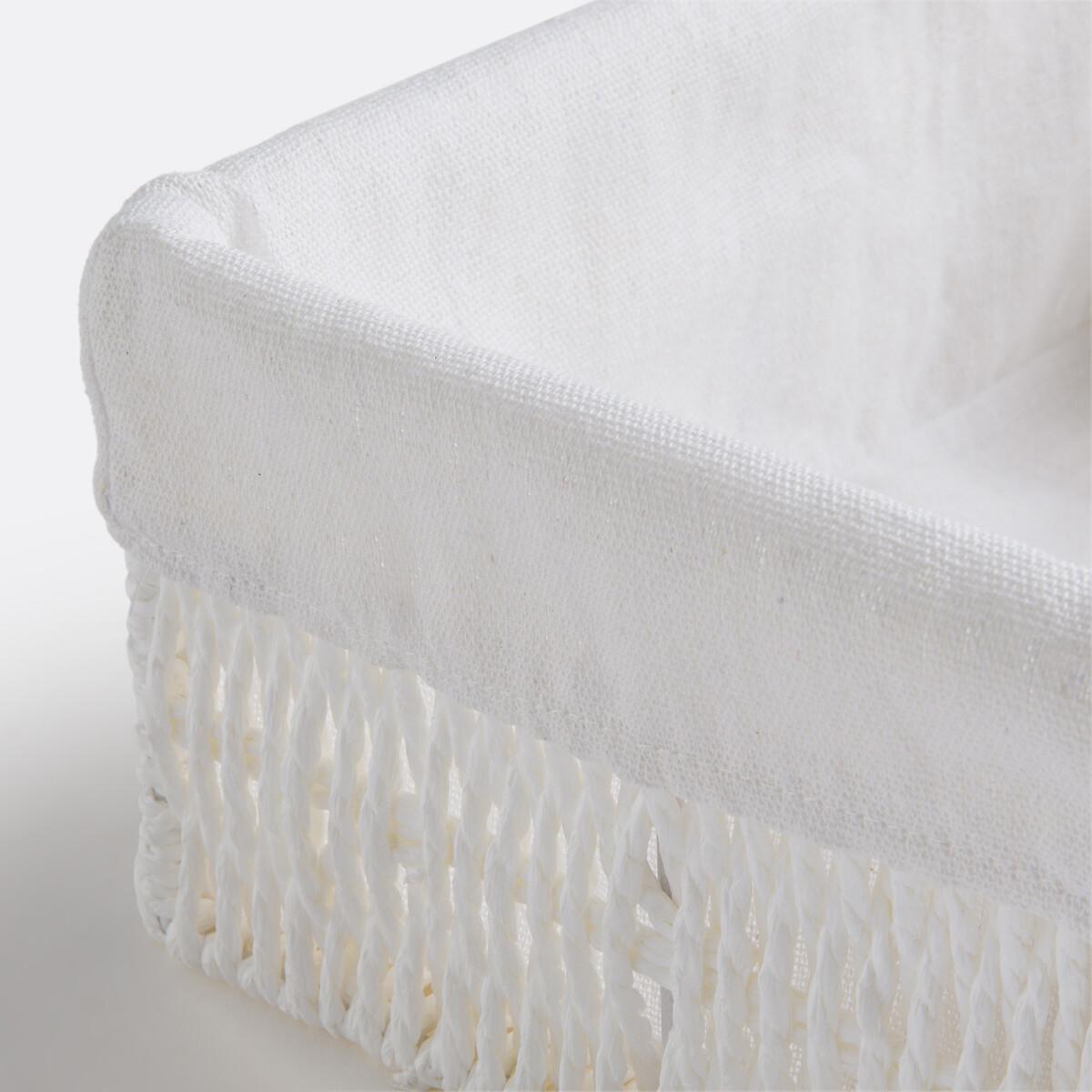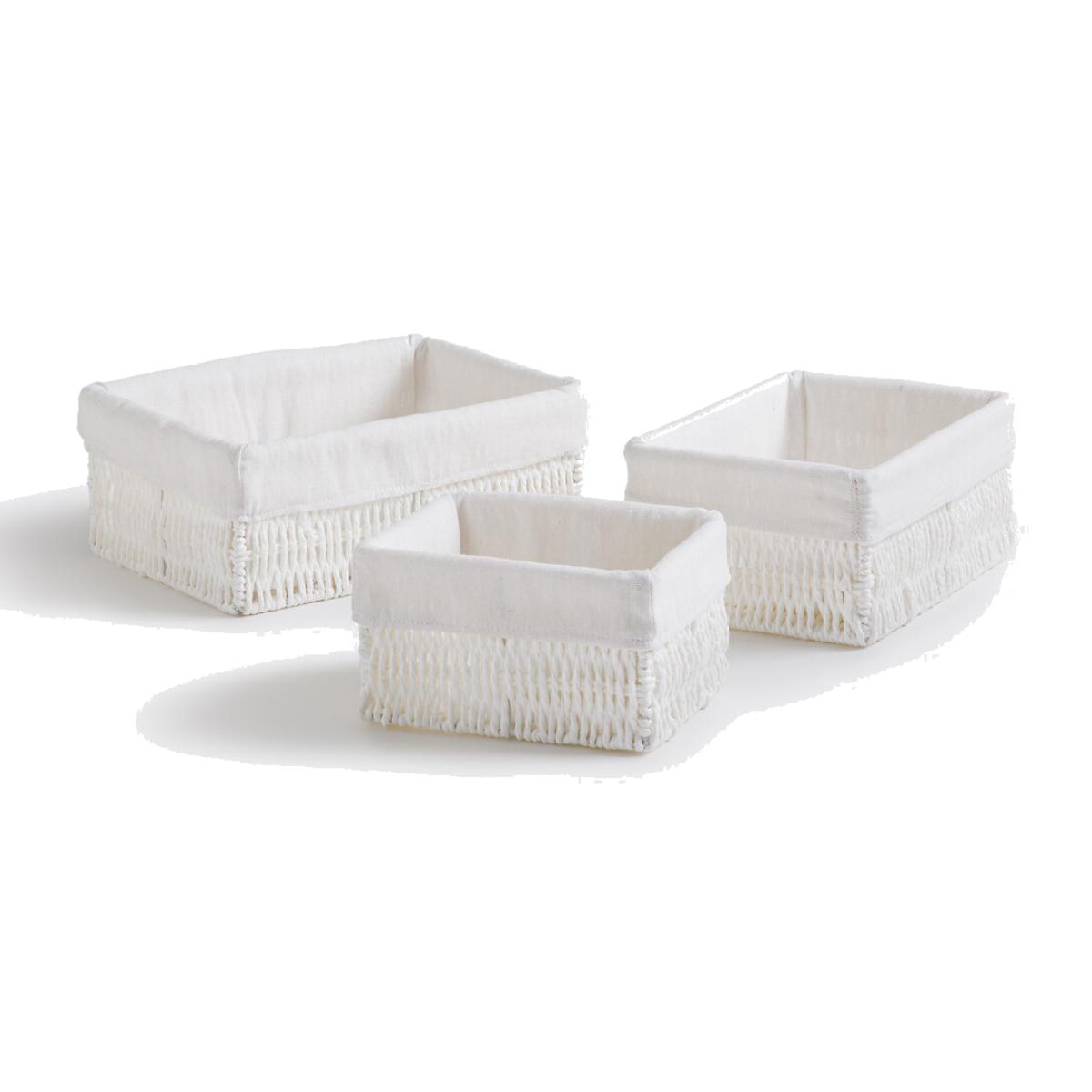 Keep all your belongings within easy reach with the 3 Papeli rectangular baskets made from woven paper and fabric. Beautiful and practical, they can be used to keep every room in the house tidy, whether it is the hallway, bathroom or office. Product Details • In woven paper • Interior in 100% polycotton fabric • Rectangular shapeDimensions. Size 1 • Width: 19.5cm • Height: 11cm • Length: 28cm. Size 2 • Width: 17cm • Height: 11cm • Length: 24cm. Size 3 • Width: 14cm • Height: 11cm • Length: 18cm