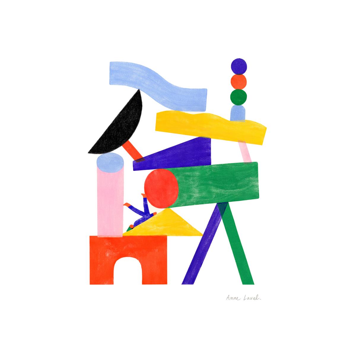 Jouer poster from Paper Collective, designed by Anne Laval, plays with colour and form to depict imagination and creativity. A solitary figure sits among building blocks which transform into a dreamlike landscape, created with gouache and pastel. Printed on 100% paper, the poster becomes an expressive addition to the wall, either on its own or as part of a gallery wall.