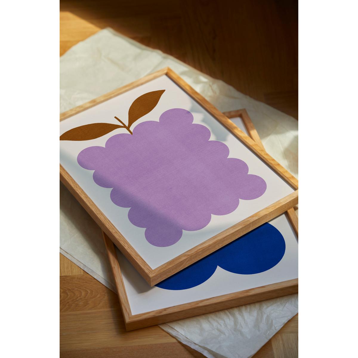 I love this lilac berry print for its bold yet simple aesthetic. It works really well in modern, minimalist interiors where a pop of colour is needed without overwhelming the space. It also pairs nicely with warm earthy tones or cool greys, making it quite versatile. For styling, try placing it above a neutral sofa or bed to act as a focal point, or group it with other smaller artworks in a gallery wall for a curated look. Framing it in a slim black or natural wood frame can help it feel more polished, and pairing it with soft textiles or plants can soften its graphic shape for a balanced finish.