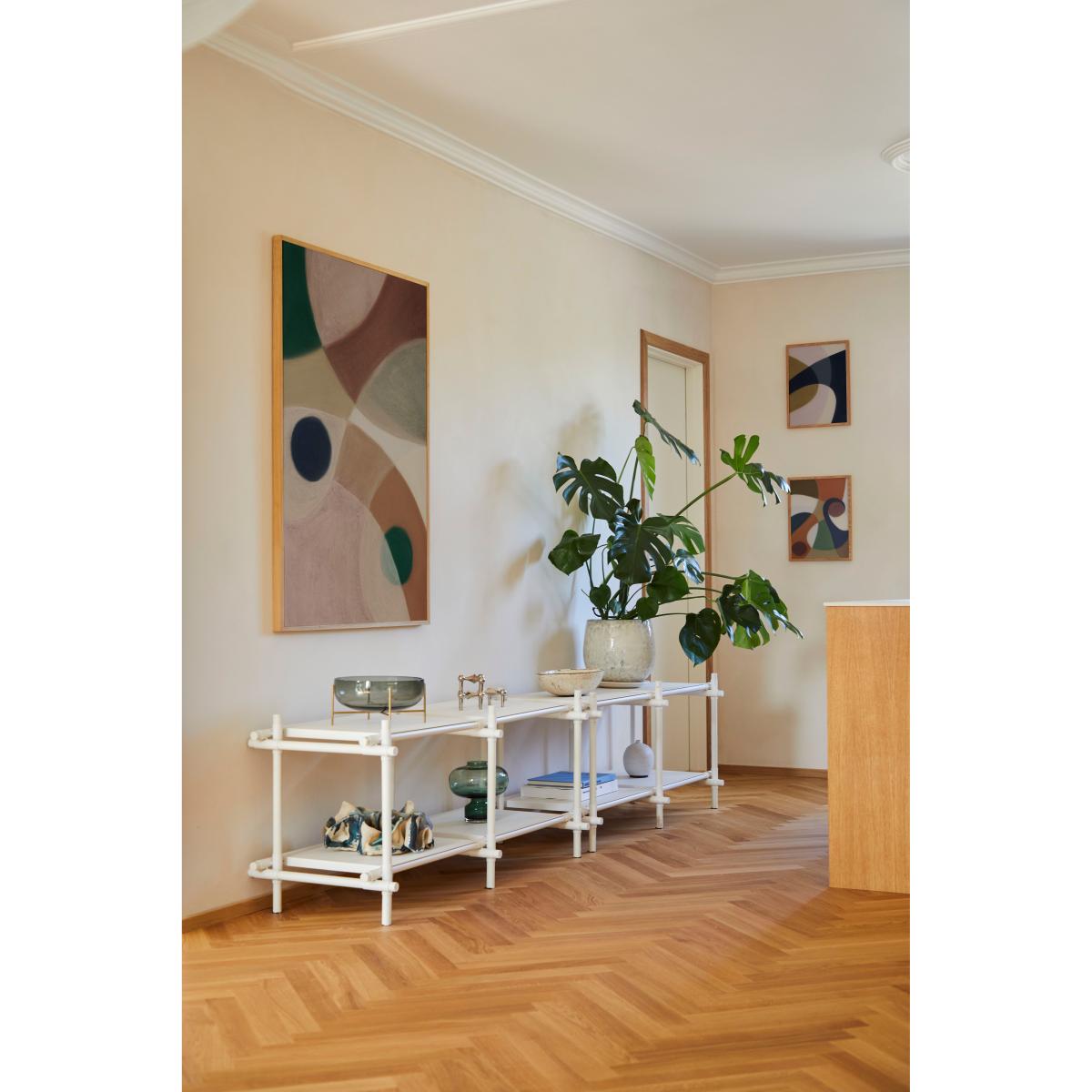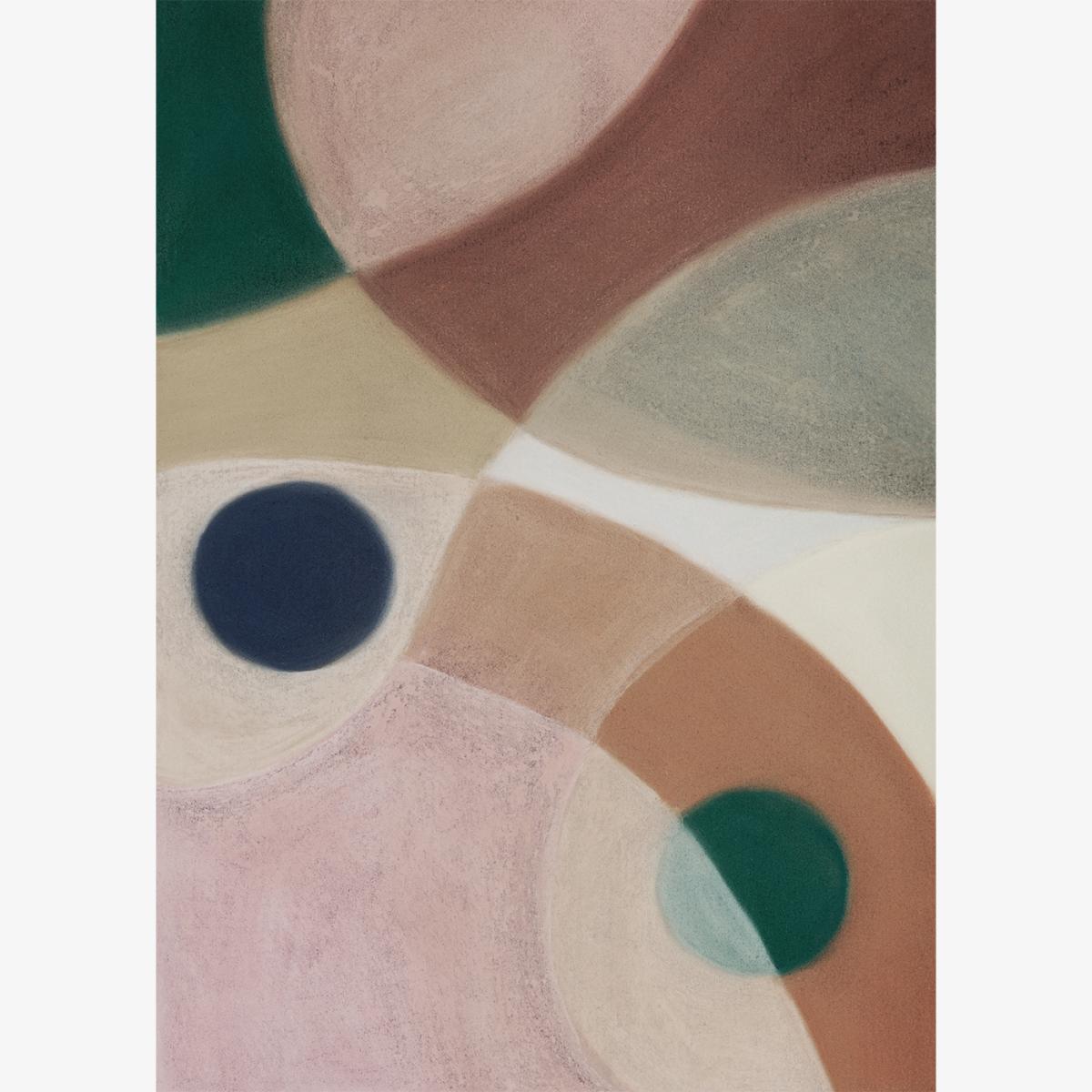 I love this piece because its abstract shapes and muted tones make it versatile for a variety of interiors. It works particularly well in minimalist or modern spaces, adding a gentle touch of colour without feeling overpowering. For styling, consider placing it above a simple sideboard or in a cluster with other framed artworks at eye level for a relaxed, curated look. To really make it stand out, pair it with natural materials like wood or soft textiles to create a warm, inviting atmosphere. Its modest size makes it ideal for smaller walls, or as part of a gallery wall, giving your space a subtle yet refined focal point.