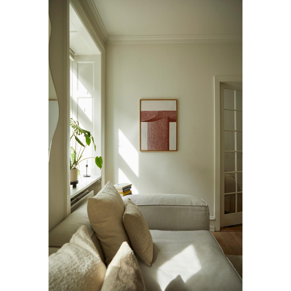 I really like this poster because of its minimalist yet striking design, making it versatile for a variety of interiors. It works particularly well in contemporary, Scandinavian, or pared-back spaces where its subtle colour palette can stand out without overwhelming. For styling, consider grouping it with other monochrome or textured artworks for a curated look, or let it shine solo above a simple sideboard or bed. Practical tips include framing it in a slim, black or neutral frame to emphasise its modern aesthetic and ensure it pairs well with different colour schemes. Overall, this piece adds an understated touch of artfulness that’s easy to incorporate into many rooms.