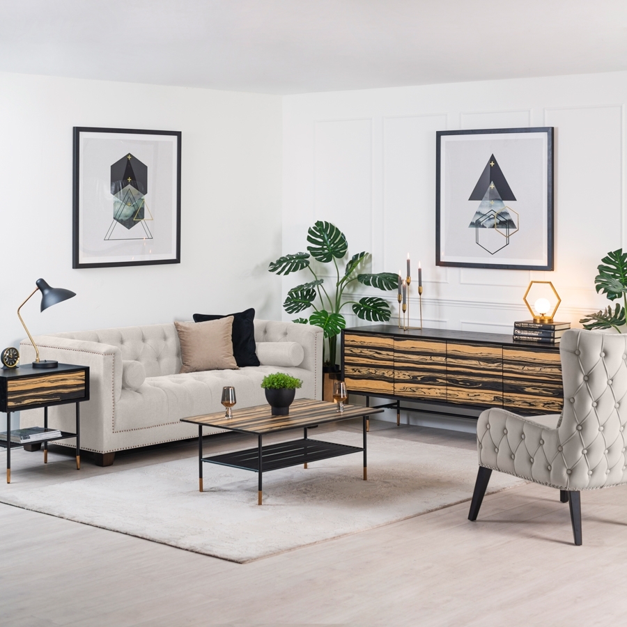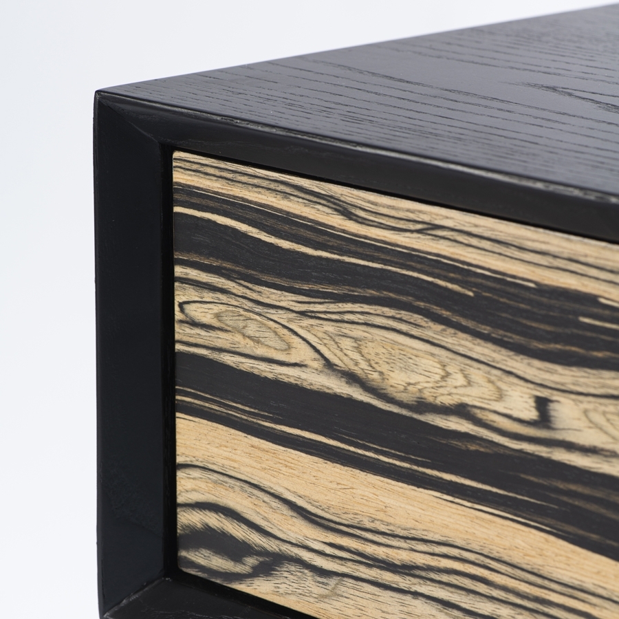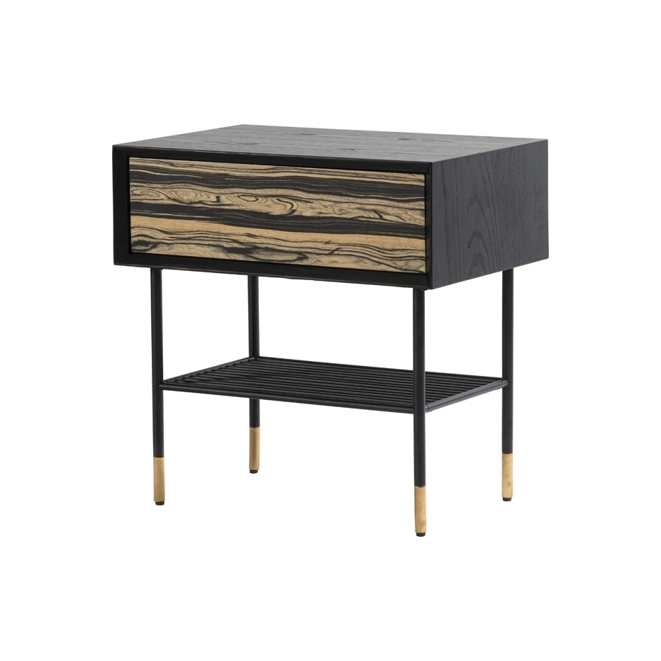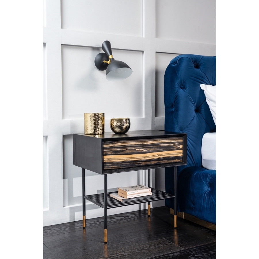 Sleek side table inspired by highly collectable 1960's bespoke American furniture Design to be used as both a bedside table and side table Drawer front finished in Macassar Ebony veneer, providing a beautiful, natural decorative element - every piece is unique and has its own individual character Exterior crafted from solid ash and ash veneer with matt black finish Distinctive mitred profile neatly frames the Macassar Ebony drawer front Push catch drawer opening Steel base with matt black finish and brushed brass feet Useful shelf for storing and displaying books Simple assembly of base required