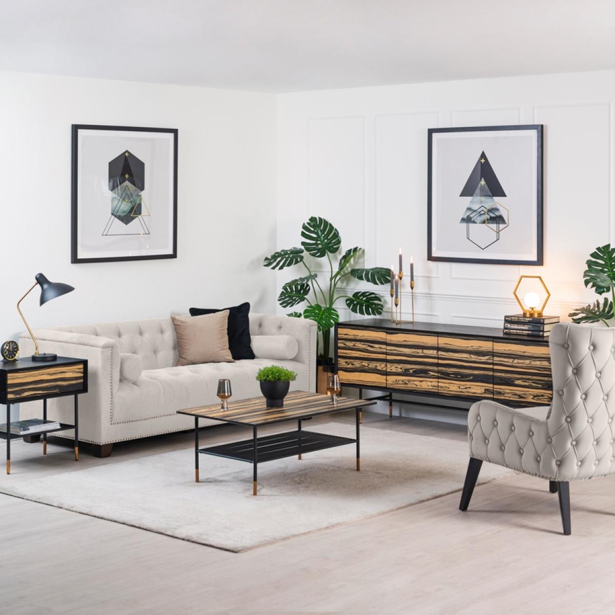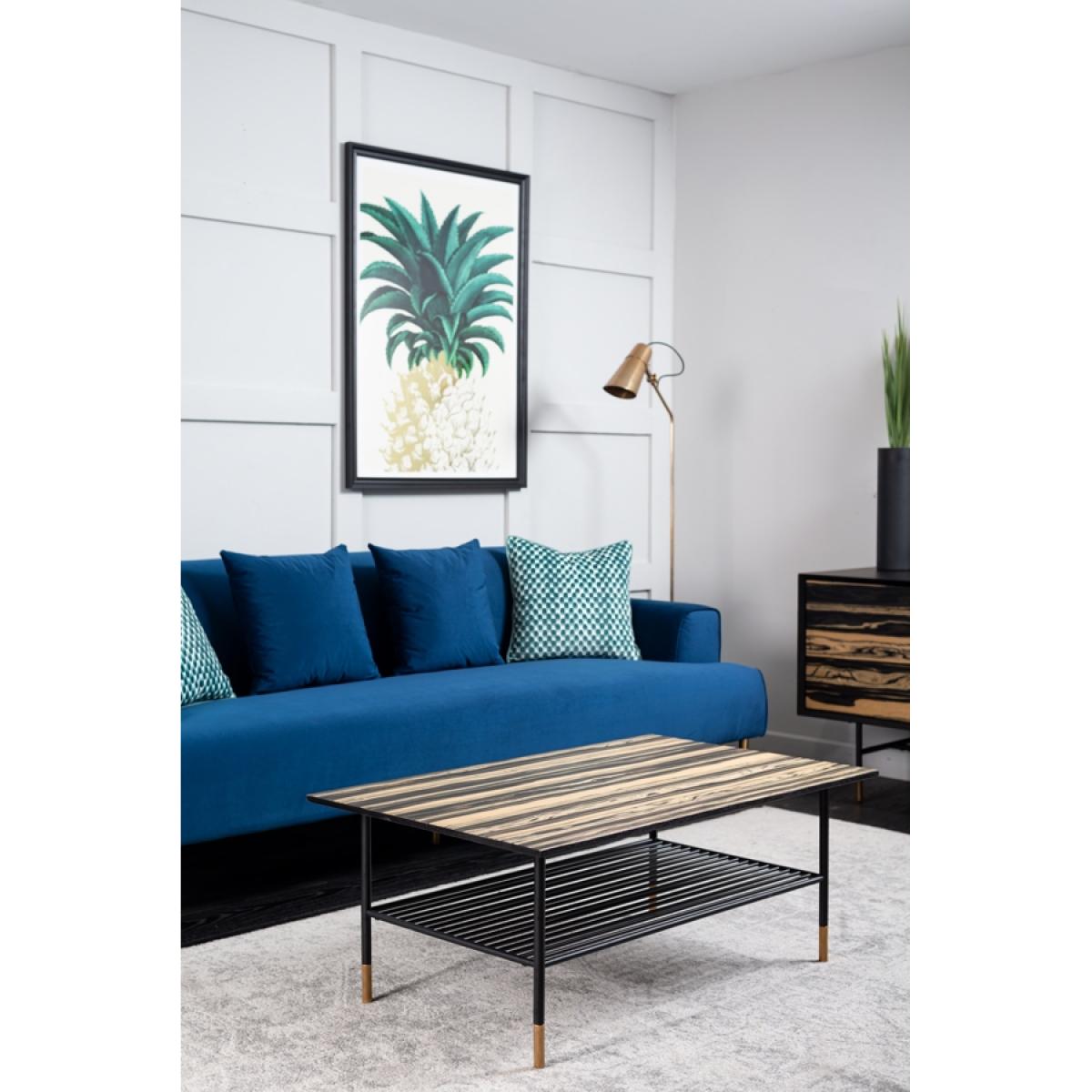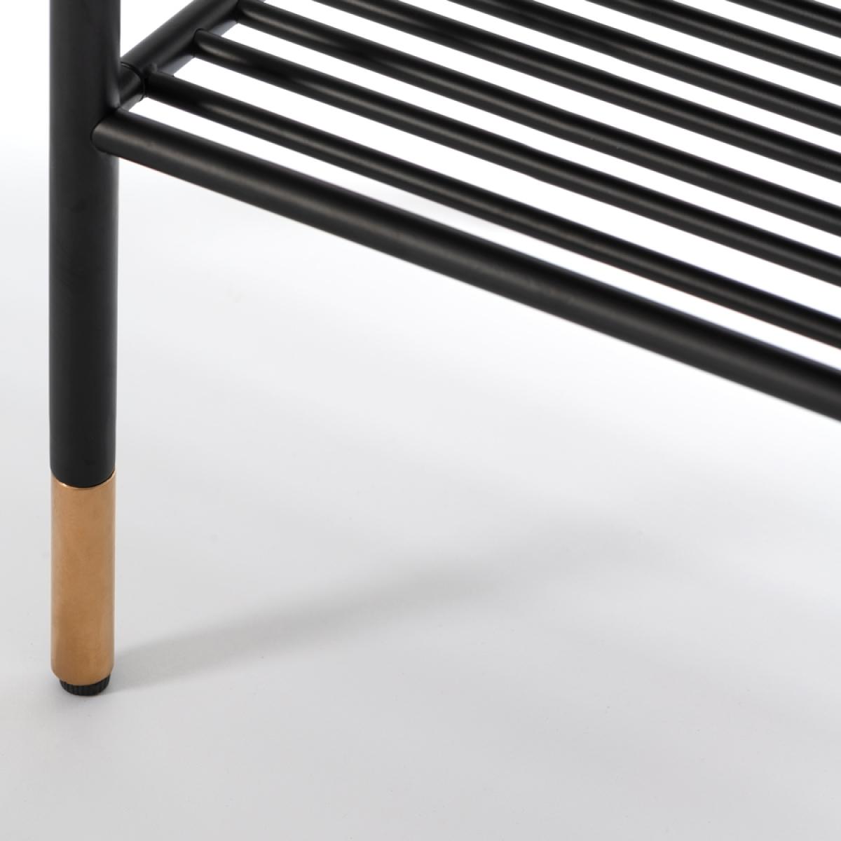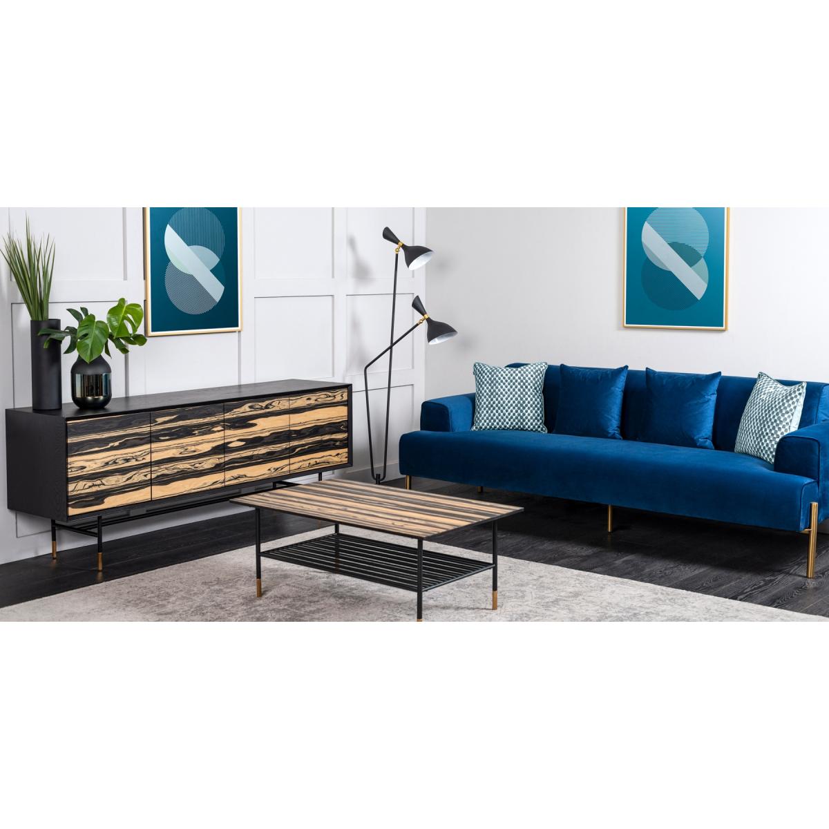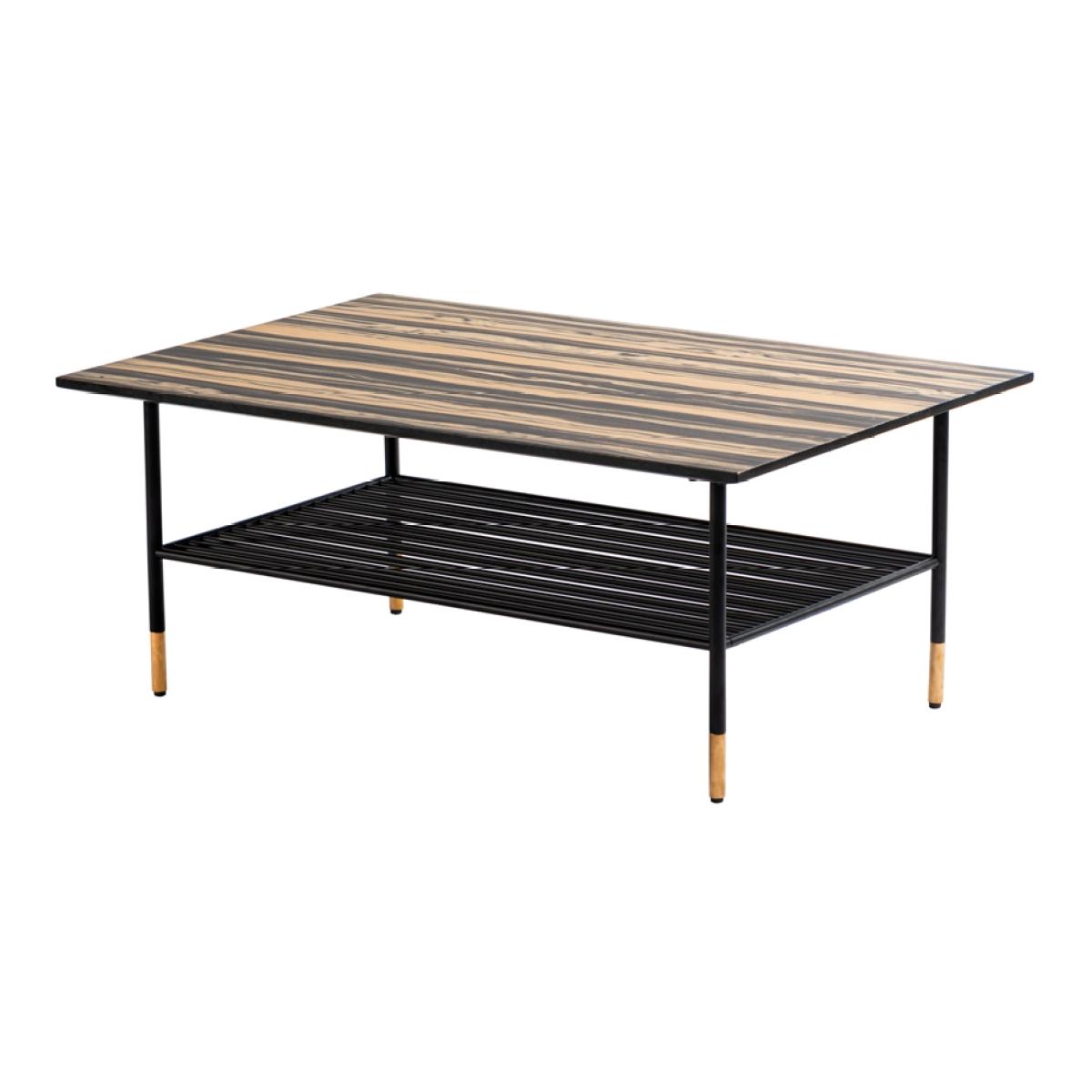 Sleek coffee table inspired by highly collectable 1960’s bespoke American furniture. Top finished in Macassar Ebony veneer, providing a beautiful, natural decorative element - every piece is unique and has its own individual character. Steel base with matt black finish and brushed brass feet. Useful shelf for storing and displaying books. Simple assembly of base required.