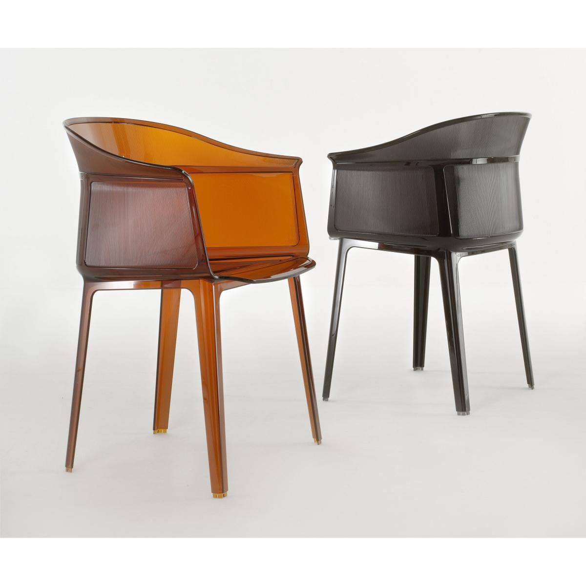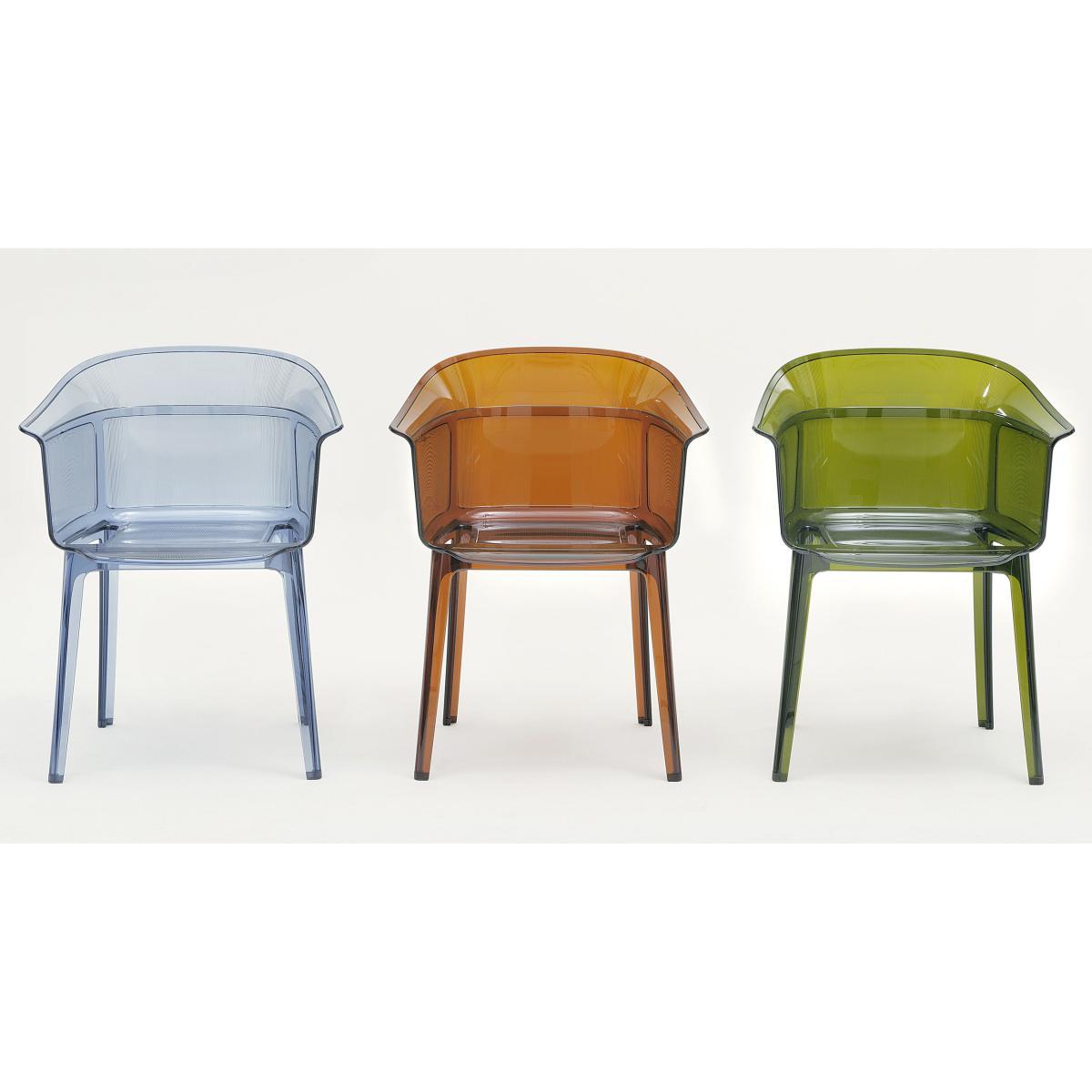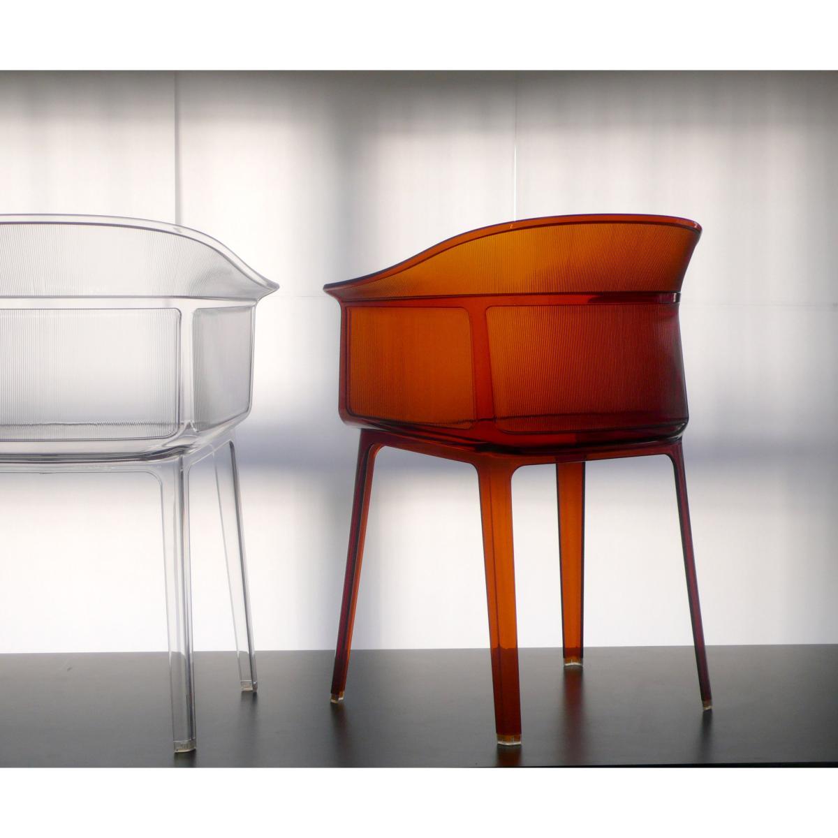 The new transparent polycarbonate Papyrus armchair is inspired by the linear, well-defined structure of vintage chairs. Papyrus combines a translucent structure with a very fine vertical ridged pattern, which covers the outer surface of the rounded backrest, with its soft, enveloping design. The seat is comfortable and welcoming, and the entire chair is very light. The range of transparent colours in which it is available heightens the special effects created by the patterned surfaces.