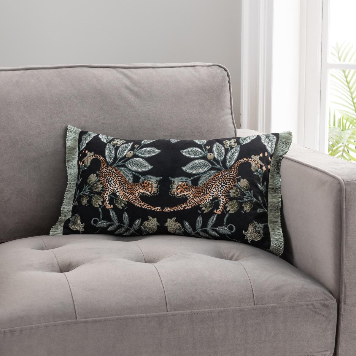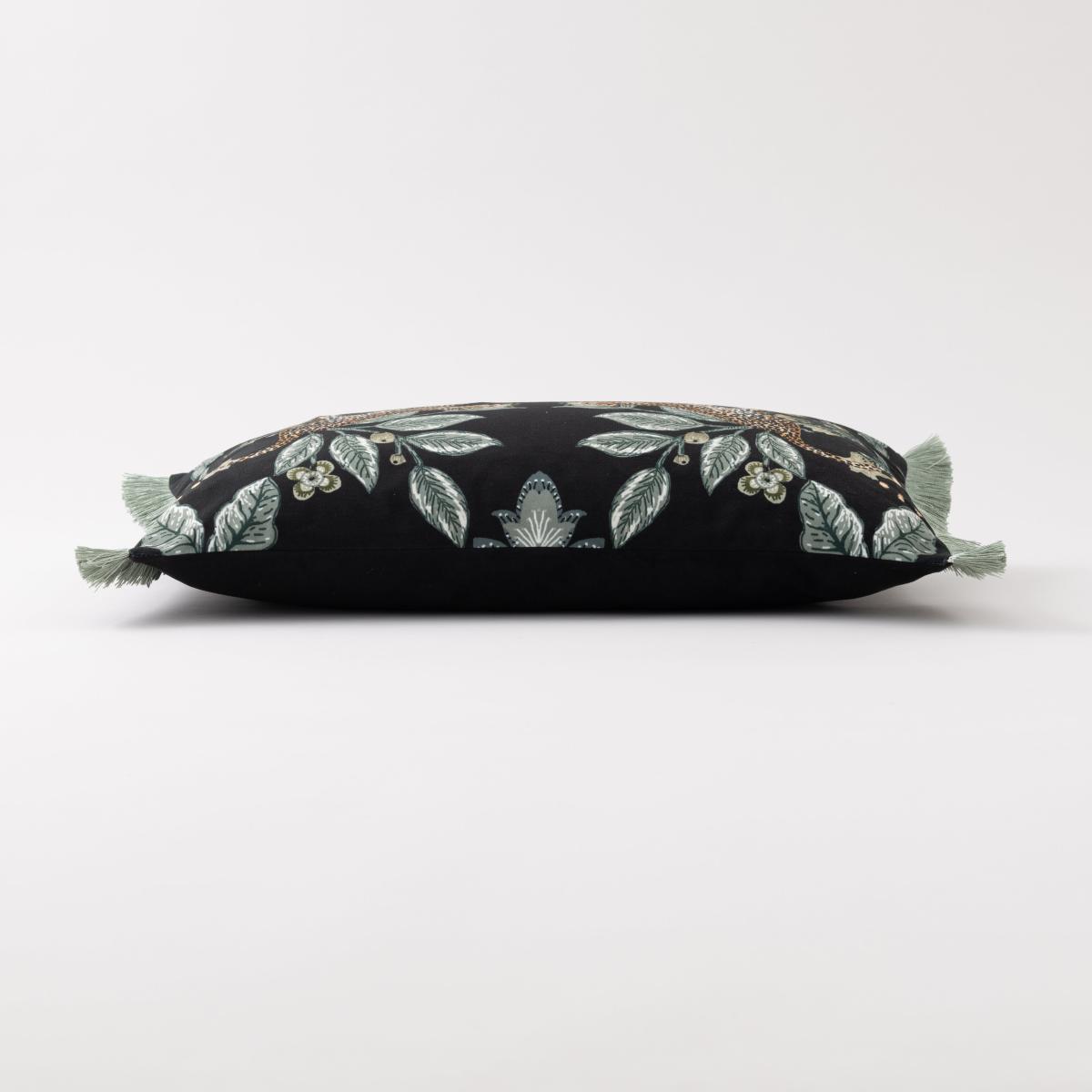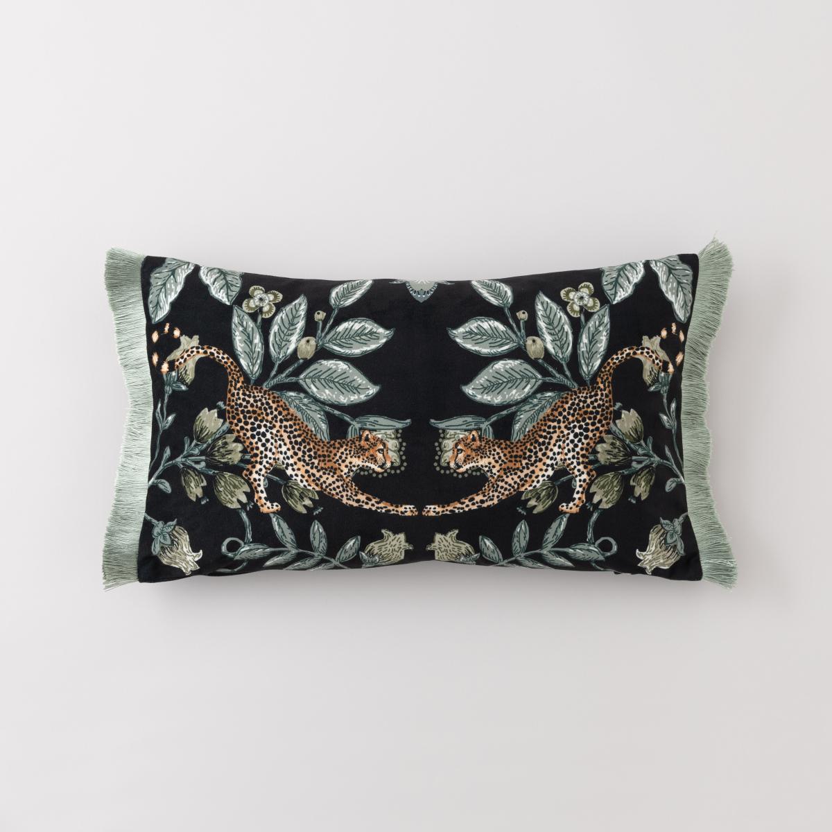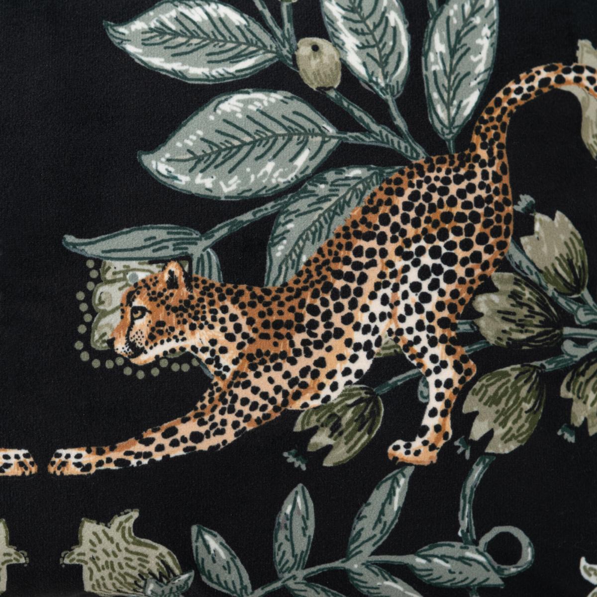 Bring out the wild side! Made from a luxuriously soft velvet, the Paradise Cheetah cushion playfully depicts dreamy foliage and majestic cheetahs in a calming green colourway. Finished with a plain reverse and filled with a recycled polyester fibre inner for lasting fullness and maximum comfort, this cushion is perfect as an accent or statement piece.