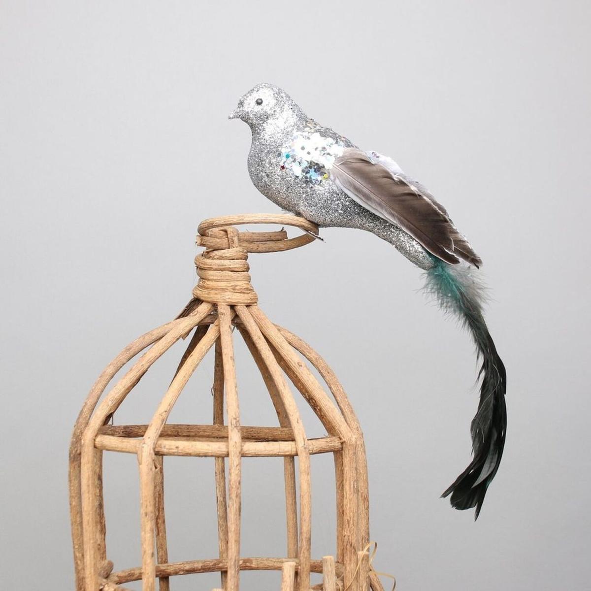 A stunning Paradise bird with clip decoration or craft accessory. Glittery body with sequins. This bird will stand out for all the right reasons. Clip this onto a tree for a wintry look. Perfect for events, and weddings as a decorative item.