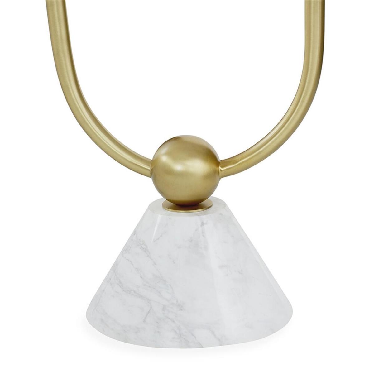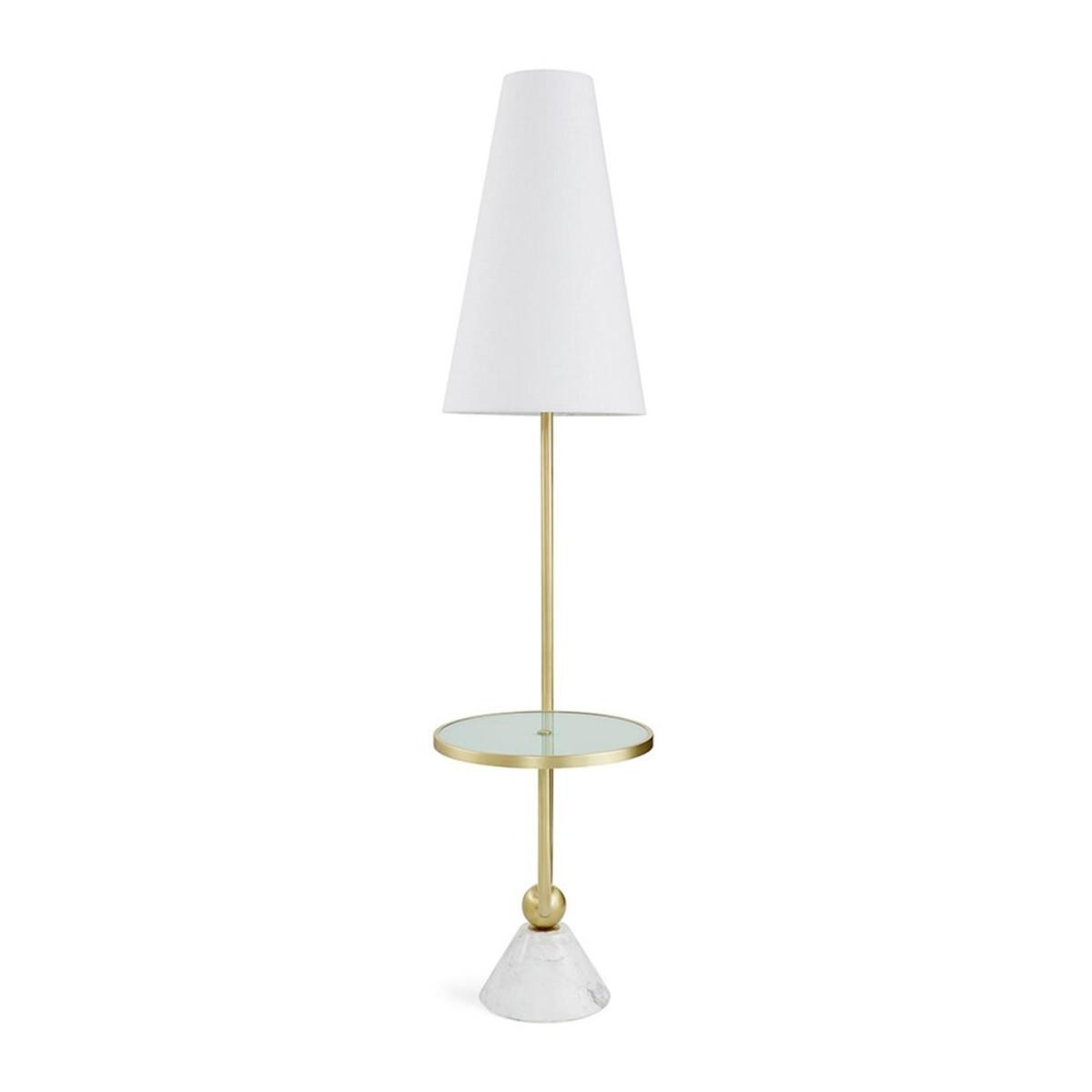 The Paradiso Table Floor Lamp from Jonathan Adler boasts a milk glass shade with a honed finish and a brass tube framework that is supported by a white Carrara marble base. It is a sleek and modern option that has a subtle yet sophisticated touch - an inset celadon back painted table top to hold your book or beverage. Illuminate your space with minimalist shapes that will give it an elegant and elevated look.