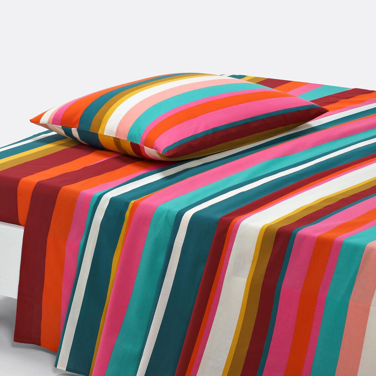 Paraisio Striped Flat Sheet. Printed with horizontal stripes in vibrant colours with a traditional South American flavour. Team it up with the rest of the bedding in the range. And mix and match with different colours and designs from our other ranges to add your own unique style to the bedroom. Cotton is part of our daily lives. We love it for its suppleness and softness. Easy Care, it is ideal for the beds of young and old alike!Product Details • Multi-coloured striped pattern • 100% cotton • 144 thread count. Care Advice • Machine washable at 60°C • By washing your laundry at 40°C instead of 60°C, you limit energy consumption. Dimensions • 180 x 290cm: Single • 240 x 290cm: King • 270 x 290cm: King • OEKO-TEX® Standard 100. Standard 100 certification by OEKO-TEX® tests textile products for harmful substances via an independent, international label.