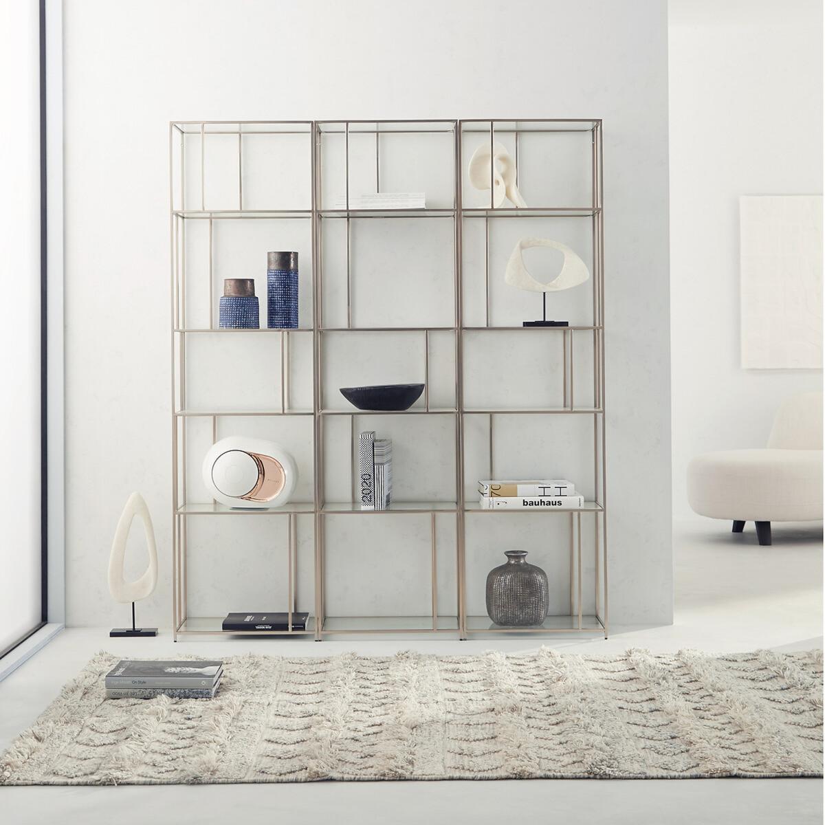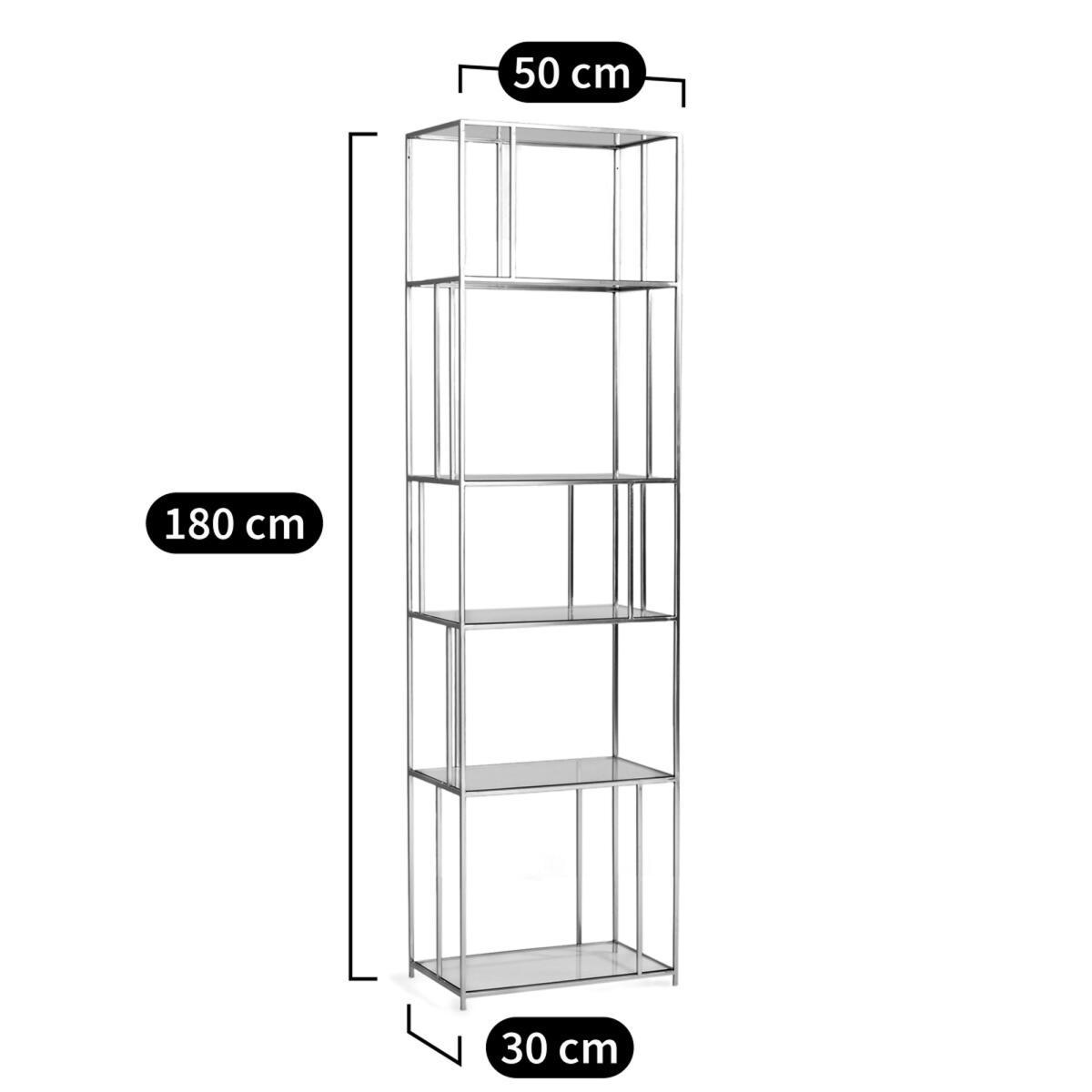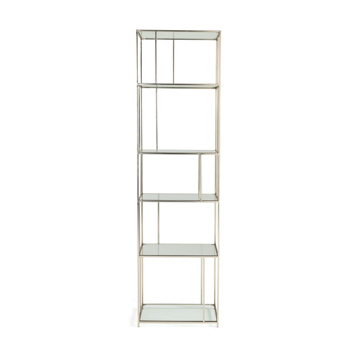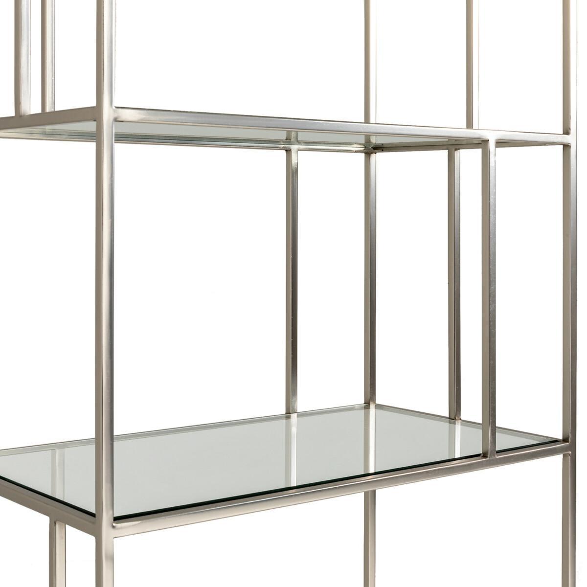 The light and graphic line of this glass and satin nickel metal bookcase will fit into a classic as well as a more contemporary home.