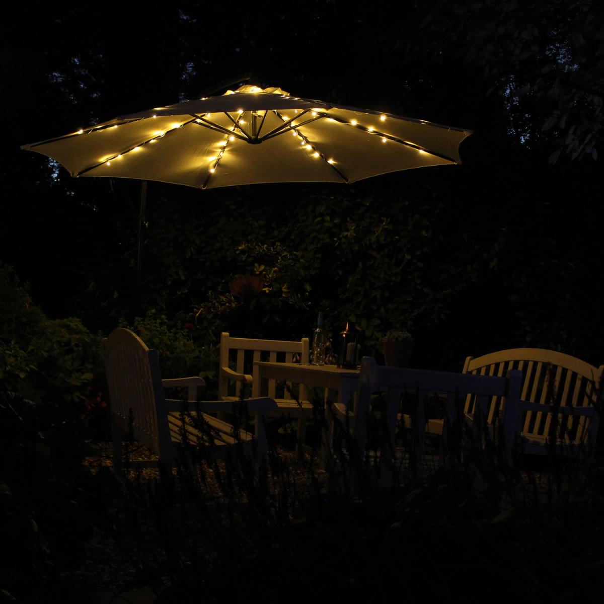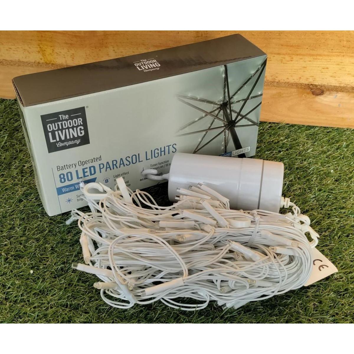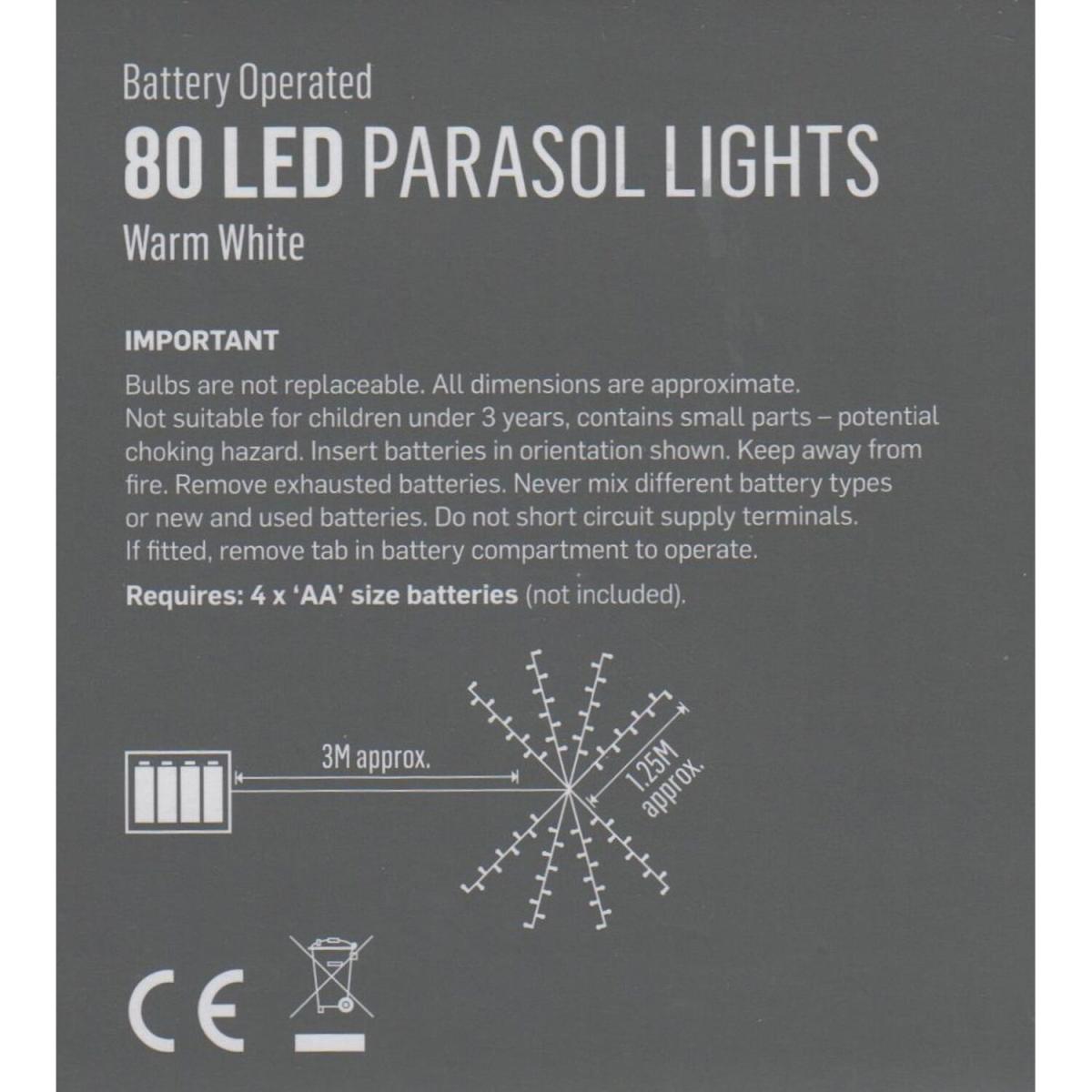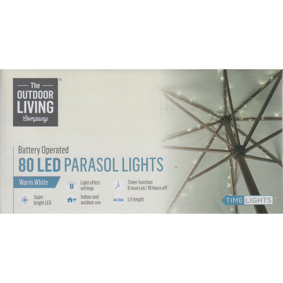 Premier warm white LED parasol lights for a 3. M parasol. Add a touch of elegance whilst creating a warm and welcoming feel to your favorite garden spot with this set of warm white parasol string lights. The 80 LEDs are lay out on a white lead cable which illuminate with a bright warm white glow. Featuring 8 x 1.25m lit lengths which are designed to wrap around each of the 6 construction poles of your parasol. The battery box includes an integrated hook ready to hang in the center of your parasol with the function button on base. The battery powered lights have 8 lighting effects to choose from including a static setting and also feature a handy built-in timer function giving you 8 hours on and 18 hours off, so you don't need to worry about remembering to turn them off! Requires 4 x AA batteries not included. This set of lights are the perfect solution for creating the perfect ambience for any occasion, from a romantic meal for you and your partner, a family BBQ or a garden party with all your friends. A simple set of lights for everyone to enjoy.