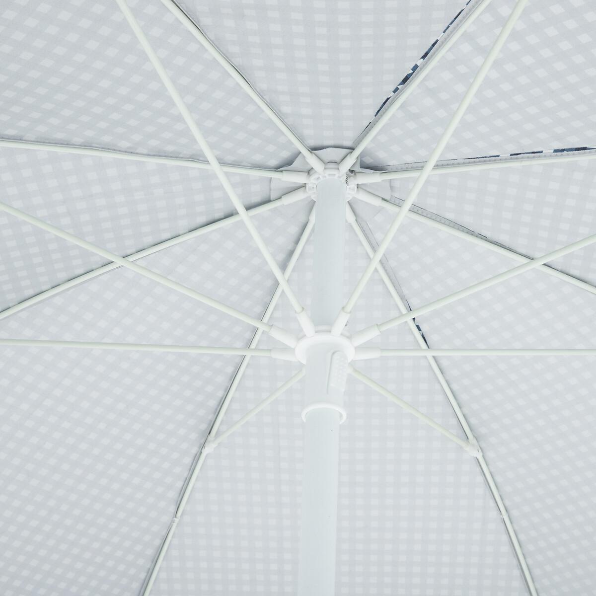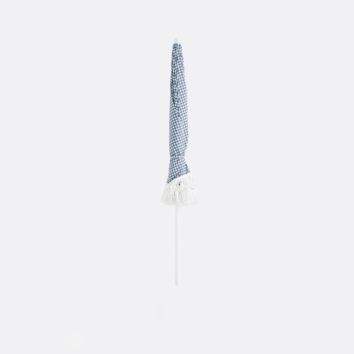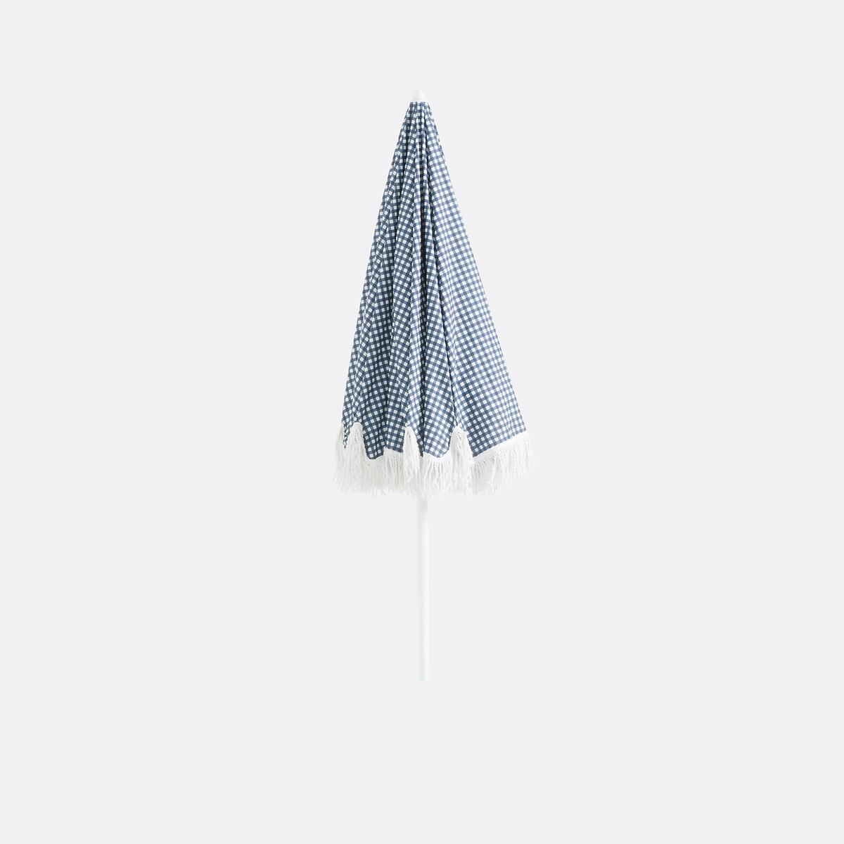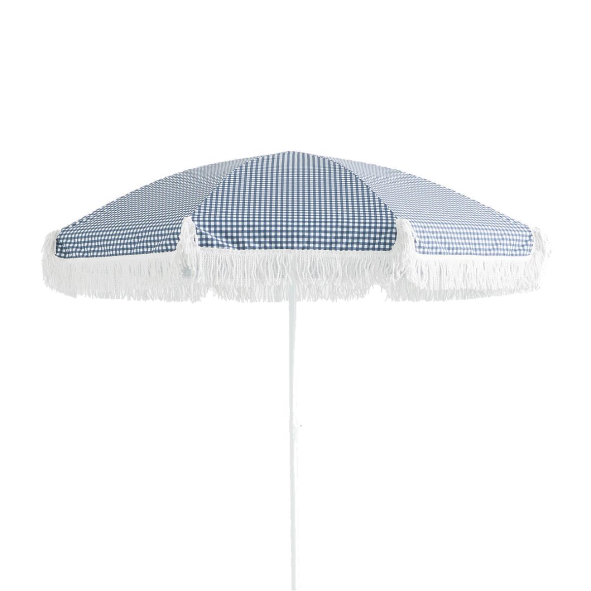 Rustic, colourful and vibrant. The Aline range is perfect for lunch on the grass or other moments in the garden. Crockery and cutlery, tablecloth, parasol, cushions and seat pad are all available in a graphic gingham or stylised striped print. In true picnic style. The Aline fringed parasol : covered in gingham checks, it protects you from the sun with elegance. Product Details • Fringed parasol • 100% polyester fabric 160 g/m2, blue/white gingham print • Fibreglass ribs, diameter 6mm (for better durability) • Height-adjustable aluminium pole • UPF40+ UV protection • Comes with carry/storage bag • Parasol base not included. Dimensions • Diameter: 185cm • Total Height: 209cm • Weight: 2.5kg. Usable space • Pole : tube diameter 4cm. Dimensions and weight of parcel1 parcel • W110 x H14 x D14cm. 3kg