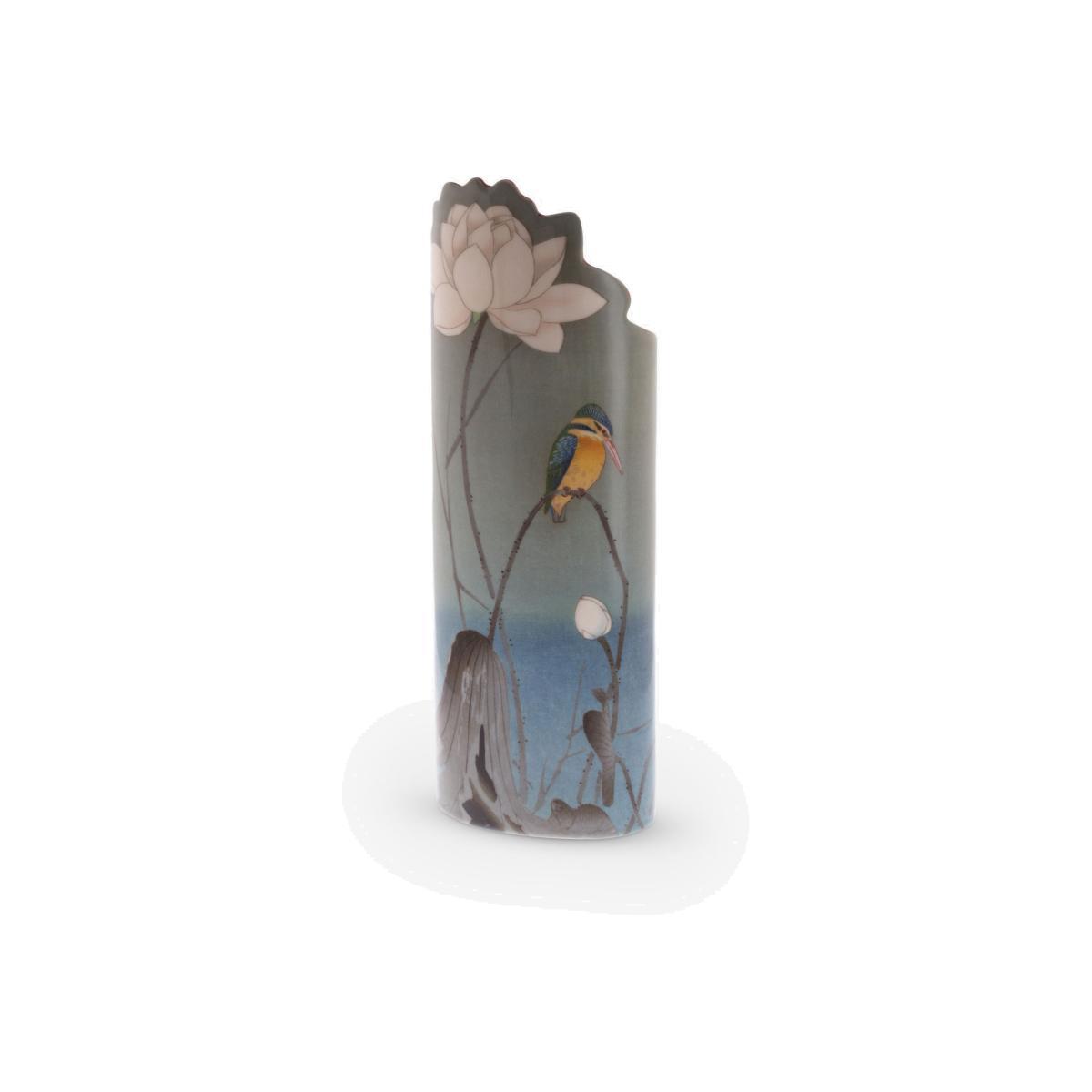 Originally a woodblock print by Japanese artist Ohara Koson, 'Kingfisher with Lotus Flower' has been reproduced onto this fine ceramic vase. The rim is specially crafted to follow and accentuate the shape of the artwork, making it a stylish piece that can easily standalone without flowers or be put to full use to display your favourite blooms. Part of an eclectic range of ceramic vases from John Beswick, each showcasing famous pieces of art in silhouette.
