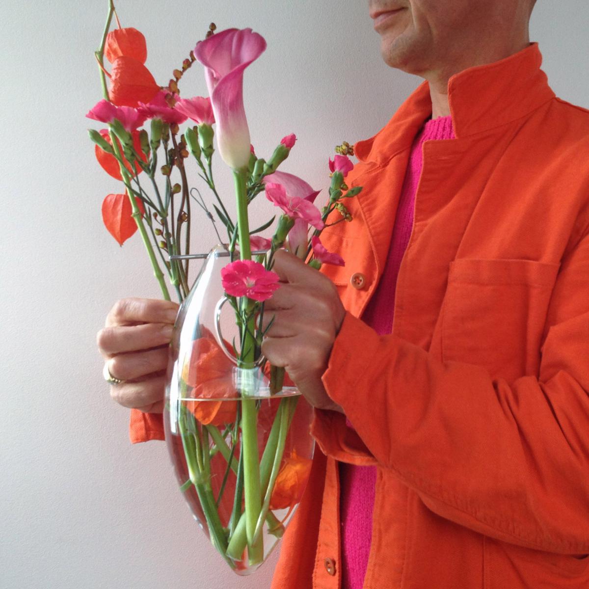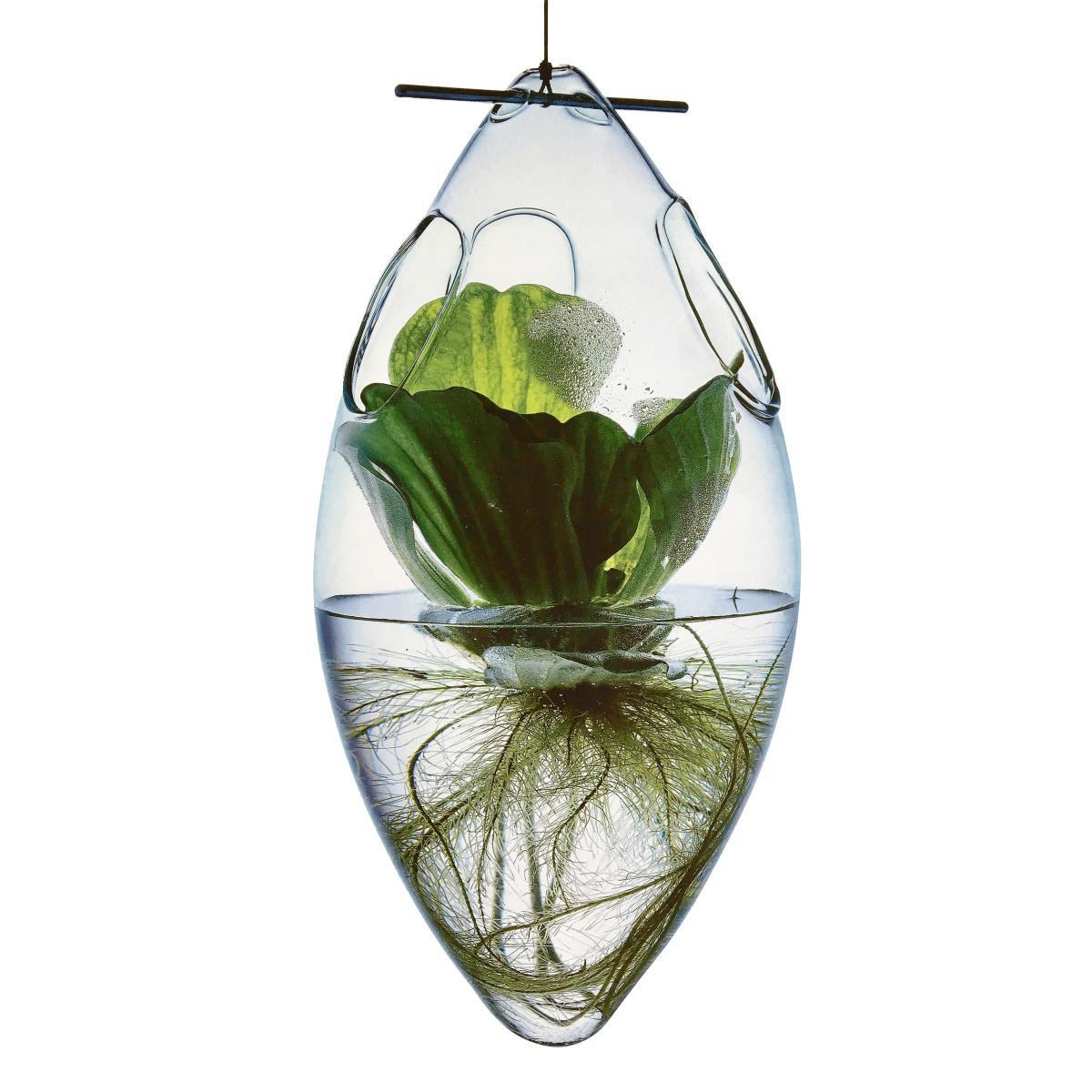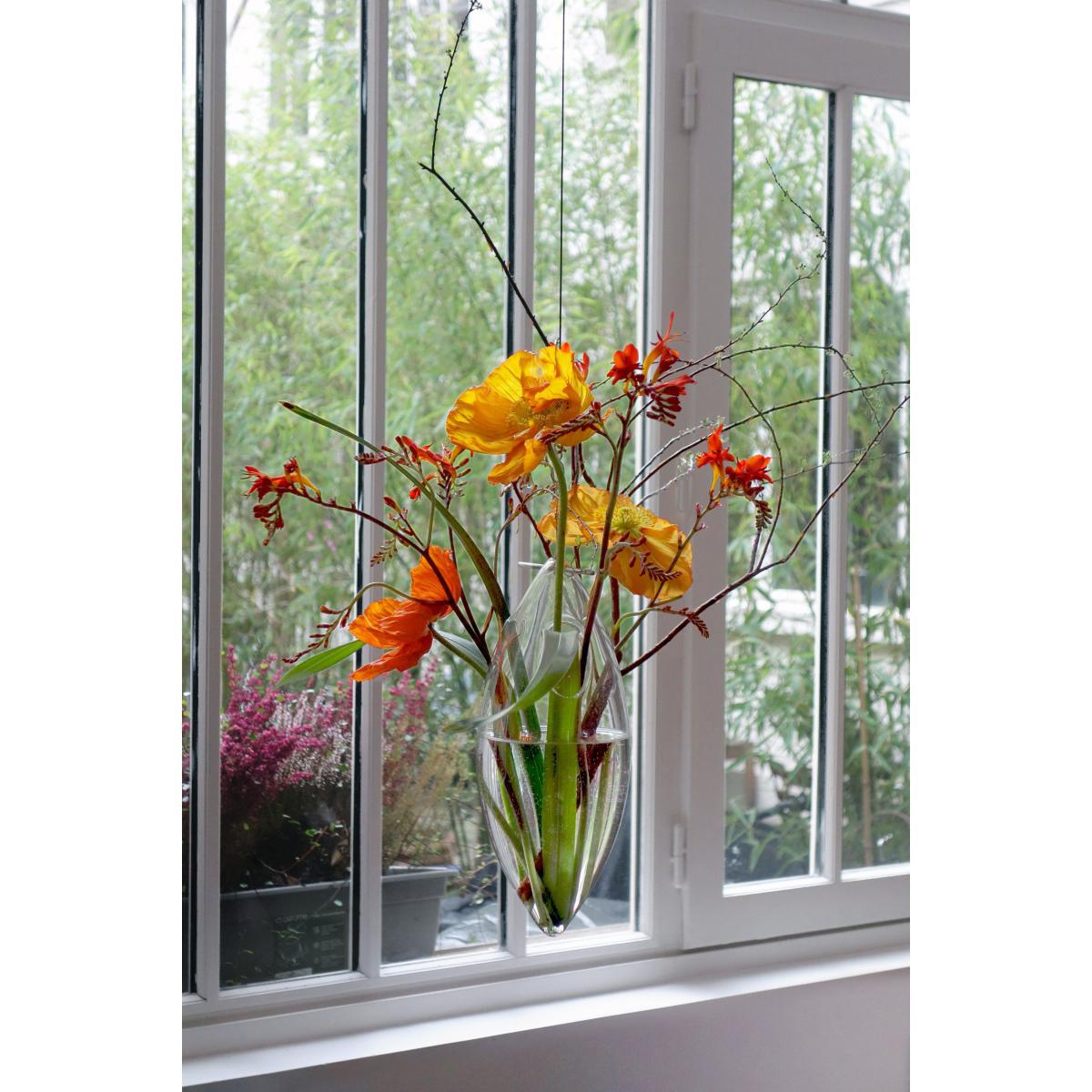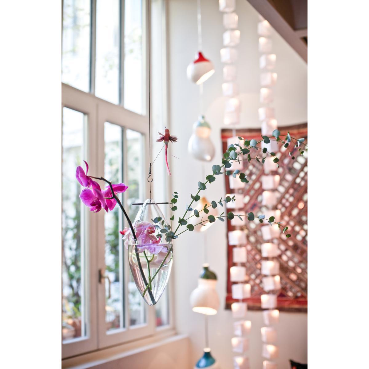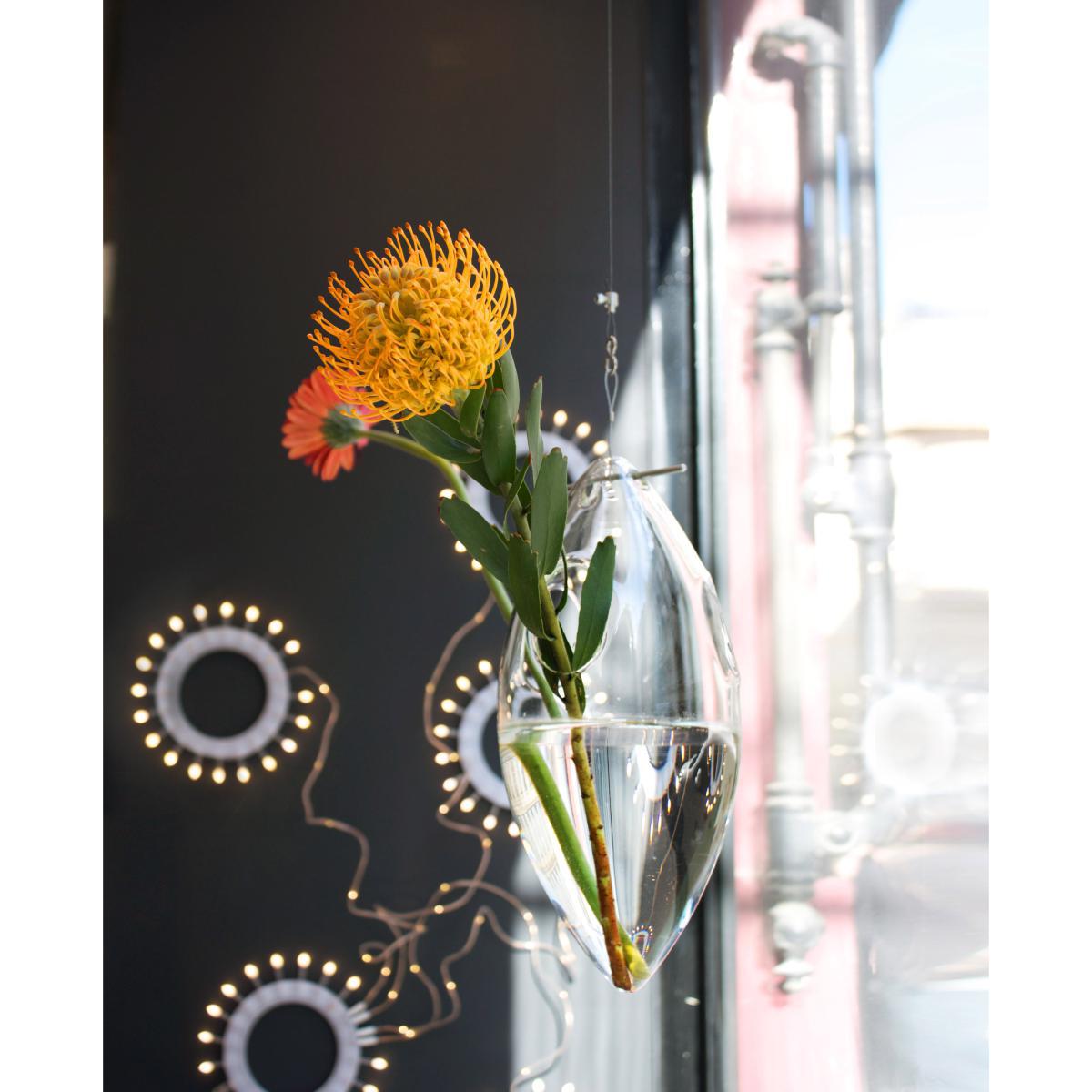 "The Paresseux is a simple vase that does not know to hold itself standing, suspended in the airs to a steel cable, it balances himself. To see it thus to oscillate, you can test a pincement to the similar heart to the one that give rise to the acrobats to the circus; nevertheless, its evolutions are sure and it does not risk nothing. The Paresseux vase appreciates all the flowers, but it likes all particularly to have dresses it well filled with foliages. You also can adorn it branches that run down, or do to climb in height, alongside the cable, a stem of lierre. Asymmetry suits for him. ".
