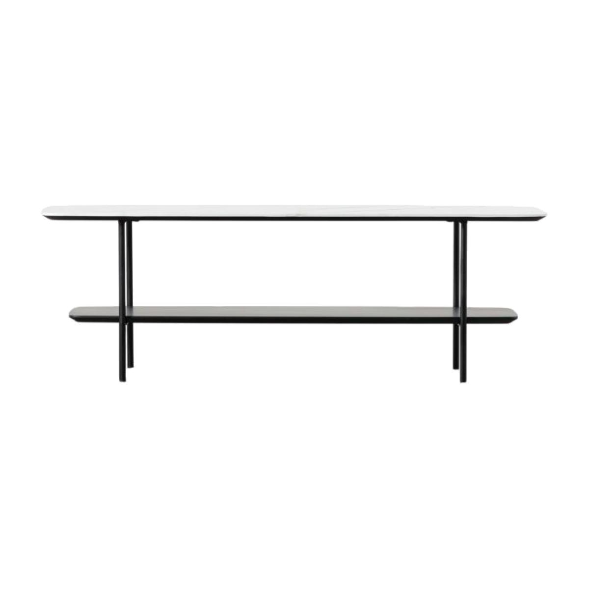 Featuring gently rounded corners, the stylish design of this eye-catching coffee table creates a clean, contemporary look. The top is white faux marble, which is perfectly complemented by the black metal frame, and the table has a lower shelf, with a black painted finish, for added practicality. The collection is part of our Packed-Flat Design Project, offering easy delivery to any room in any property, whilst reducing the packaging needed. Easy assembly is required, but all the tools needed are supplied. Material:Faux Marble. Colour/Finish: White. Table Shape: Rectangle.