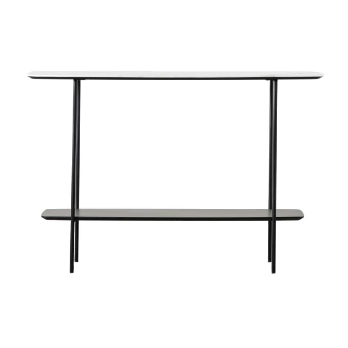 Featuring gently rounded corners, the stylish design of this eye-catching console table creates a clean, contemporary look. The top is white faux marble, which is perfectly complemented by the black metal frame, and the table has a lower shelf, with a black painted finish, for added practicality. Matching pieces are available, and are also available with black faux marble tops. The collection is part of our Packed-Flat Design Project, offering easy delivery to any room in any property, whilst reducing the packaging needed. Easy assembly is required, but all the tools needed are supplied. Material: Iron. Colour/Finish: White. Table Shape: Rectangle.
