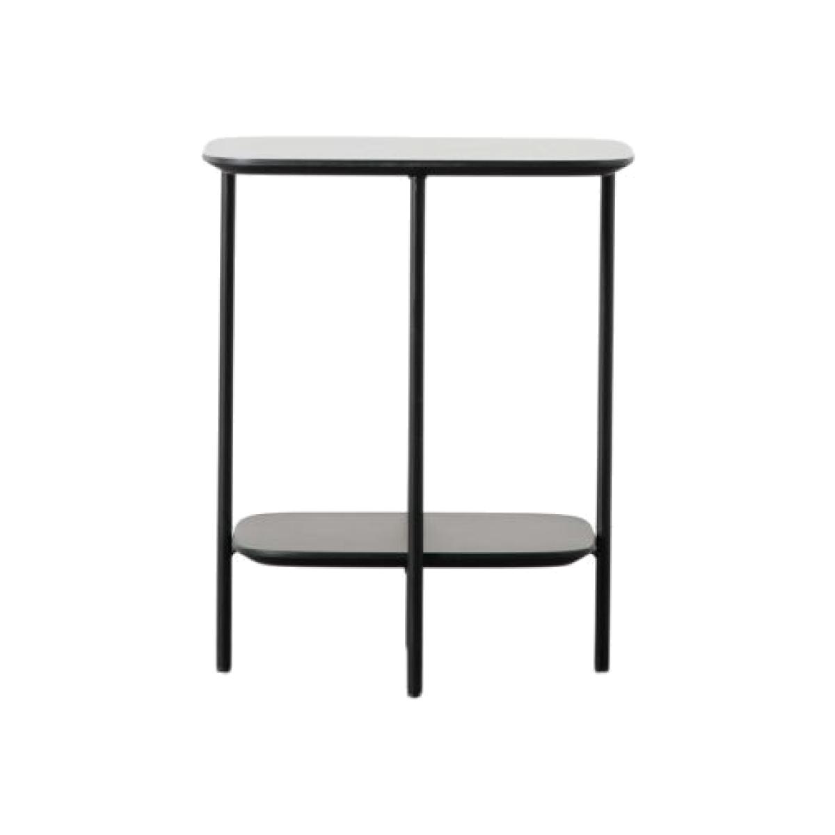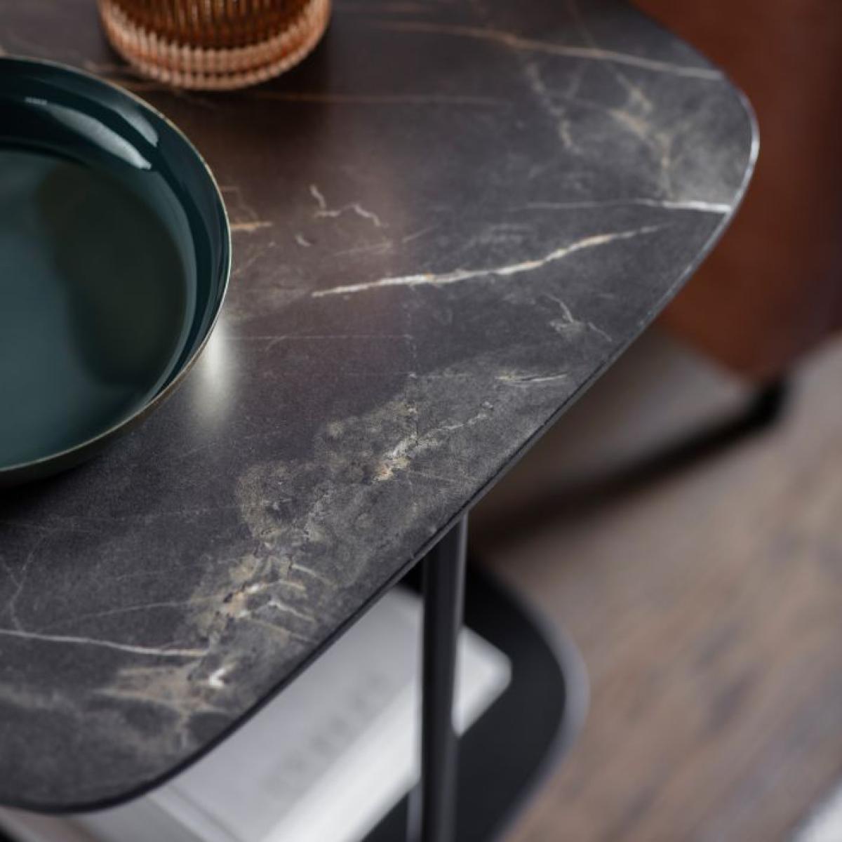 Featuring gently rounded corners, the stylish design of this eye-catching side table creates a clean, contemporary look. The top is black faux marble, which is perfectly complemented by the black metal frame, and the table has a lower shelf, with a black painted finish, for added practicality. Matching pieces are available, and are also available with white faux marble tops. The collection is part of our Packed-Flat Design Project, offering easy delivery to any room in any property, whilst reducing the packaging needed. Easy assembly is required, but all the tools needed are supplied. Material: Iron. Colour/Finish: Black.