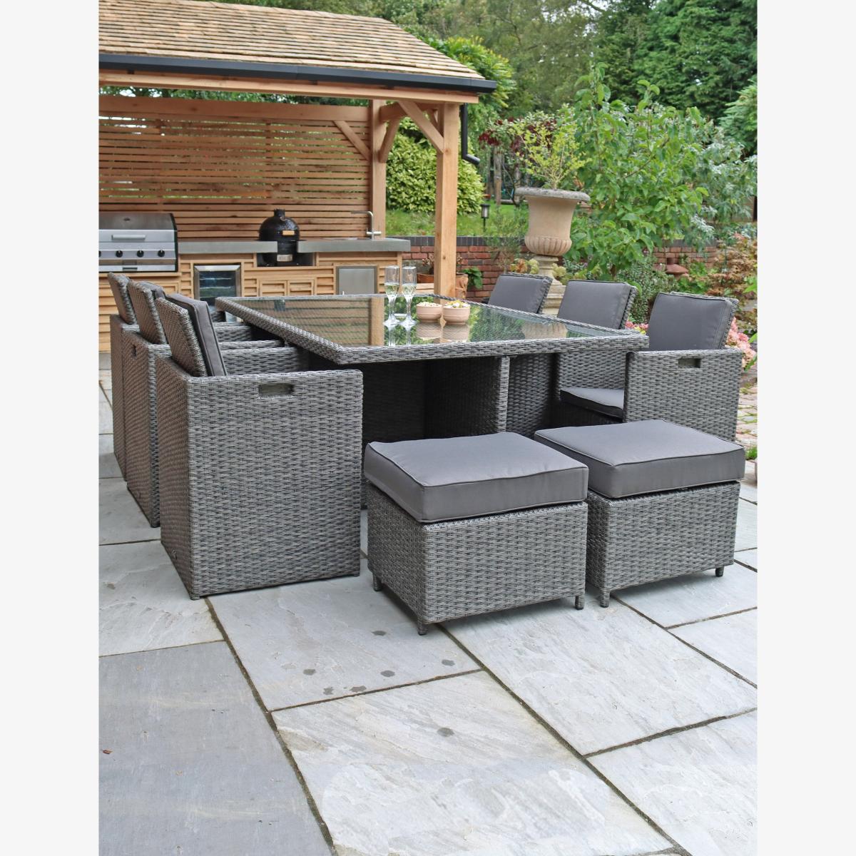 The Paris Cube Set is the ultimate blend of style and practicality, perfect for transforming your outdoor space. Here‚'s a closer look at its features and benefits:. Timeless Cube Design: With its sleek and modern cube shape, this set enhances any garden aesthetic while providing functional storage.. Space-Saving Storage: The innovative design includes cube chairs with folding backrests and footstools that neatly tuck away inside, making it easy to store the entire set compactly when not in use.. Durable Construction: Made from a sturdy aluminium frame and hand-woven synthetic double half-round rattan, this set is built to withstand the elements while maintaining its stylish appearance.. Comfortable Cushions: Each chair comes with weather shield seat and back cushions that are both stain-resistant and water-resistant, ensuring comfort and longevity.. Ideal for Outdoor Living. Setting up an outdoor dining area with the Paris Cube Set allows you to host delightful lunches and dinners, and enjoy serene breakfasts outdoors during the warmer months. Its compact design makes it especially suitable for smaller patios, allowing you to create distinct zones for dining and relaxation without overwhelming your space.. Maximize Your Outdoor Space. Having a garden or outdoor area is a luxury that should be cherished and optimized. The Paris Cube Set is perfect for those who want to make the most of their outdoor living, providing a stylish, functional, and versatile solution for any occasion. Whether you‚'re entertaining guests or enjoying a quiet afternoon, this set is sure to enhance your outdoor experience!. The Paris Collection. The Paris collection is made using a slate grey double half round synthetic rattan, which makes this one of our premium collections. Cleverly hand crafted onto strong rust proof aluminium frames, making this range ideal for long term use. To accompany the Paris rattan dining sets, we offer matching rattan lounging, relaxing and storage options.. Features:. Product Material: Double Half Round Synthetic Rattan. Main Colour: Slate Grey. Cushion Colour: Grey. Rust Proof Aluminium Frame. Tempered glass table top complete with parasol hole. Shower and stain resistant cushions included. Practical and space saving cube design. Compliments any outdoor living space. The 10 seater set includes:. 1 x Table (with tempered glass top). 6 x Cube Chairs (with folding backrest). 4 x Integral Foot Stools. 16 x Weather shield cushions. Please note: Colours may vary slightly from those shown. Variations can occur due to the natural characteristics of materials (such as wood, fabric, or rattan), as well as differences in screen resolution and lighting when viewing images.