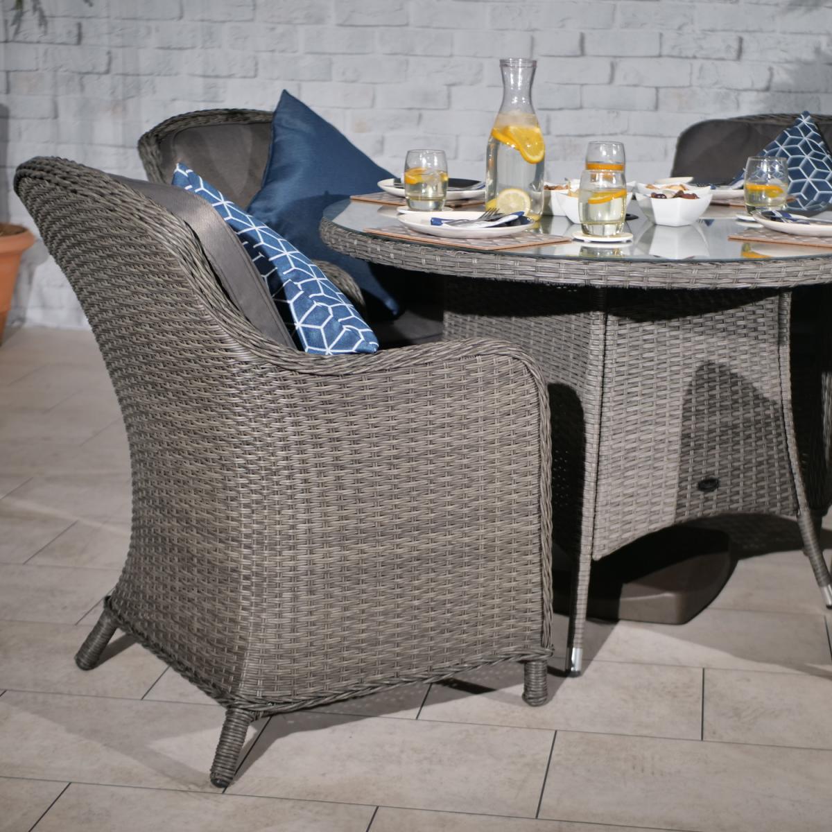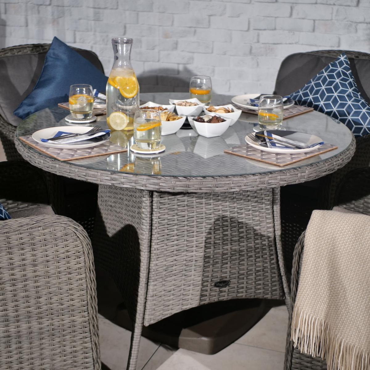 I love this set for its versatility and understated style, making it a great anchor in both contemporary and coastal interiors. The round shape encourages conversation and provides a welcoming feel, while the grey tones are neutral enough to pair with a variety of colour schemes and decor styles. This set works particularly well in open-plan spaces or informal dining areas, where its casual elegance can shine. When styling, consider adding colourful or textured tableware to create visual interest, and complement the rattan chairs with soft textiles or cushions for added comfort and warmth. Its design strikes a balance between practicality and style, making it a flexible choice for both everyday family meals and relaxed entertaining.