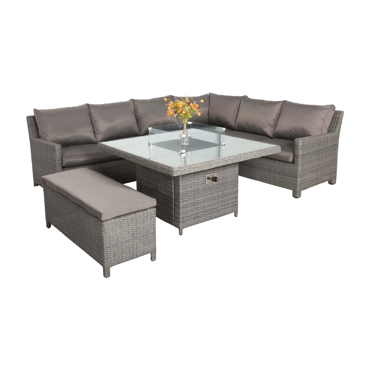The Paris Corner Dining Set will be a great seating addition to your outdoor space with its modern slate grey colourway and synthetic rattan style. Crafted with a rust proof aluminium frame, this set has a practical and space saving design. This set comes with a square fire pit which has an adjustable flame. We recommend using a 5kg gas bottle when using the fire pit table. Cushions are included.