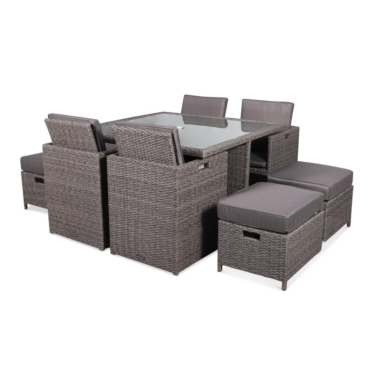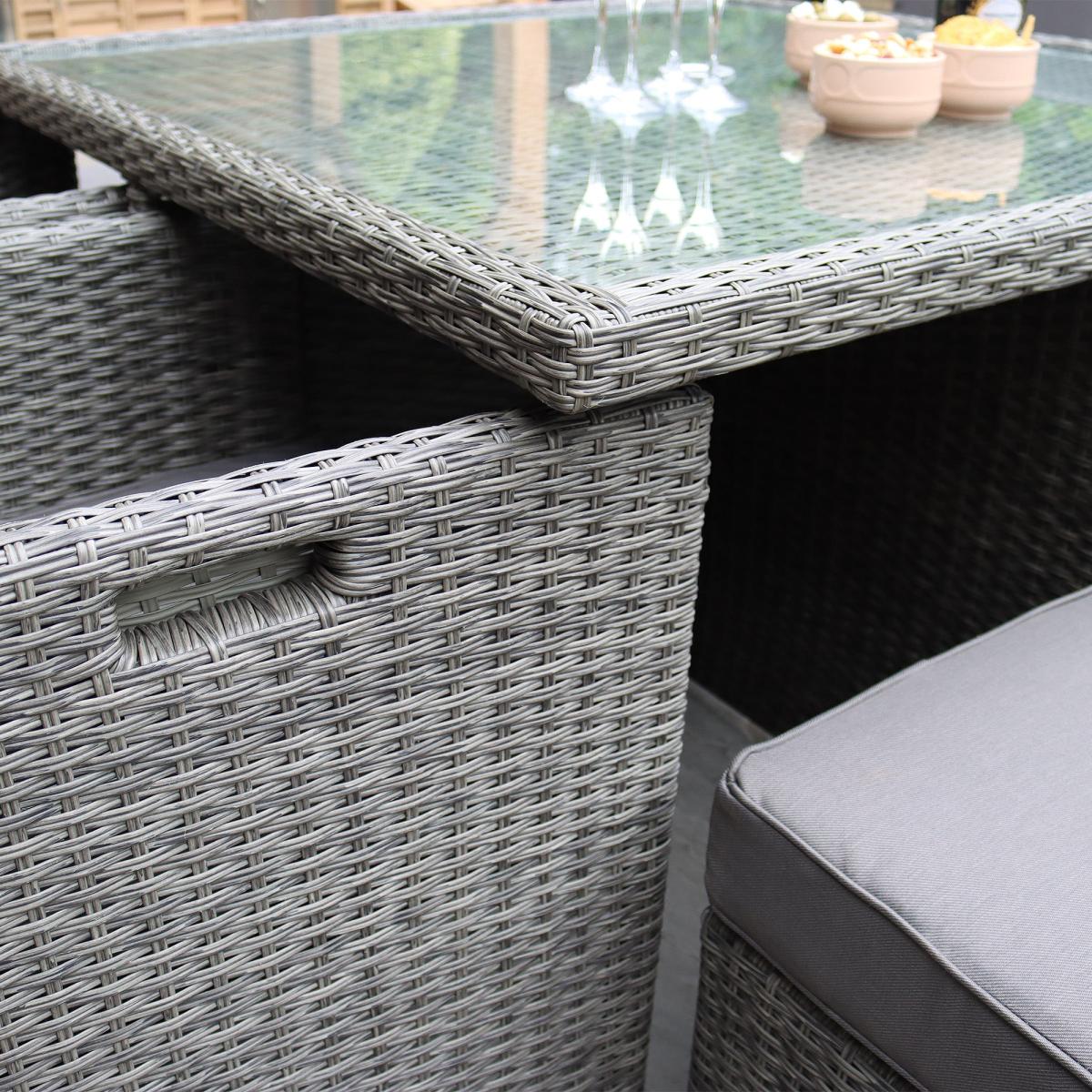 * Weather Shield Cushions* Rust proof Aluminium Frame* Hand woven double half round synthetic rattan weave* Space Saving Cube Design The Paris 8 Seater Cube Dining Set is perfect for those seeking a space-saving dining solution. Its rust-proof aluminium frame and weather shield cushions ensure all-weather resilience, while the hand-woven double half-round synthetic rattan weave adds style. The cube design allows for easy storage and flexibility.