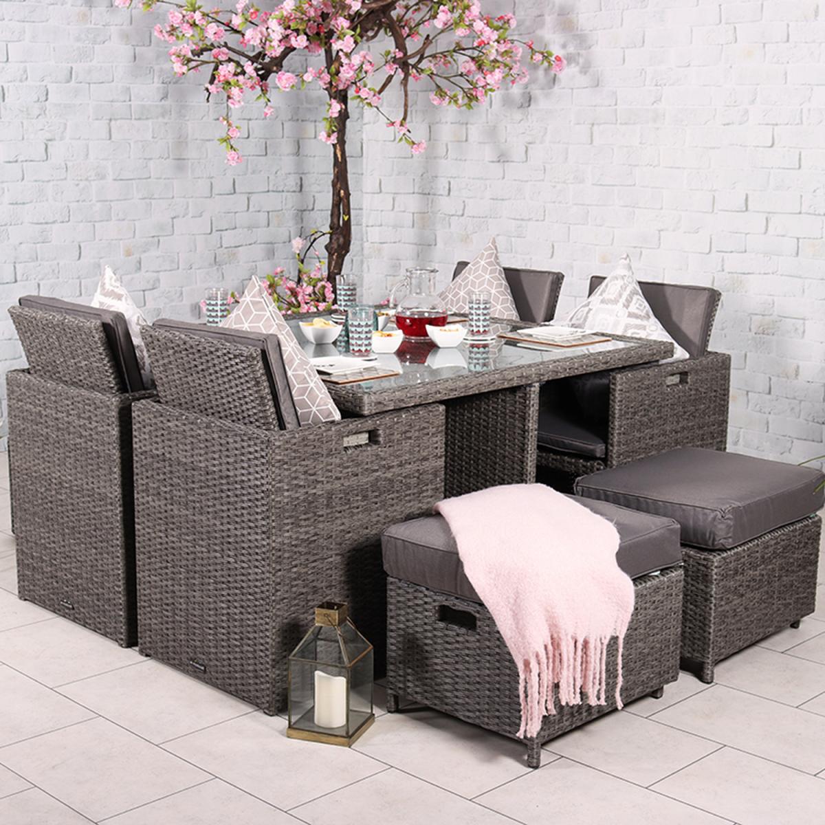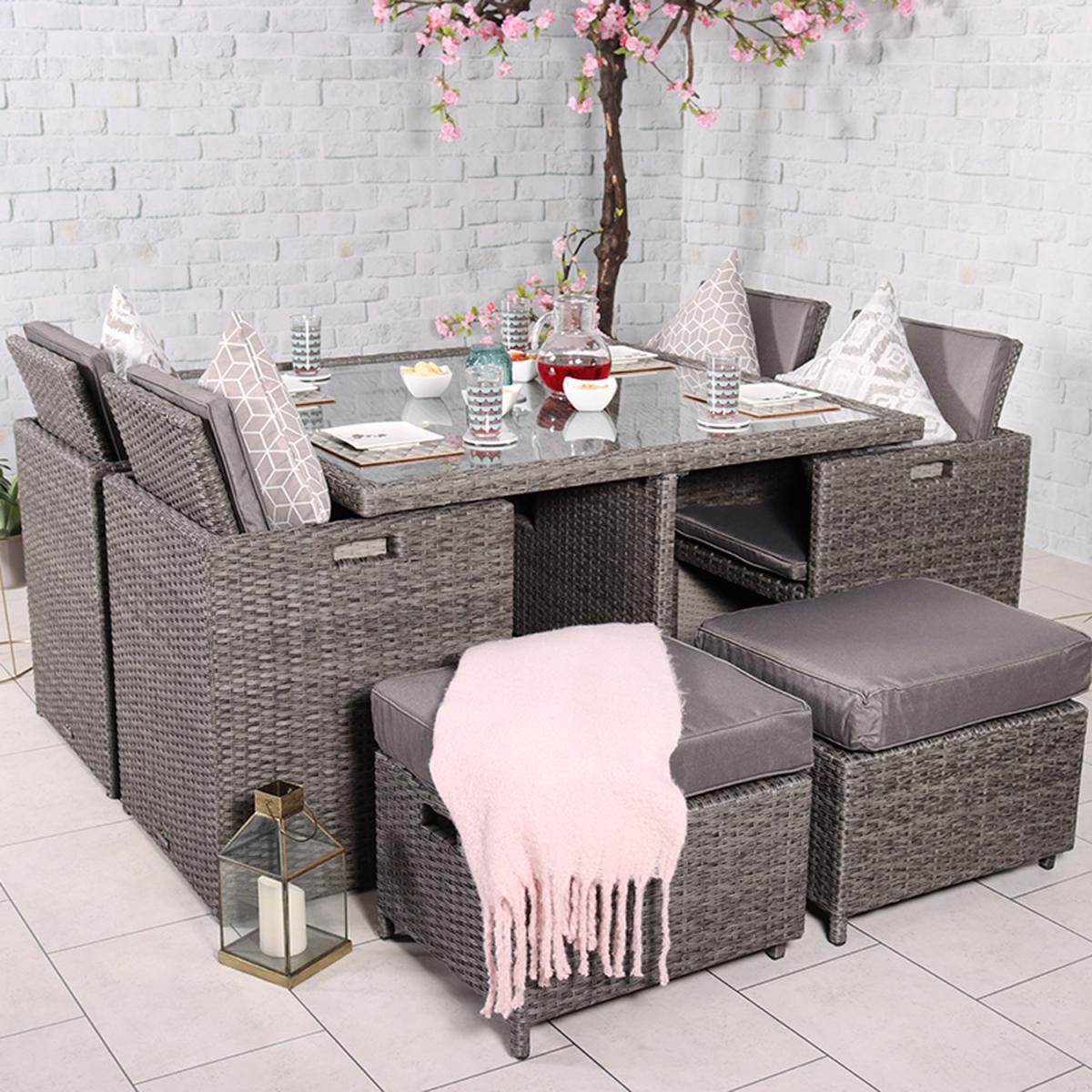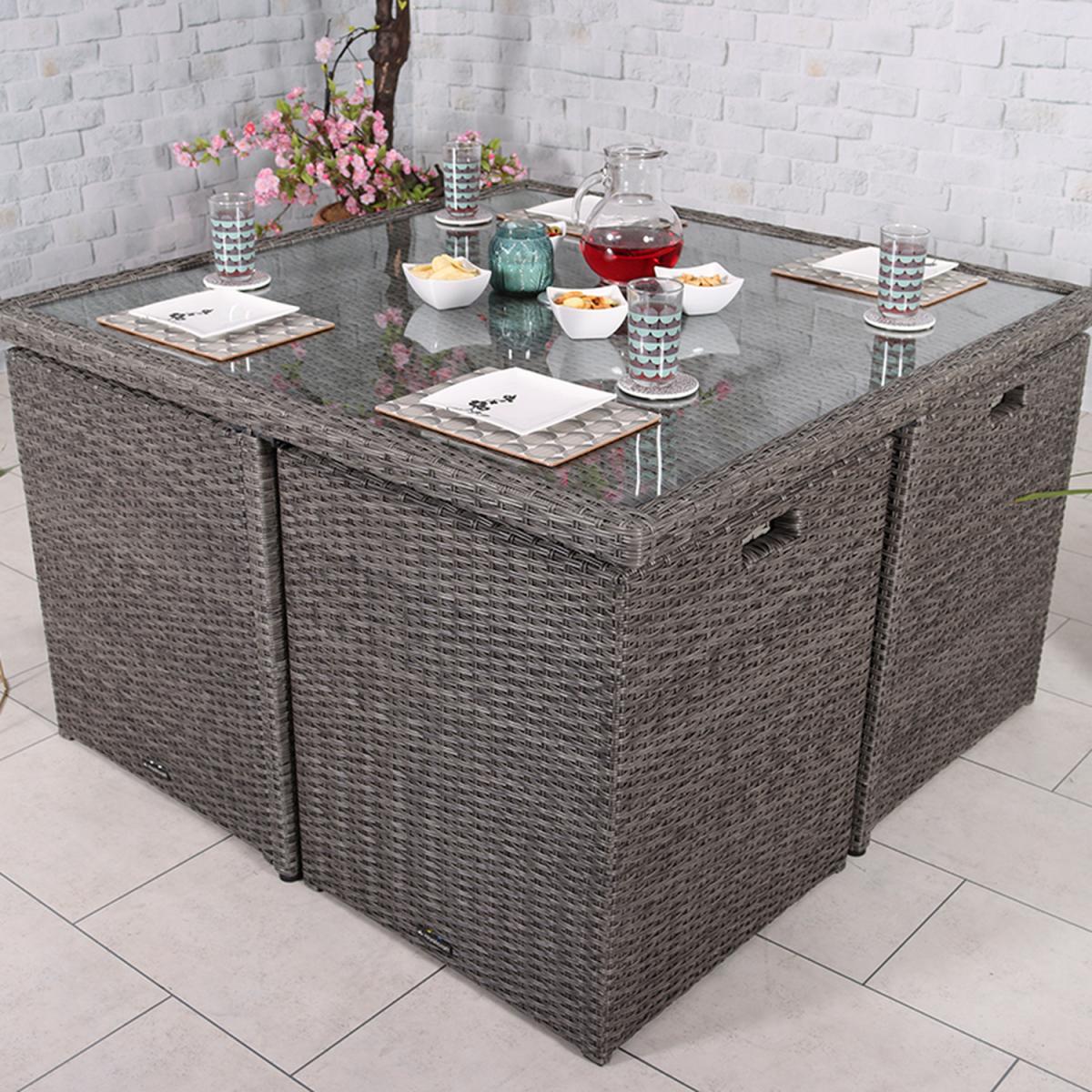 I love this set for its sleek grey finish, which pairs well with both modern and industrial outdoor spaces. It’s versatile enough to fit in a contemporary garden or even an urban patio, thanks to its neutral tone. The cube design makes it practical; the stools double as extra seating or casual tables, and it’s easy to keep looking fresh with minimal maintenance. For styled shots, layering with pastel cushions or textured throws can soften the look for a cosy outdoor dining vibe, while pairing it with vibrant tableware can add a lively, inviting touch. Its sturdy build ensures longevity, making it a smart choice for year-round outdoor entertaining.