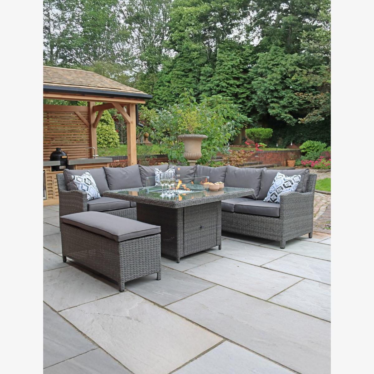 Paris Fire Pit Set. Embrace outdoor living with the Paris Fire Pit Set, designed for year-round enjoyment. This stylish corner dining set features a stunning square fire pit table, perfect for those warm summer evenings or cozy autumn nights.. All-Season Use: The Paris Fire Pit Set allows you to enjoy your outdoor space regardless of the season. From sunny afternoons to evening gatherings, this set creates a warm and inviting atmosphere.. User-Friendly Fire Pit: The fire pit table is operated effortlessly with a dial on the side panel. The gas tank (not included) is conveniently hidden in the table‚'s base for easy access and a clean look. A 15cm glass surround provides safety from the flames, and firestones are included for added charm.. Durable Construction: Crafted with a robust aluminium framework and hand-woven synthetic double half-round rattan, this set is designed to withstand the elements while maintaining its aesthetic appeal.. Comfortable Seating: The set includes two 2-seater sofas, a corner and middle chair, and a 2-seater bench, all equipped with weather shield cushions that are stain-resistant and water-resistant for lasting comfort.. Create a Social Space. The fire pit dining and lounging set instantly transforms your outdoor area into a social haven. It‚'s the perfect gathering spot to chat, relax, and enjoy the ambiance as the sun sets. Imagine the twinkling lights, gentle night air, and the mesmerizing flames creating a magical setting for parties or quiet evenings with a good book and a glass of wine.. Year-Round Enjoyment. One of the best features of a fire pit set is its versatility, allowing you to enjoy your outdoor space even in the cooler months. Whether it‚'s a crisp autumn night or a chilly winter evening, the warmth of the fire invites you to stay outside longer.. The Paris Fire Pit Set is not just furniture; it‚'s an experience, making a statement in your garden while offering comfort, style, and practicality all year round.. The Paris collection. The Paris collection is made using a slate grey double half round synthetic rattan, which makes this one of our premium collections. Cleverly hand crafted onto strong rust proof aluminium frames, making this range ideal for long term use. To accompany the Paris rattan dining sets, we offer matching rattan lounging, relaxing and storage options.. Features:. Product Material: Double Half Round Synthetic Rattan. Main Colour: Grey. Cushion Colour: Grey. Rust Proof Aluminium Frame. 120cm x 120cm Fire pit table with adjustable flame. Table top protective cover included. Shower and stain-resistant cushions included. Practical and space-saving design. Compliments any outdoor patio or decking space. The set includes. 1 x 120cm Square Fire Pit Table (with spray stone cover). 1 x Left Hand Sofa Bench. 1 x Right Hand Sofa Bench. 1 x Standard Corner Seat. 1 x Middle Chair. 1 x Bench. Please note: Colours may vary slightly from those shown. Variations can occur due to the natural characteristics of materials (such as wood, fabric, or rattan), as well as differences in screen resolution and lighting when viewing images.