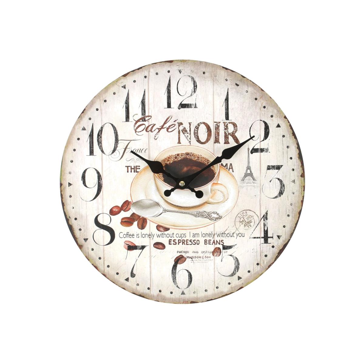 This vintage-inspired wall clock features a lovely Parisian cafe design. Perfect for a shabby chic kitchen or breakfast nook. 34cm diameter. AA battery required.