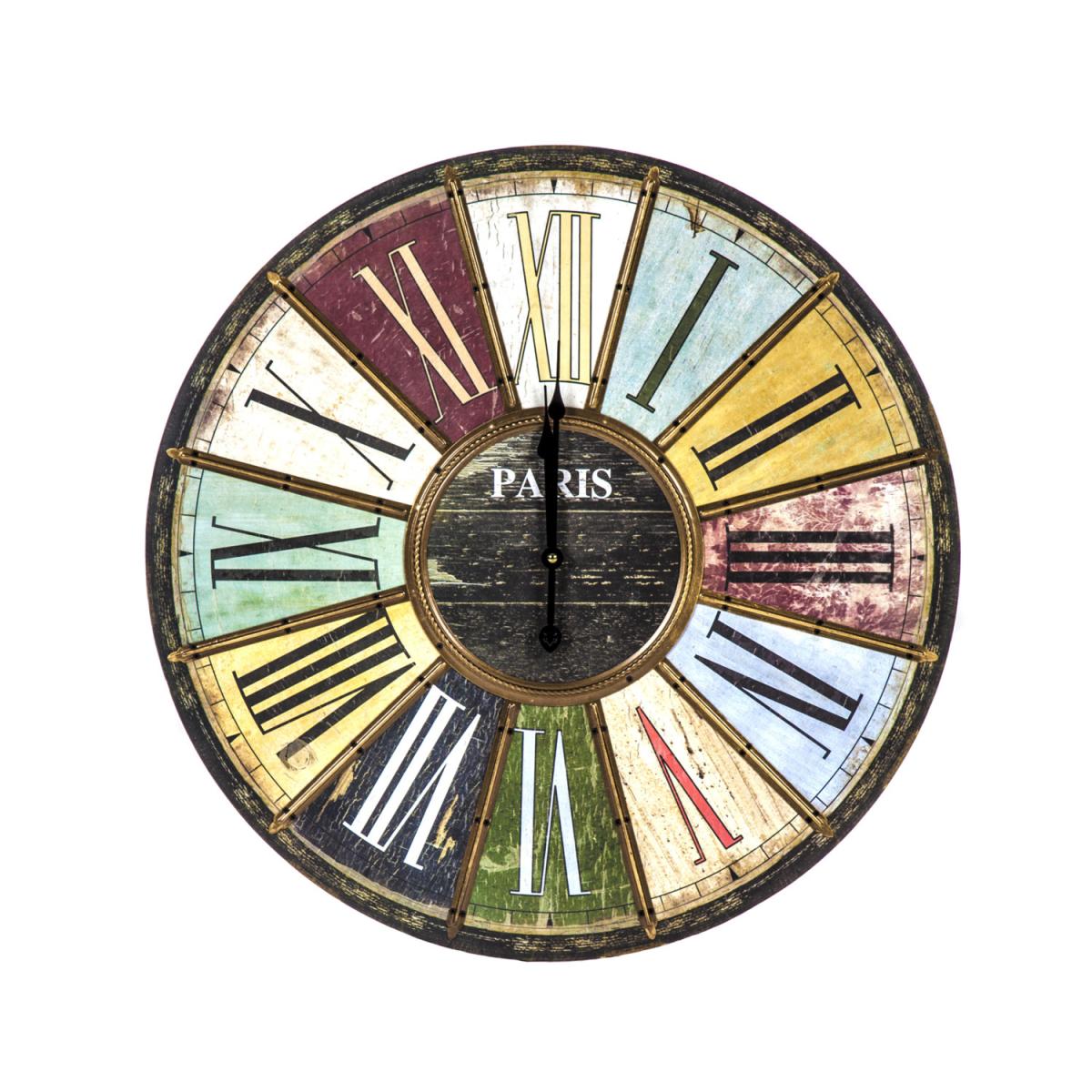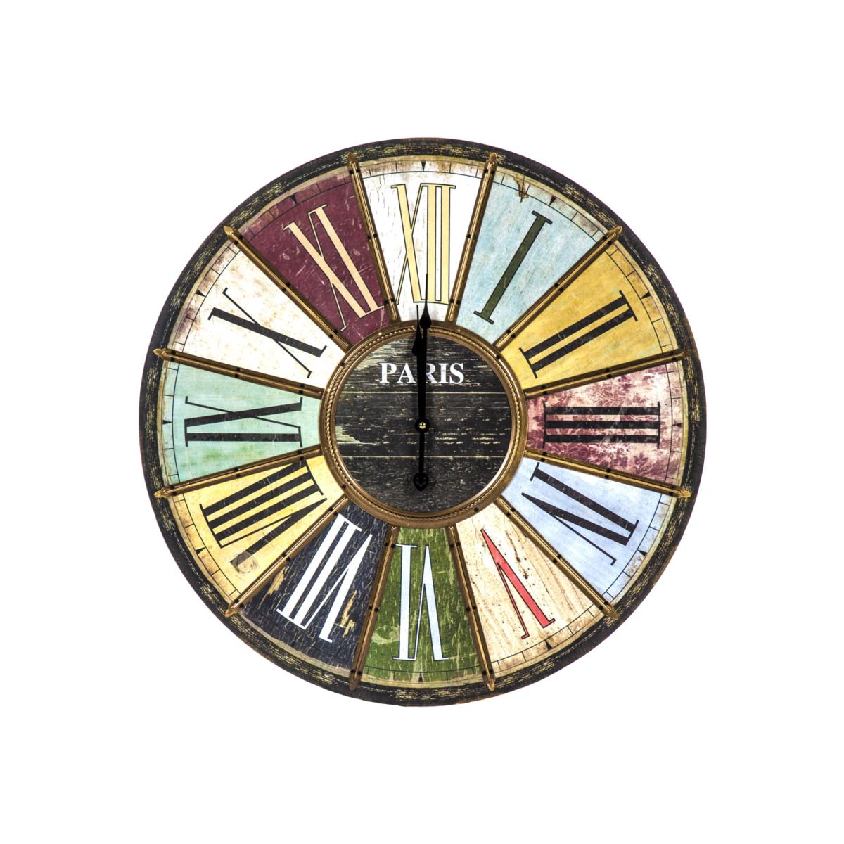 Bring Parisian style to your home with this eccentrically bright Paris Colourful Clock, featuring Roman numerals and brass-toned partitions. The distressed paintwork atop its rustic wood base gives the appearance of a French antique, adding a wonderful splash of colour to any wall of your home.