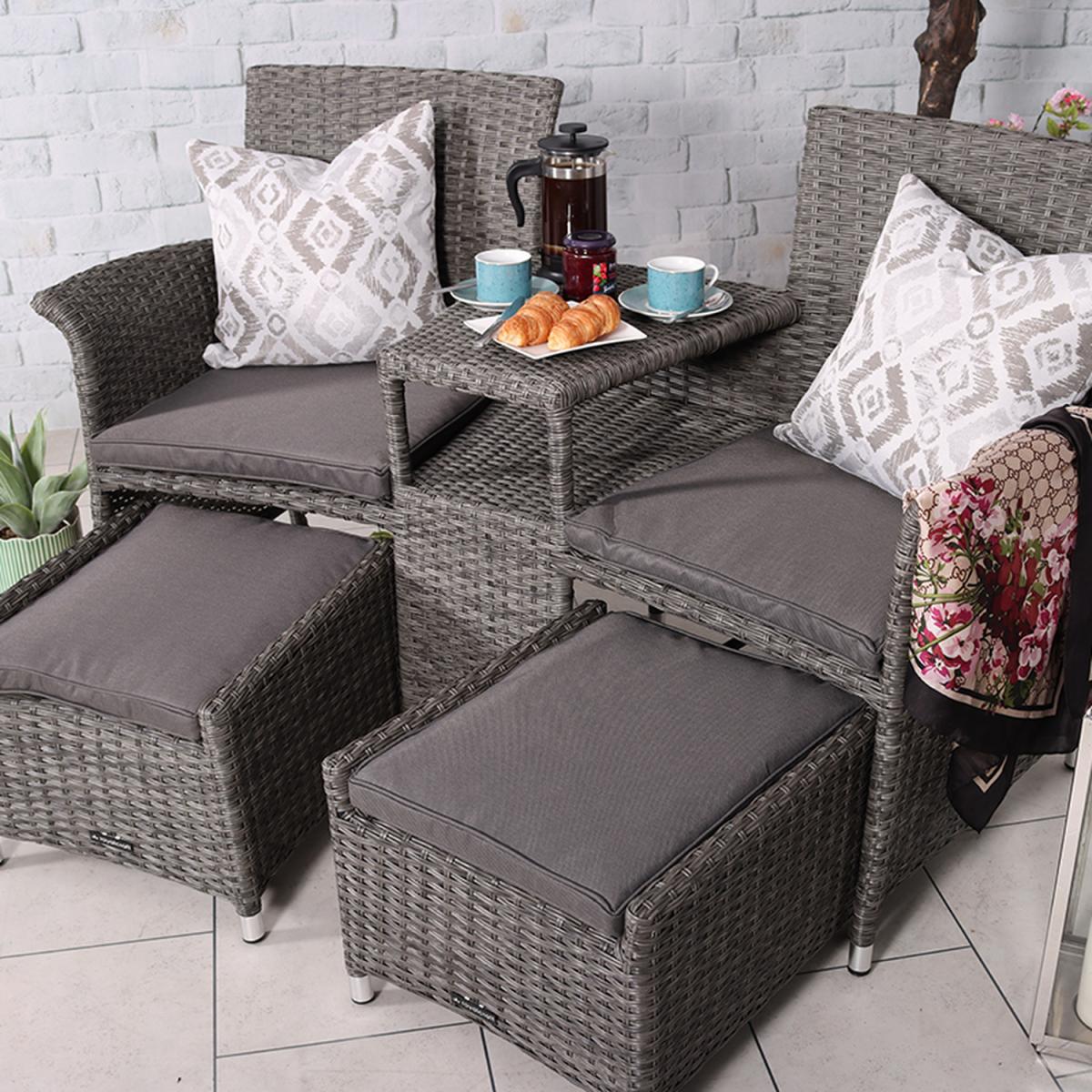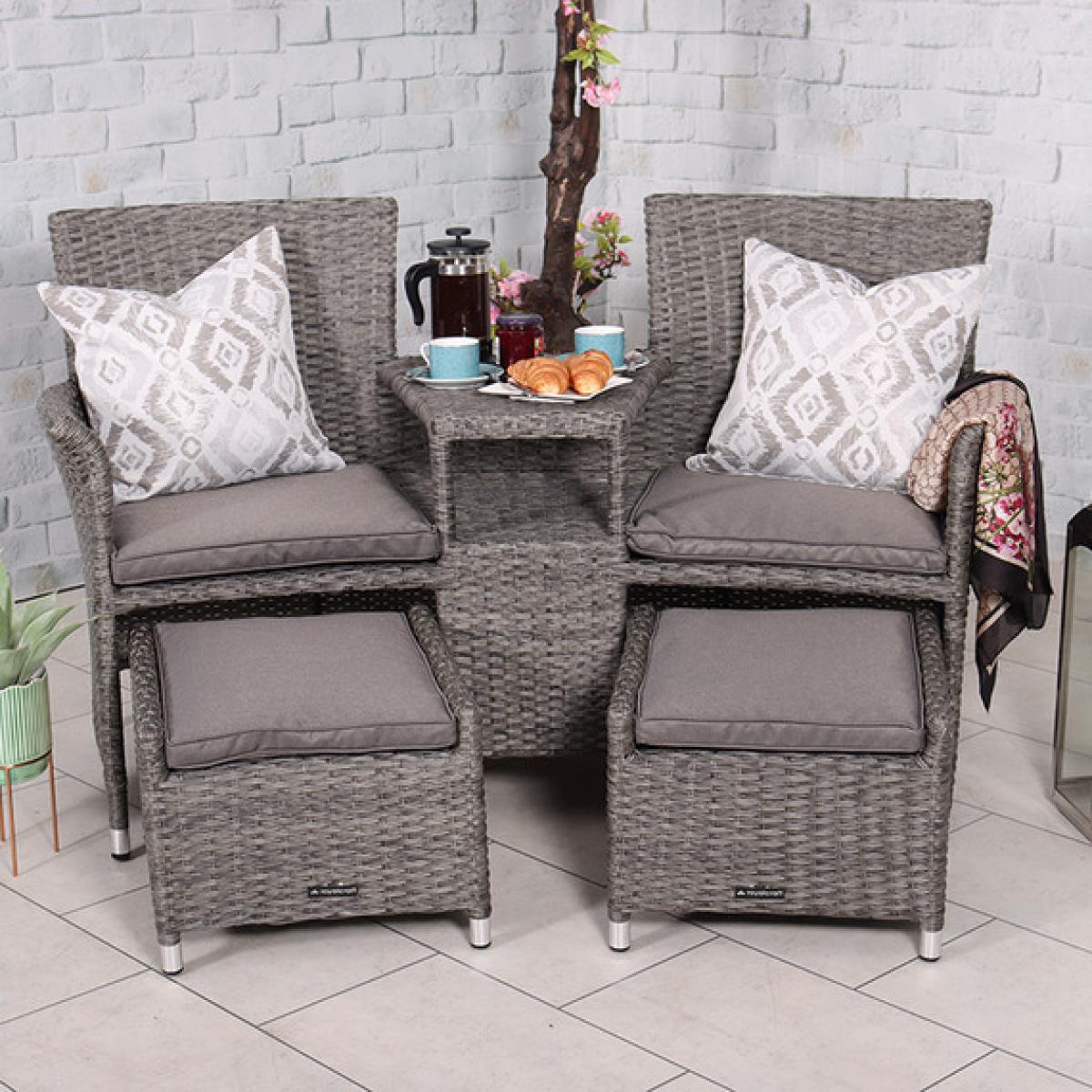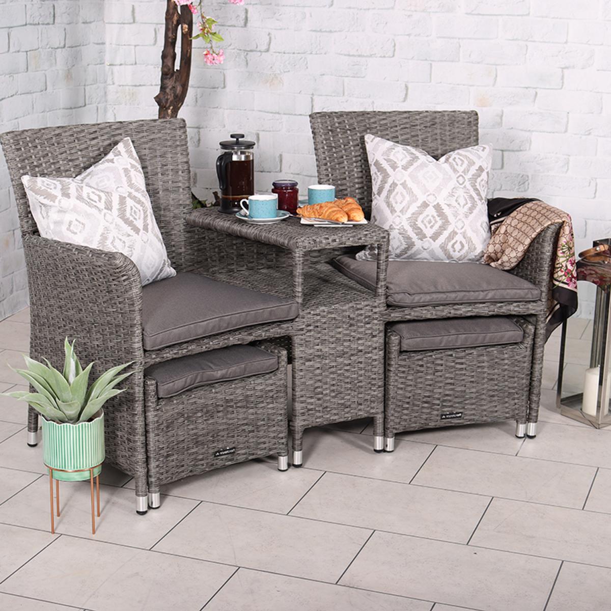 The Paris fixed companion set is perfect for sitting and relaxing in any outdoor space with its timeless design and practicality. Retaining classic style with its aluminum framework and hand woven, synthetic double half round rattan weave, it offers style, comfort, strength and durability. Complete with two pullout footstools including weather shield cushions, that store away compactly into the chair, it is perfect for relaxing afternoons in the sunshine.