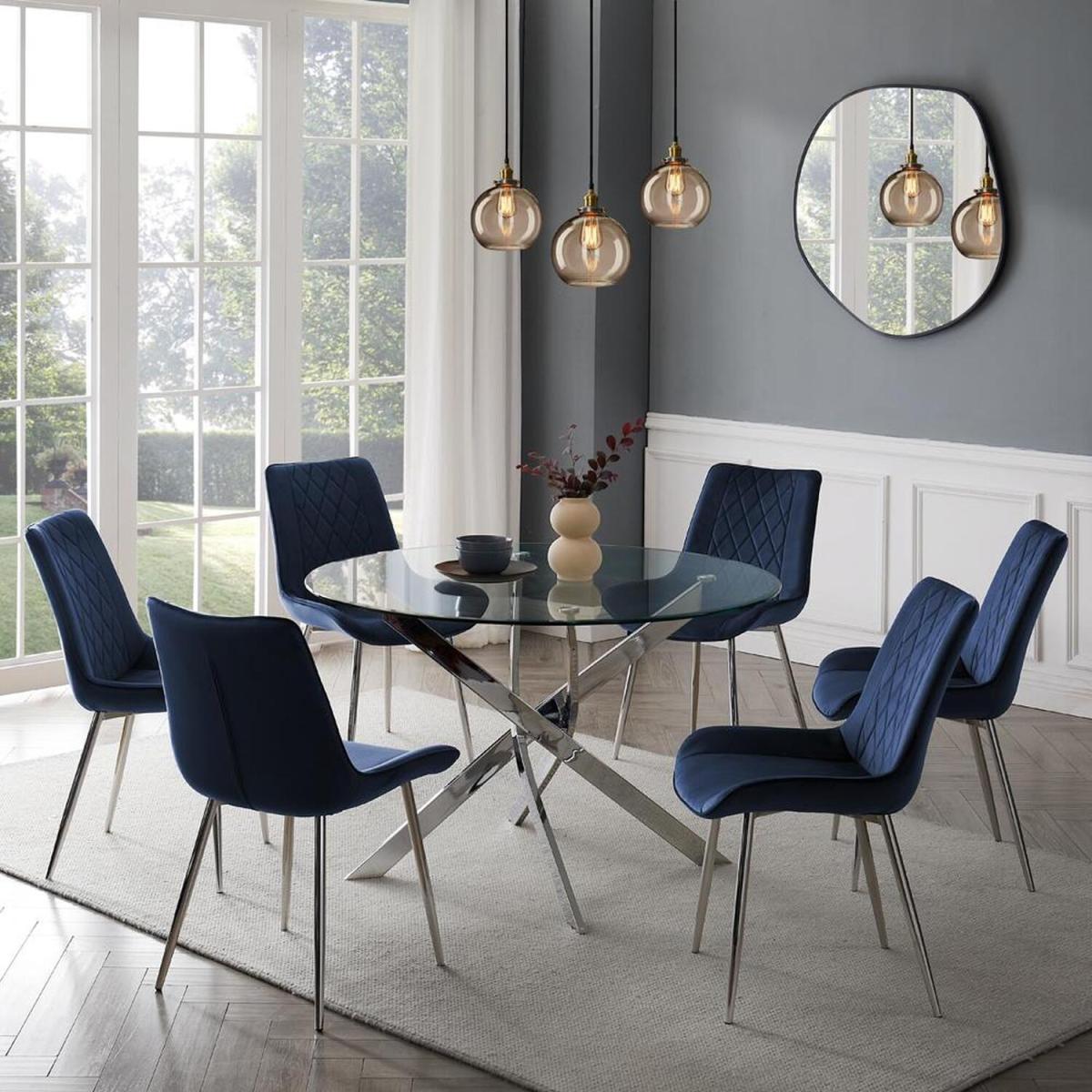 We are introducing the Paris dining table set. Paris has a round clear tempered glass tabletop available in 100cm diameter size, suitable for up to 4 people, and 120cm diameter size ideal for up to 6 people and features stunning twisted star-shaped silver legs. Glass is a classic elegant look for any dining room as well as being durable, safe and easy to clean. The Paris blue velvet chair features diamond quilted stitch detailing on the backrest and seat, and with a sleek armless silhouette, it stands on silver legs. Overall Dimensions: 4 Seater Table:W100cm x D100cm x H75cm / Weight Capacity 60kg 6 Seater Table:W120cm x D120cm x H75cm / Weight Capacity 60kg Chair (each): W54cm x D63cm x H84cm / Seat Width 55cm / Seat Depth 44.5cm / Seat Height 48cm / Back Height 36cm / Weight Capcity 150kg Package Dimensions: 4 Seater Table:Box 1 W111cm x D110cm x H6cm / Box 2 W106cm x D16cm x H11cm / Total Packaging Weight 30kg 4 Dining Chairs: Box 1 W67.5cm x D65.5cm x H57cm / Box 2 W67.5cm x D65.5cm x H57cm / Total Packaging Weight 29kg 6 Seater Table:Box 1 W130.5cm x D130cm x H6cm / Box 2 W128cm x D20cm x H11cm / Total Packaging Weight 40.8kg 6 Dining Chairs: Box 1 W67.5cm x D65.5cm x H57cm / Box 2 W67.5cm x D65.5cm x H57cm / Box 3 W67.5cm x D65.5cm x H57cm / Total Packaging Weight 43.5kg All sizes and weights are approximate, please allow for small variations. Delivered by our friendly couriers on a 2-man delivery service within 3-7 working days. The courier will deliver to a room of your choice.