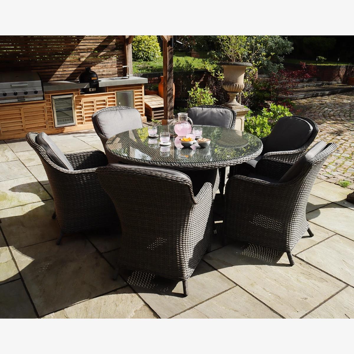 Paris 6-Seater Set. The Paris 6 seater dining set comes complete with 6 imperial dining chairs, with a weather shield seat and back cushions and a floating, tempered glass top table with a built-in parasol hole. It is the perfect setting for outdoor lunch or to dine and relax with a drink. Made from the highest quality polyethylene double round wicker around a rigid aluminium frame it's durable and weather resistant, making this set the ideal choice for dining with family and friends.. Having a garden, or any kind of outdoor space, is a real privilege ‚ and one which should be maximised to ensure it is not taken for granted. If you are lucky enough to have a bit more space to play with, like a generous patio, creating different zones can help you make the most of it. Of course, lots of variations to choose from but, ultimately, having an area for alfresco dining will suit most needs.. Setting up an outdoor dining room is a garden goal. This will provide a delightful place to host lunches and dinners, and it's sheer heaven to eat breakfast outside on a spring and summer day. Whether you opt for an outdoor dining garden furniture set which boasts a dining table and armchairs for a smart, cohesive look or a table set with foldable, stackable or reclining seats for practicality and space-saving. We have many dining garden furniture sets available from a range of materials such as rattan, rope effect, aluminium, responsibly sourced wood and 100% recyclable plastic.. The Paris Range. The Paris range is made using a slate grey double half-round synthetic rattan, which makes this one of our premium collections. Cleverly hand-crafted onto strong rust-proof aluminium frames, making this range ideal for long-term use. To accompany the Paris rattan dining sets, we offer matching rattan lounging, relaxing and storage options.. Features:. Product Material: Synthetic Rattan. Main Colour: Grey. Cushion Colour: Grey. Rust Proof Aluminium Frame. Shower and stain-resistant cushions included. Compliments any outdoor patio or decking space. The set includes:. 1 x Round Table (with tempered glass top). 6 x Imperial Dining Chairs. 12 x Weather shield cushions. Please note: Colours may vary slightly from those shown. Variations can occur due to the natural characteristics of materials (such as wood, fabric, or rattan), as well as differences in screen resolution and lighting when viewing images.