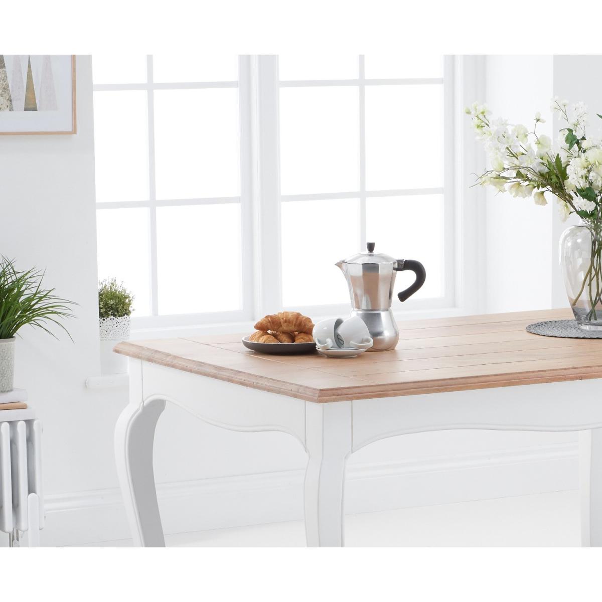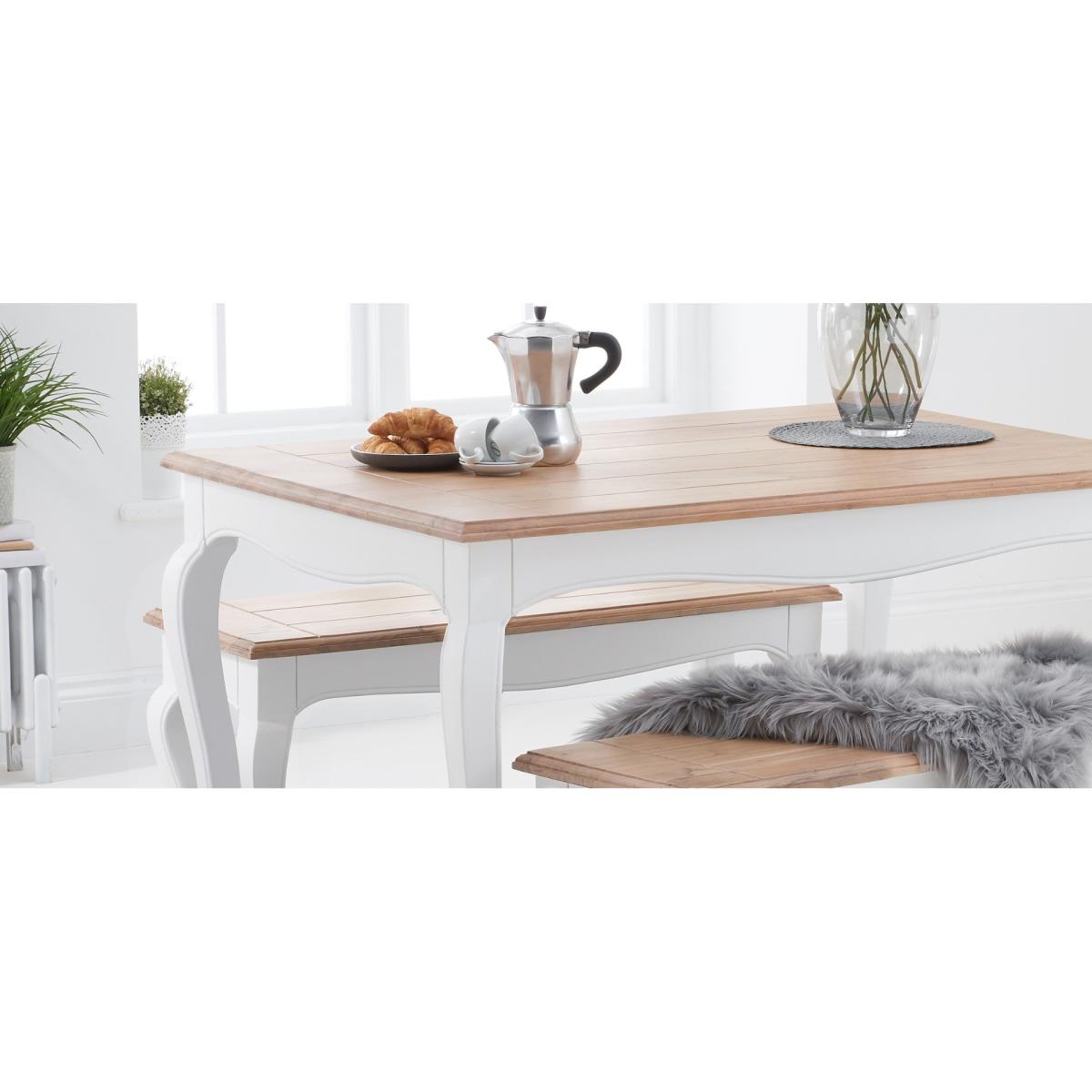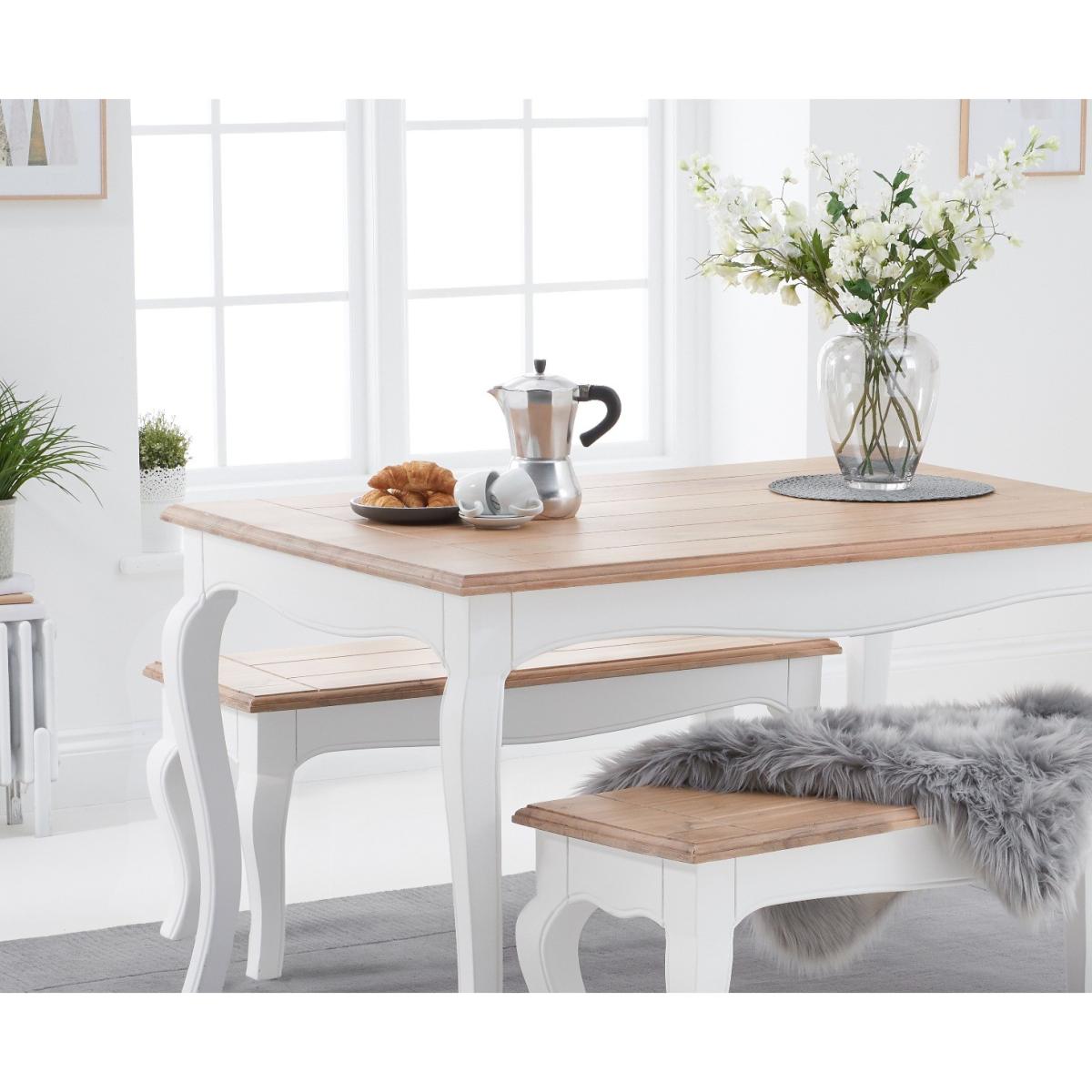 Elegant and opulent, the Parisian 130cm Shabby Chic Dining Table has an undeniable style that will impress upon any dining area. Perfectly practical, the 130cm dining table comfortably seats 6 people, making it ideal for enjoying everyday meals and intimate dining occasions. The Parisian has been expertly crafted from naturally strong acacia and finished with shabby chic distressed white paintwork to the curved legs. The table has a beautifully baroque look to it that will enrich the ambience of any occasion. The Shabby Chic Dining Table is complemented by matching Parisian Benches that are complete with white paintwork, elegantly curved front legs and a natural acacia seat. Further Items in the Collection:Parisian 175cm Shabby Chic Dining Table with Chairs, Parisian 175cm Shabby Chic Dining Table with Benches, Parisian 130cm Shabby Chic Dining Table with Chairs, Parisian 90cm Shabby Chic Dining Table with Chairs and Parisian Shabby Chic Sideboard