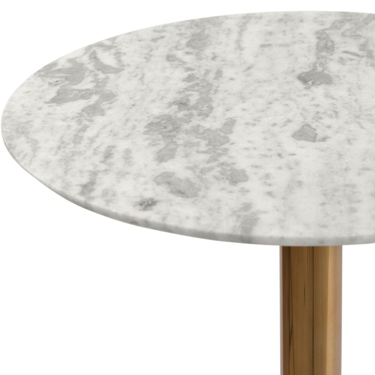 A timeless, classic side table. Weighted spun aluminium base with brass finish. Solid marble top with painted wooden support to the underside. Simple assembly required. Due to its natural formation, every piece of marble is unique, there may be subtle differences in colour, tone and composition from the image shown. On occasions fissures may be present, these are natural characteristics and do not compromise the marble’s structural integrity. Wipe with a soft, dry cloth - avoid using chemical-based cleaners as these could damage the finish.