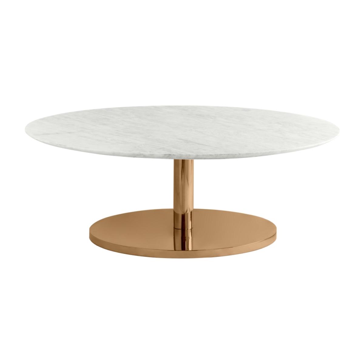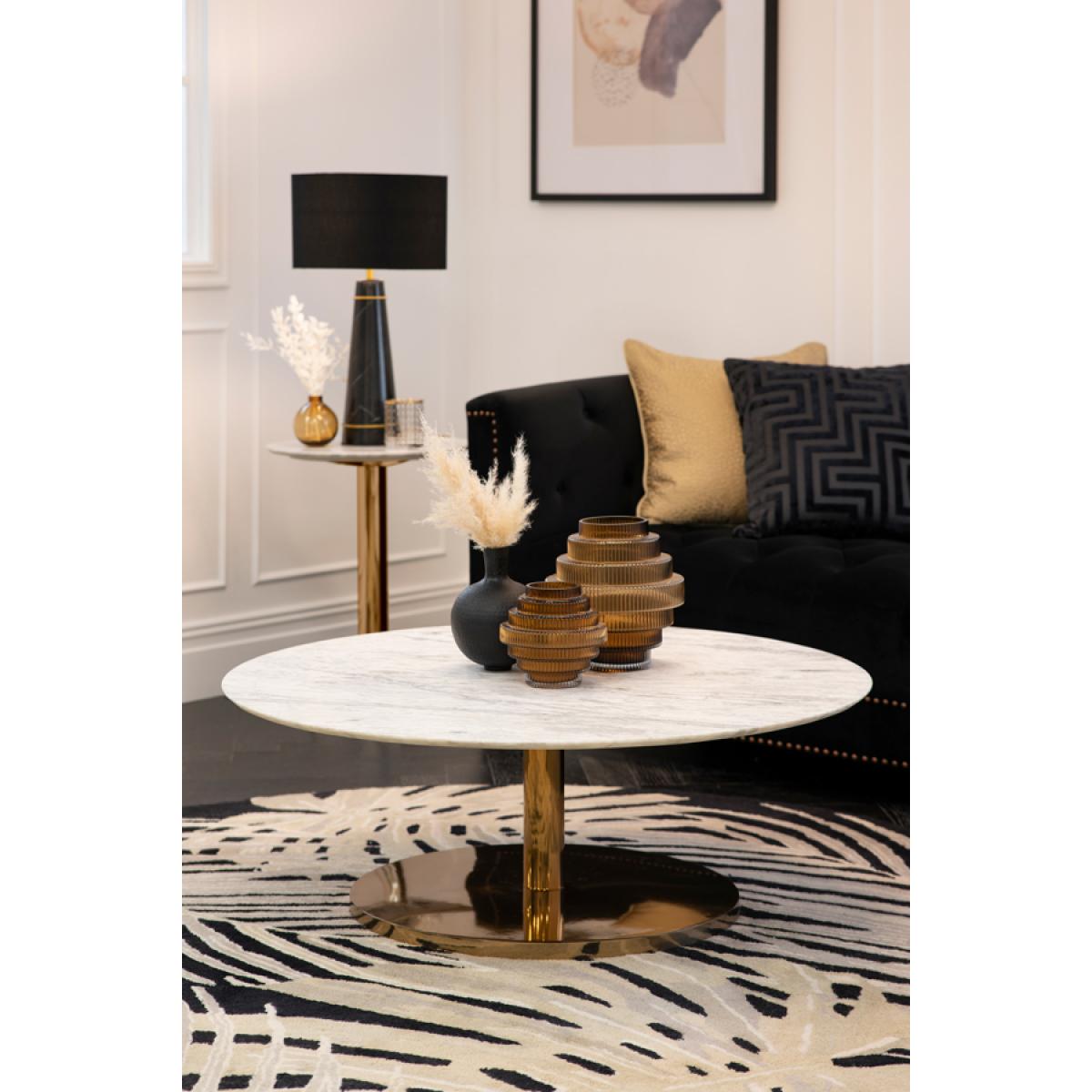 A timeless, classic coffee table. Weighted spun aluminium base with brass finish. Solid marble top with painted wooden support to the underside. Simple assembly required. Due to its natural formation, every piece of marble is unique, there may be subtle differences in colour, tone and composition from the image shown. On occasions fissures may be present, these are natural characteristics and do not compromise the marble’s structural integrity. Wipe with a soft, dry cloth - avoid using chemical-based cleaners as these could damage the finish.