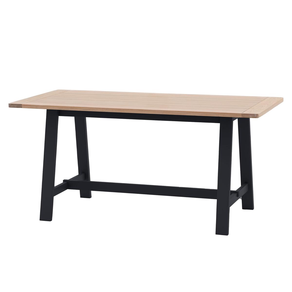 A modern take on a country style dining table, this rectangular trestle table features a grooved & planked oak top with the angular hand painted solid timber legs. Pairs perfectly with the coordinating bench or dining chairs. Material:Oak / Pine / MDF. Colour/Finish: Meteor. Table Shape: Rectangle.
