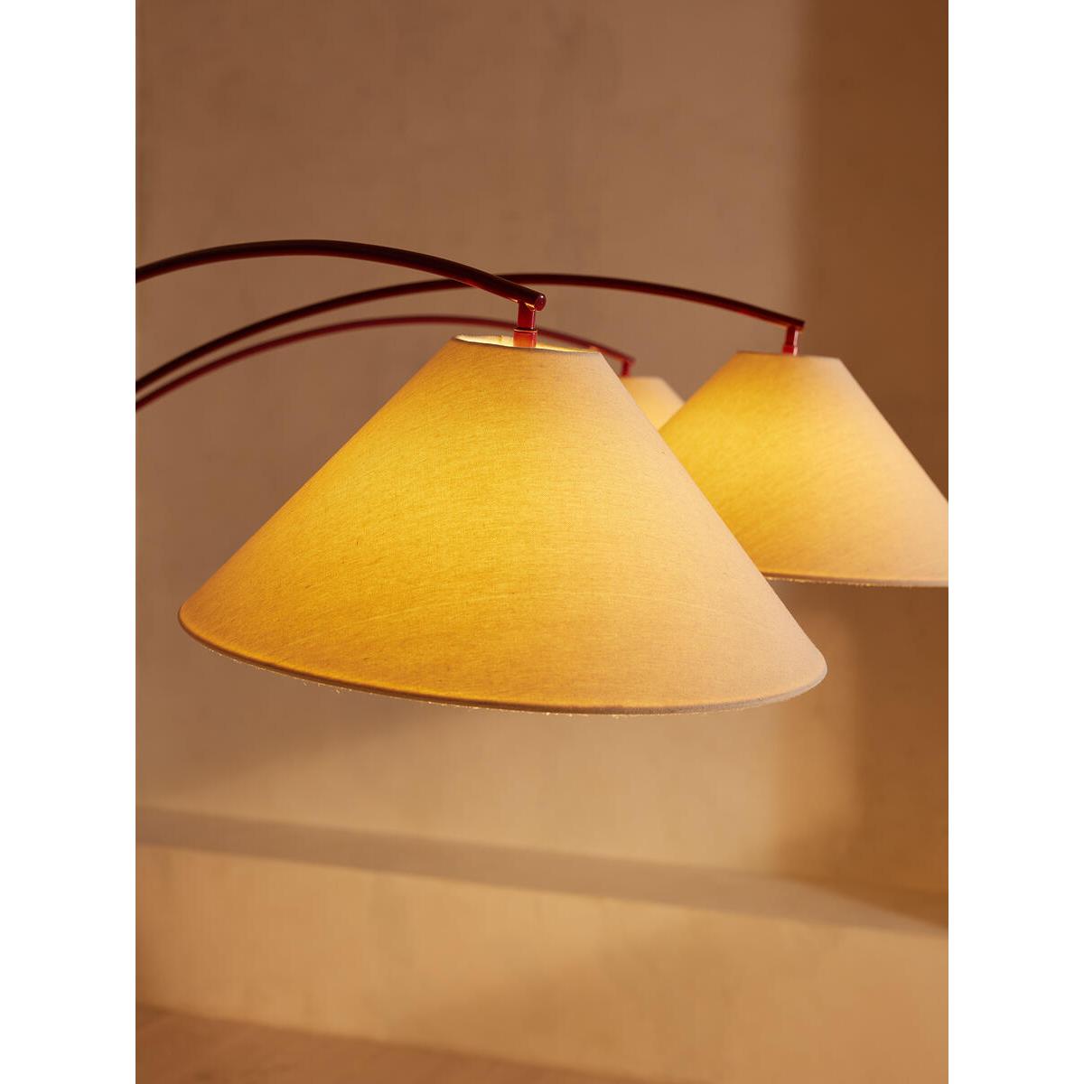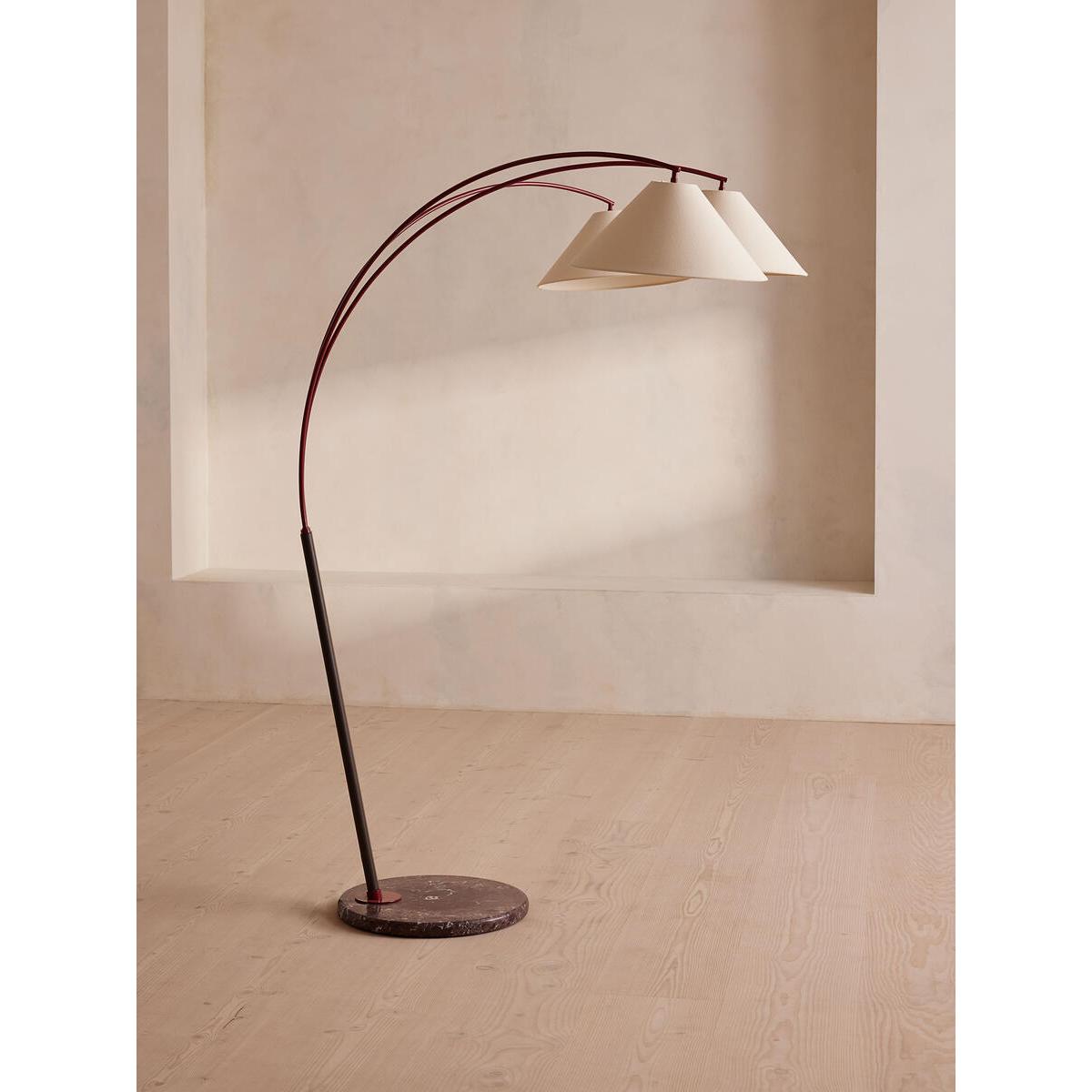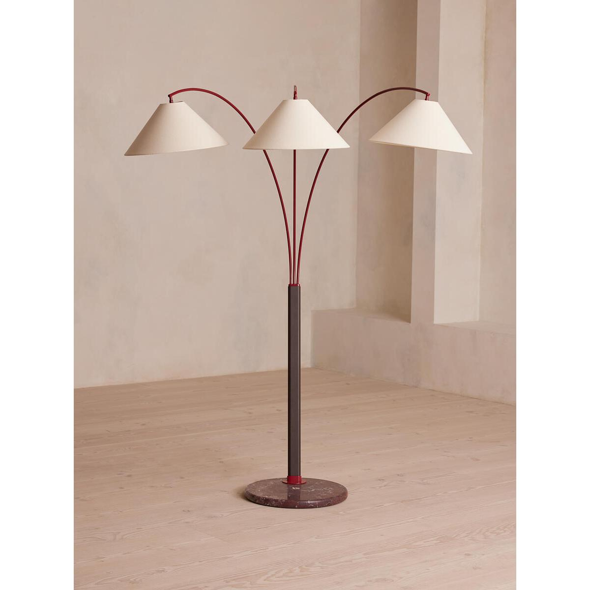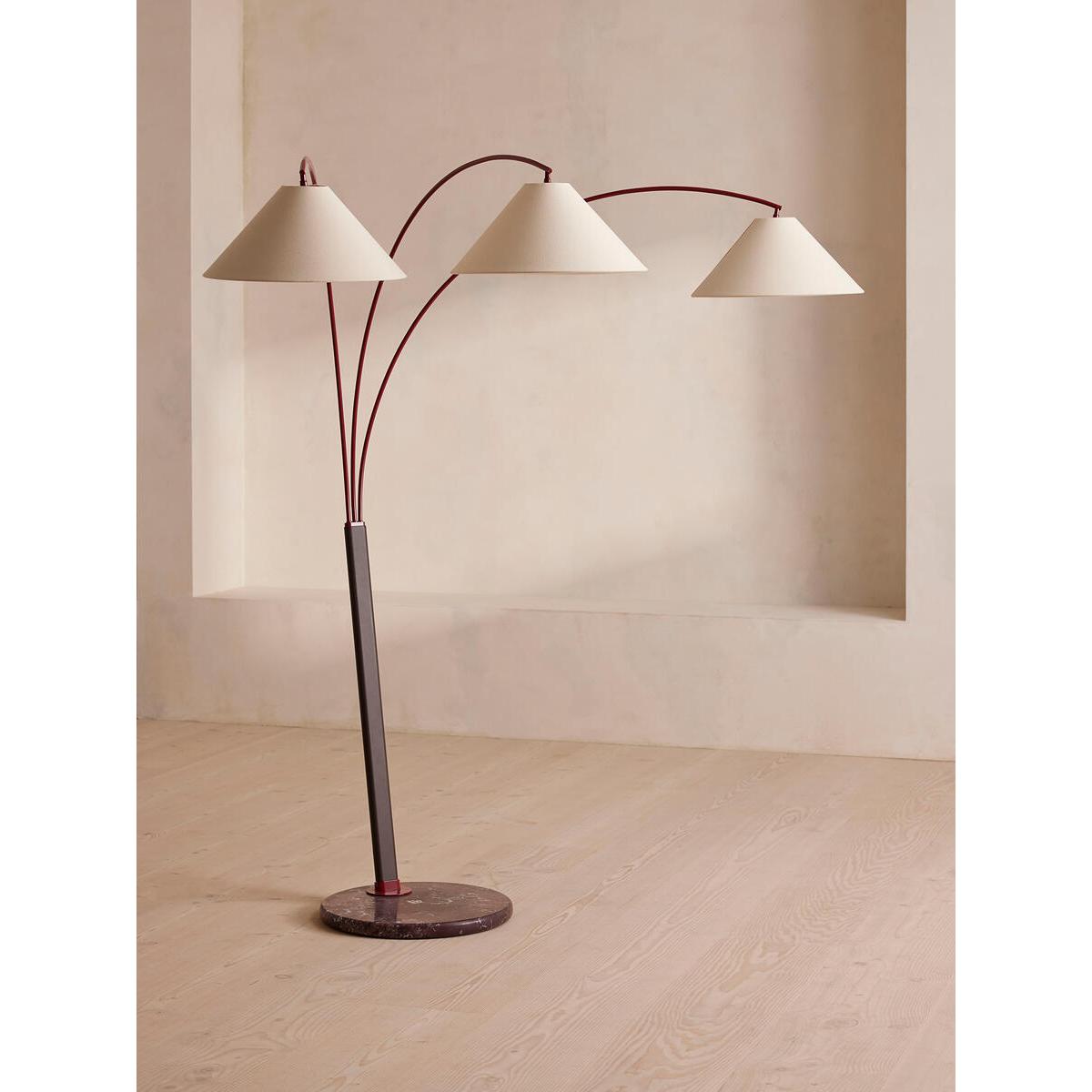 The Parker lamp is designed to be a focal point in any room. Inspired by the 1960s interiors of White City House, a multi-head arched frame has been given a red lacquered finish for a touch of colour, with three diffused cream linen lampshades that can be removed for a brighter light setting. Adjustable arms allow this light to adapt to your living space, anchored by a honed Rosso Levanto marble base. Multi-head floor lamp Honed Rosso Levanto marble base Deep red to black with white veining Natural variation in the stone means no two are the same Red lacquered frame Three diffused linen lampshades Recommended bulb:Tala 6W Globe LED Inspired by White City House