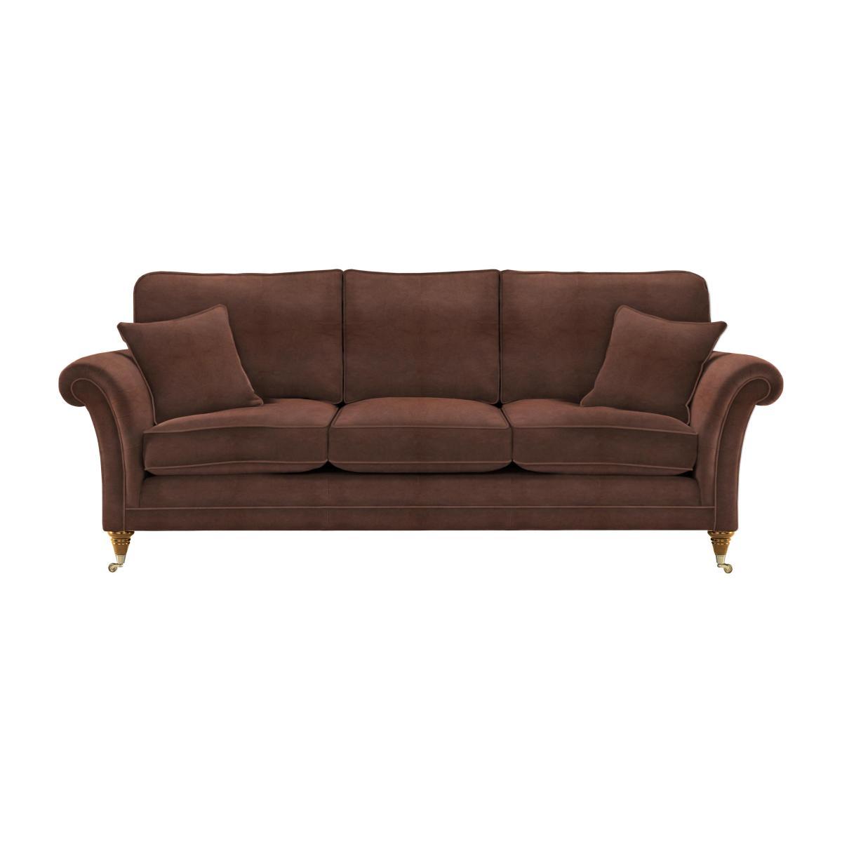 The Burghley grand leather sofa makes an impression not only with its large- scale design but with its comfy 100% natural leather upholstery. Made in Britain, this is timeless style at its finest. Why you'll love it Classic British grand leather sofa. Sweeping scroll arms in 100 % buttery- soft natural leather. Generously plumped high back for maximum comfort. In a choice of stylish colours. Turned wood feet in a choice of finishes with polished brass castors. Comes with two scatter cushions to complete the look. Also available in finely- tailored fabric. British style made in the UK. What you need to know This grand leather sofa has a medium comfort level. Removable and reversible seat cushions. Encore fibre seat cushions. Elasticated webbing. Zig- zag seating suspension. Please read our upholstery care guide for more advice. Part of the classic Burghley range of sofas and chairs in fabric and leather.