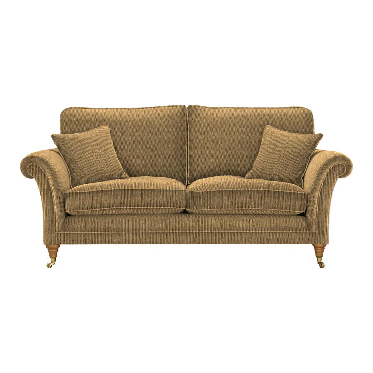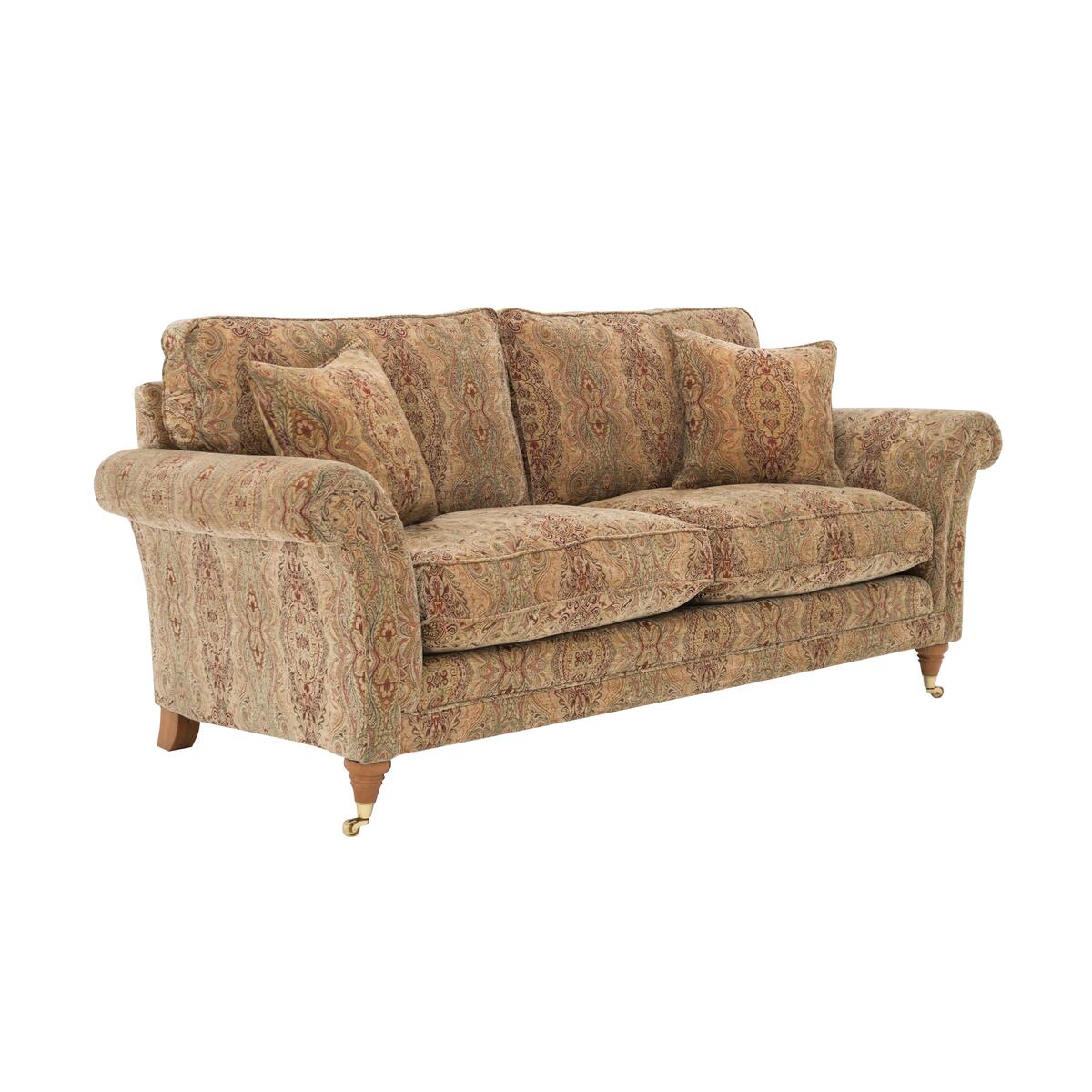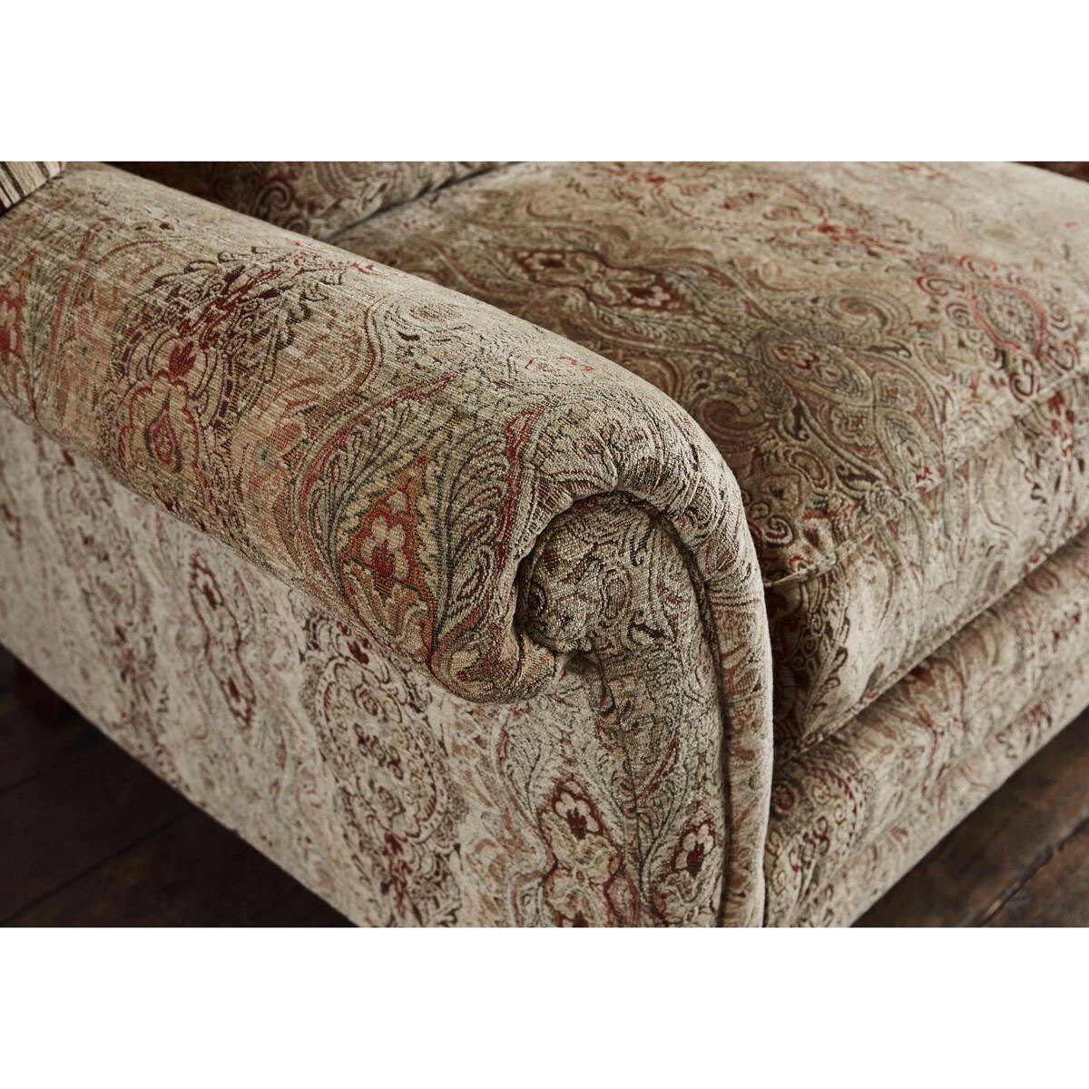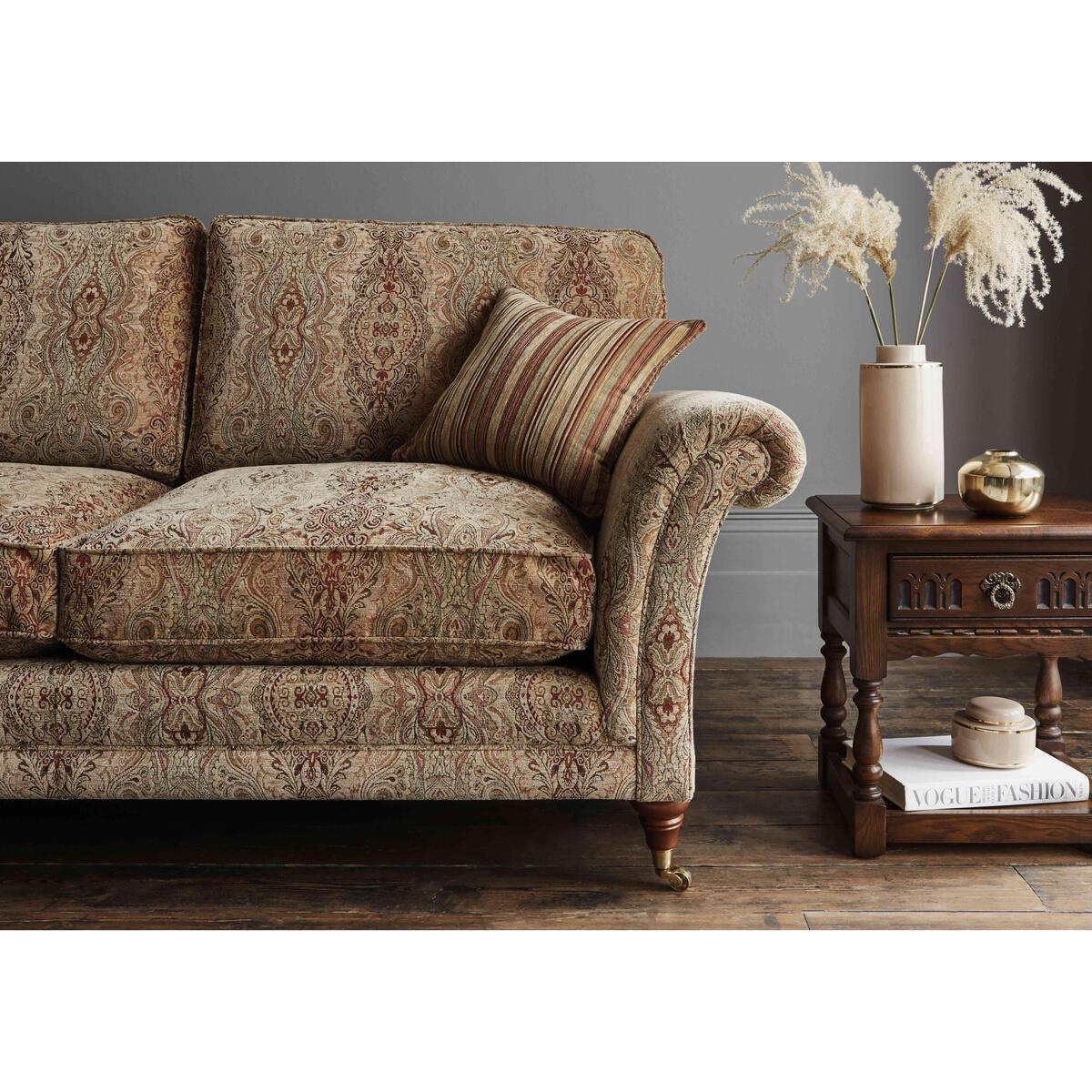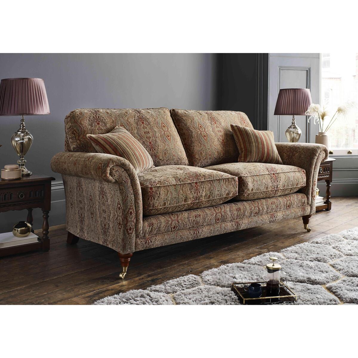 Parker Knoll has been renowned for British quality and craftsmanship for 130 years. The Burghley collection exemplifies this tradition, boasting classic silhouettes, beautiful fabric upholstery and exquisite detailing. The formal high back design employs elasticated webbing for wonderful posture and support while the seat cushions are filled with encore fibre to maintain their shape. A zigzag seating platform ensures a long lasting and comfortable seat for many years. Wood feet in a choice of colours with polished brass castors add the finishing touch to each classic piece. Crafted according to time-honoured methods, the Parker Knoll Burghley large 2 seater sofa offers classic British sofa style. Parker Knoll has been creating wonderful upholstered pieces for over 130 years, and this larger than average two seater sofa is no exception. It features a formal high back and finely-tailored fabric upholstery that’s available in a wide range of patterns and colours. The removable and reversible seat cushions are filled with resilient encore foam, ensuring that your Parker Knoll sofa is always as comfortable as the day you brought it home. Sweeping scroll arms, turned wood feet in a choice of finishes with polished brass castors and two scatter cushions complete the look of this elegant and spacious sofa. The British-made Parker Knoll Burghley large 2 seater sofa is part of the Parker Knoll Burghley range, a well-curated collection of three sizes of sofa, an armchair and a large footstool.