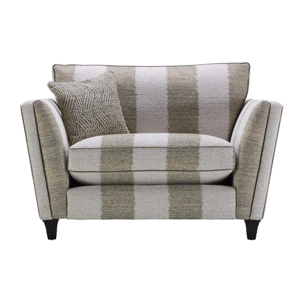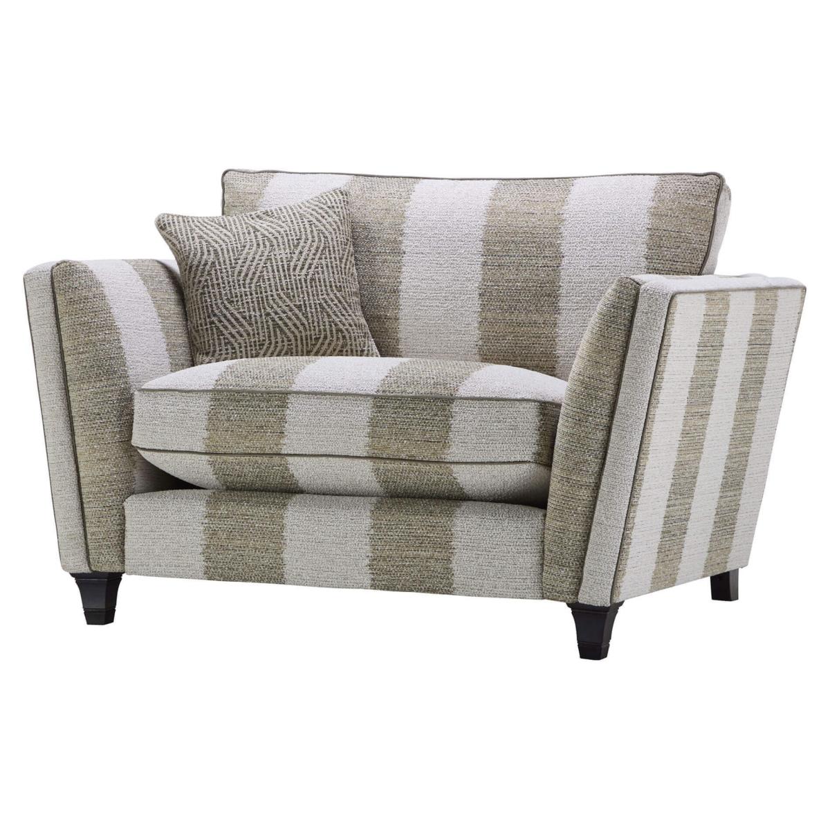 The Parker Knoll Harlow Fabric Snuggler Chair brings together classic sophistication and superior comfort, making it a standout piece in any home. Upholstered in premium-quality fabric, this beautifully tailored snuggler features graceful curves, refined piping details, and deep, indulgent seat cushions for a truly luxurious seating experience. With its sumptuous comfort and exquisite craftsmanship, the Harlow Fabric Snuggler is a timeless investment, perfect for those who appreciate classic design and luxurious materials. Whether as a standalone statement piece or paired with the Harlow collection, it offers unmatched style and comfort. KEY FEATURES: Premium Upholstery – Crafted from the finest materials for a rich, timeless look and long-lasting durability. Tailored Elegance – Crisp lines, subtle tufting, and piping details add a refined touch. Unrivalled Comfort – Deeply cushioned seat and supportive backrest provide all-day relaxation. Customisable Finish – Choose from a selection of castor leg options and wood finishes to complement your interior. Handcrafted to Perfection – Expertly made with a solid hardwood frame for superior stability and longevity. Foam seat cushions are standard, and the back cushions are fibre for that extra comfortable feeling. Beech feet are available in a choice of mahogany, cherry or teak with either chrome or brass castors. Seat and back cushions are loose and reversible. DIMENSIONS: Height: 92cm Width: 141cm Depth: 102cm Seat Height: 52cm Seat Width: 93cm Seat Depth: 58cm Arm Height: 74cm All screens vary in colour reproduction and whilst every effort has been made to display the colour as accurately as possible it is for guidance only. This image is only an indication of what the cover would look like and is not a true representation. You should always request a swatch sample.