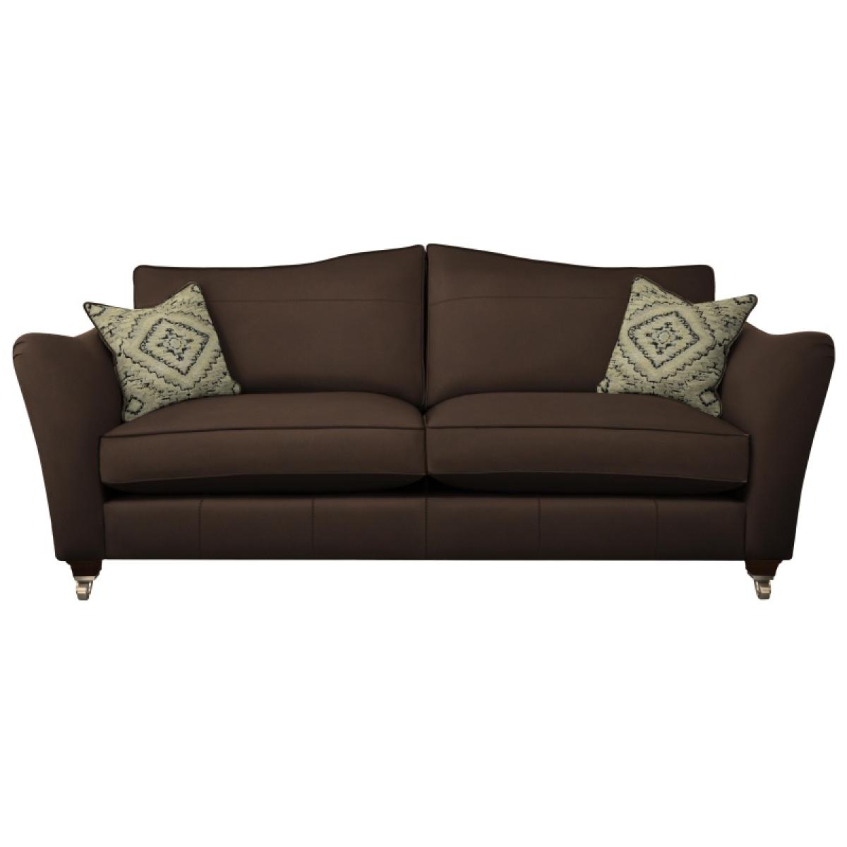 The Parker Knoll Harriet Grand Formal Back Leather Sofa is a refined and comfortable seating option, ideal for both traditional and contemporary interiors. This sofa features a formal back design, providing structured support and a classic silhouette. Upholstered in high-quality leather, it offers a soft and inviting texture, enhancing the overall comfort. Harriet is rich with elegant details, such as a gentle flowing shape, pleated arms, and a curvaceous back with sweeping cushions to mirror its shape. Designed to suit a regal setting, this classically beautiful statement piece transforms and elevates as it stands proudly within any living space. There are size options to suit all, and there is a choice of pillow or standard back sofa. A wide range of fabrics or leathers are available and new for Parker Knoll, selected pieces are available in a leather/fabric mix. KEY FEATURES: Design - Elegant scroll arms and a curvaceous back with sweeping cushions contribute to its timeless style. Craftsmanship - Handmade in Britain by Parker Knoll's expert craftsmen, ensuring high-quality construction. Customization - Available in a wide range of fabrics, with options for beech leg finishes in mahogany, cherry, or teak with chrome or brass castors Foam seat cushions are standard, and the back cushions are fibre for that extra comfortable feeling. Seat and back cushions are loose and reversible. Scatters are feather filled and provided with each piece, excluding the chair. 25 year frame and frame assembly guarantee DIMENSIONS: Height: 95cm Width: 227cm Depth: 100cm Seat Height: 52cm Seat Width: 183cm Seat Depth: 58cm Arm Height: 73cm All screens vary in colour reproduction and whilst every effort has been made to display the colour as accurately as possible it is for guidance only. This image is only an indication of what the cover would look like and is not a true representation. You should always request a swatch sample.